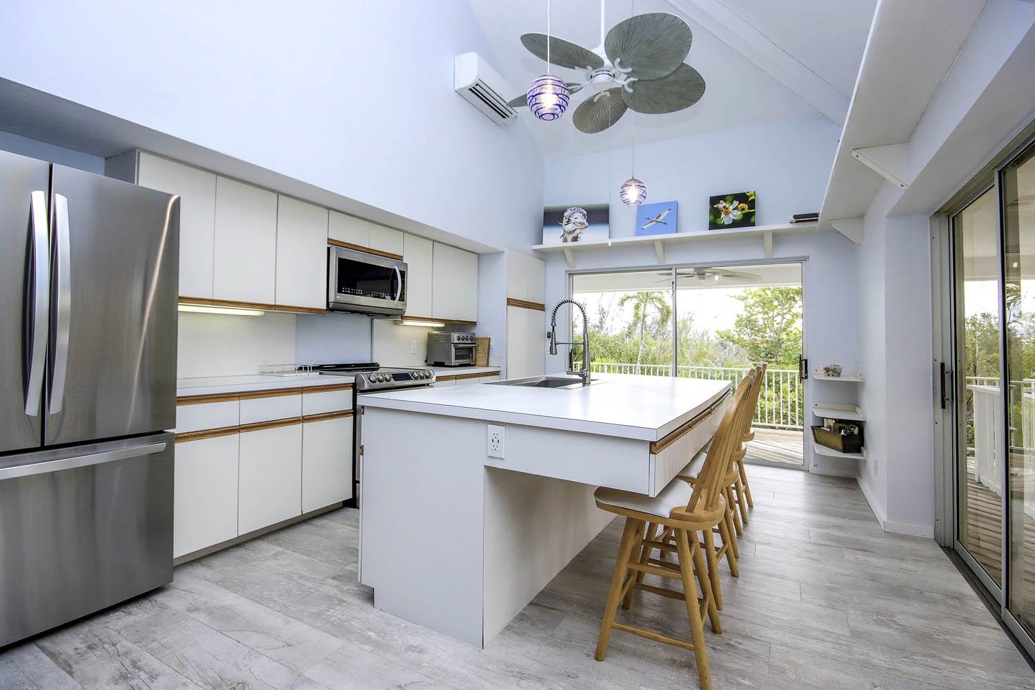 Driving up to this property you immediately notice the brick paved park-like road. It leads to a secluded 3 bedroom, 2 bath home on an oversized lot that resembles a botanical garden. Blooming hibiscus, ginger, jasmine and fragrant gardenia surround this raised home on the sought after east end. As you enter the open living and dining room with raised, beamed ceilings you are greeted by a wood burning fireplace all nestled next to an open kitchen with granite counter tops and new appliances, including an induction stove that cooks like gas. Deeded beach access a short walk away, 10,000lb boat lift and a private kayak launch flank a beautiful heated pool and spa with outdoor grill area. A large open-covered deck overlooking pool and mangrove lined canal plus roof top solar panels tied to the grid where the electric company pays you for electricity. This home is truly one of a kind.