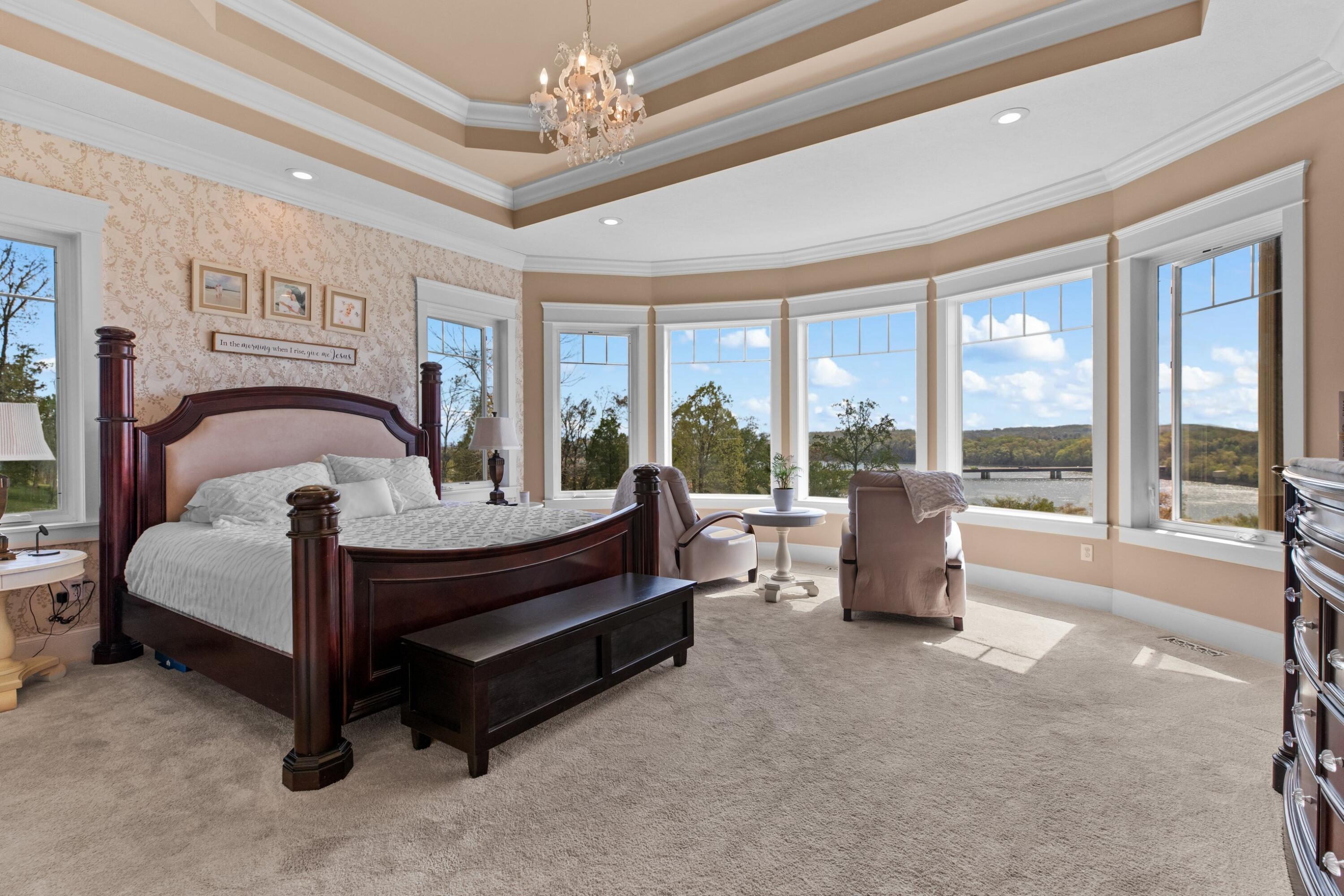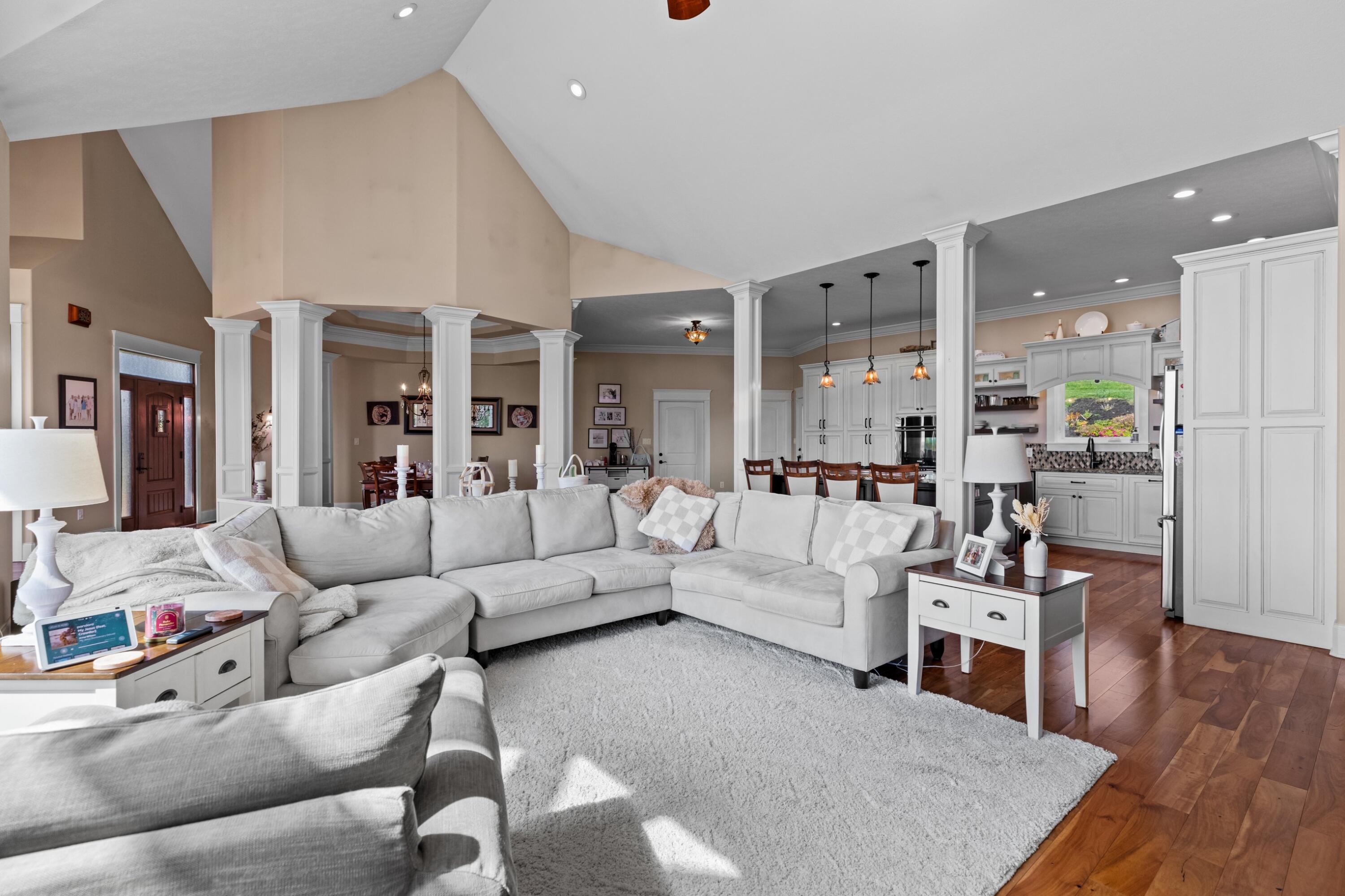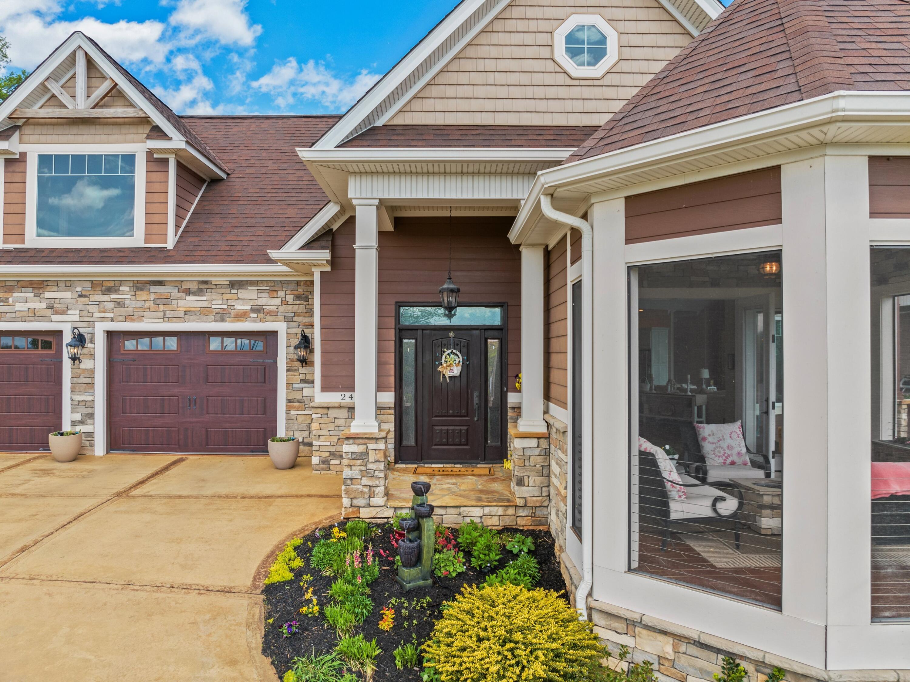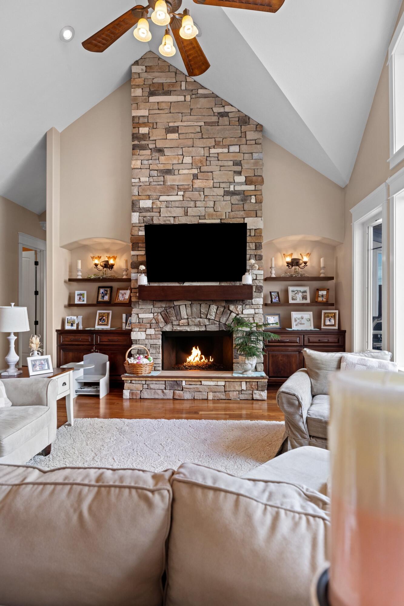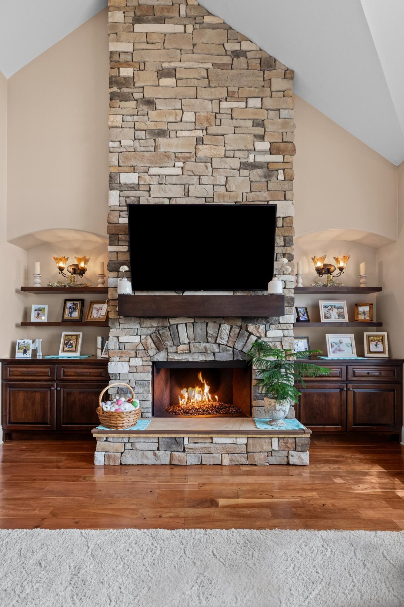 Excellent custom built home with year round lakefront water. 4 bedrooms and 4.5 baths with primary en-suite on main level along with an office, vaulted ceilings in living room with beautiful stack stone gas fireplace and built in bookshelves on each side.