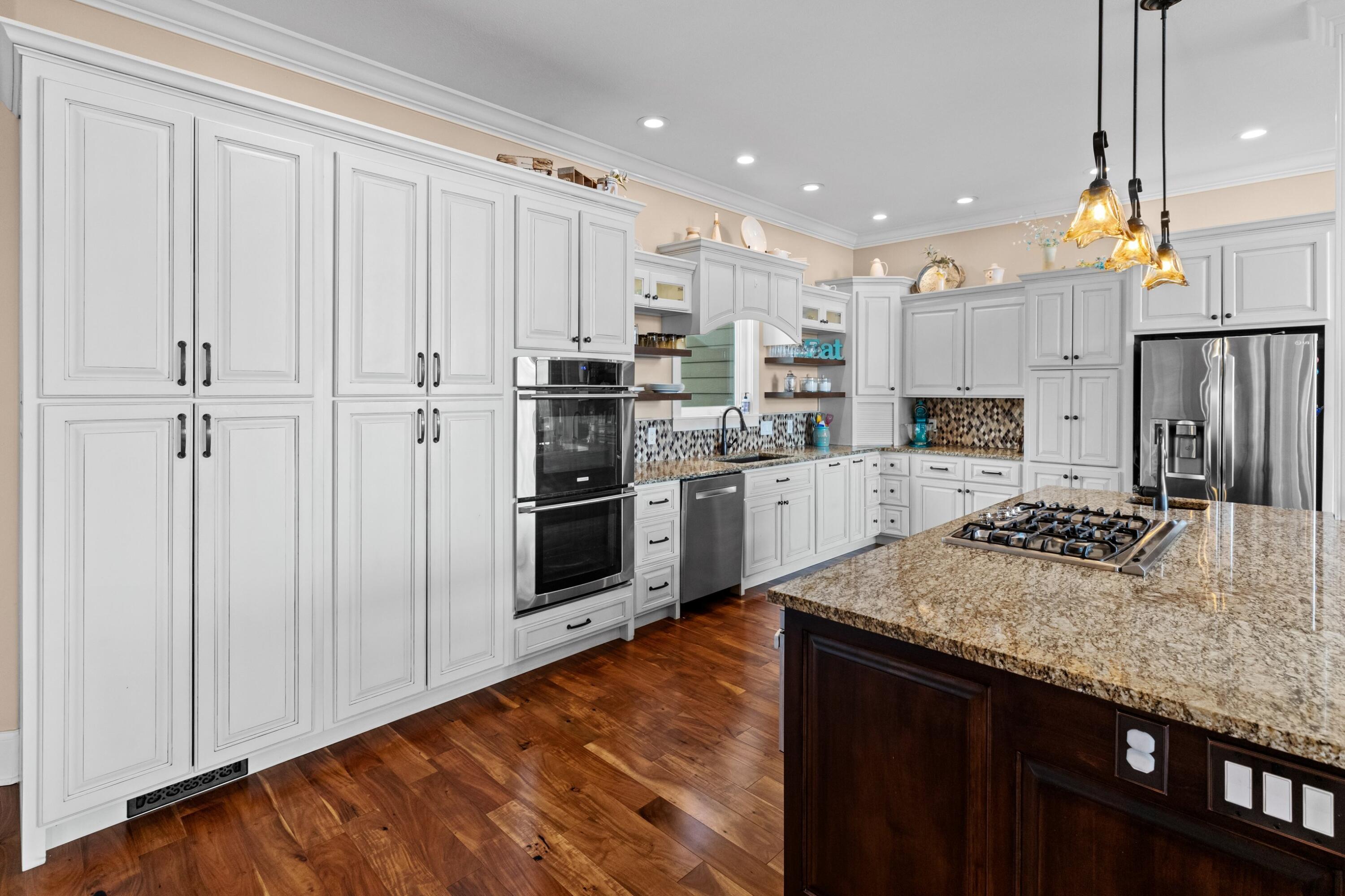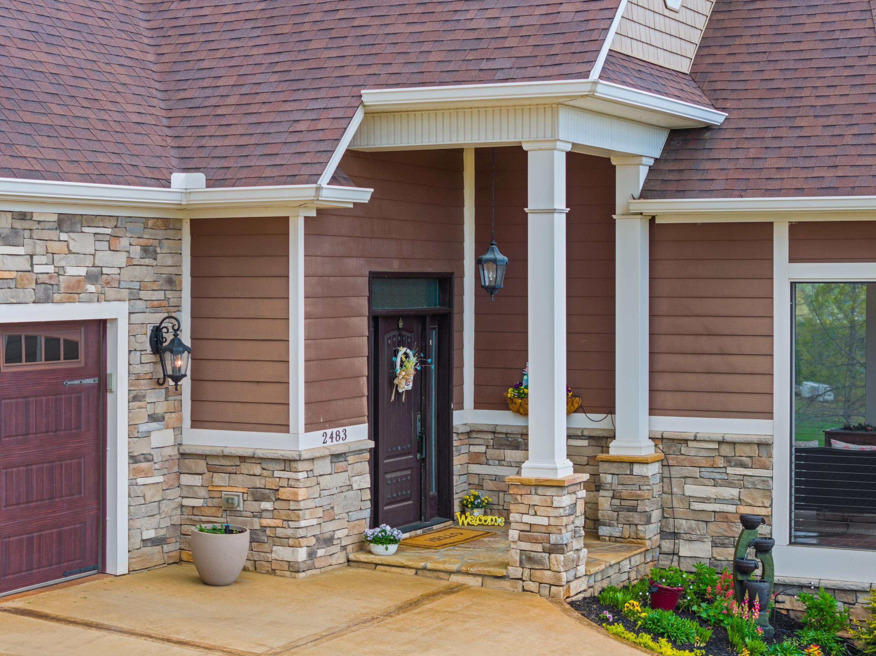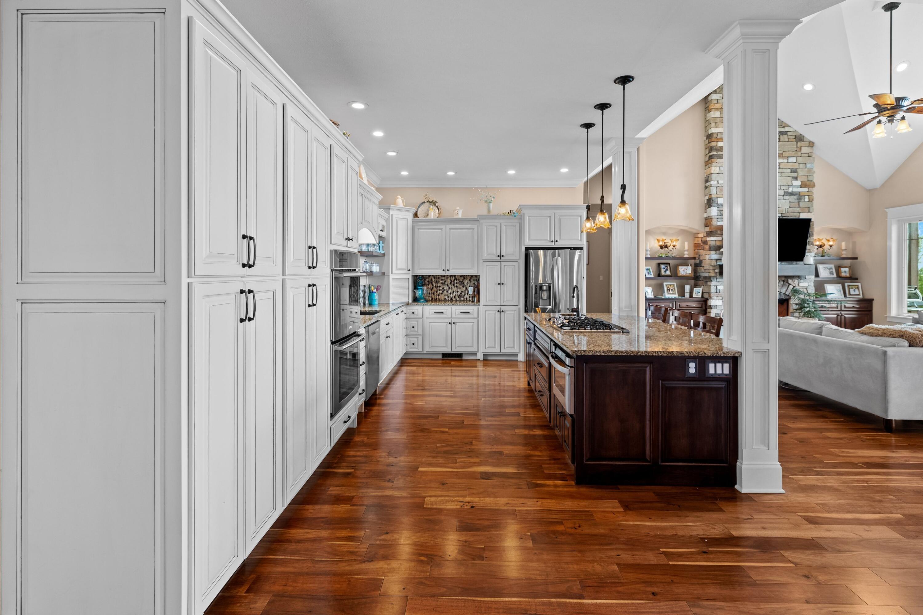 Beautifully maintained home on over a quarter of an acre in Bridgewater Pointe. Brick, stone, shake siding exterior with metal roof. Covered front porch for rocking and covered back patio for relaxing and entertaining. Primary en-suite on main with spacious living room, kitchen and dining area. Granite countertops in kitchen and baths. Island in kitchen and stainless appliances.