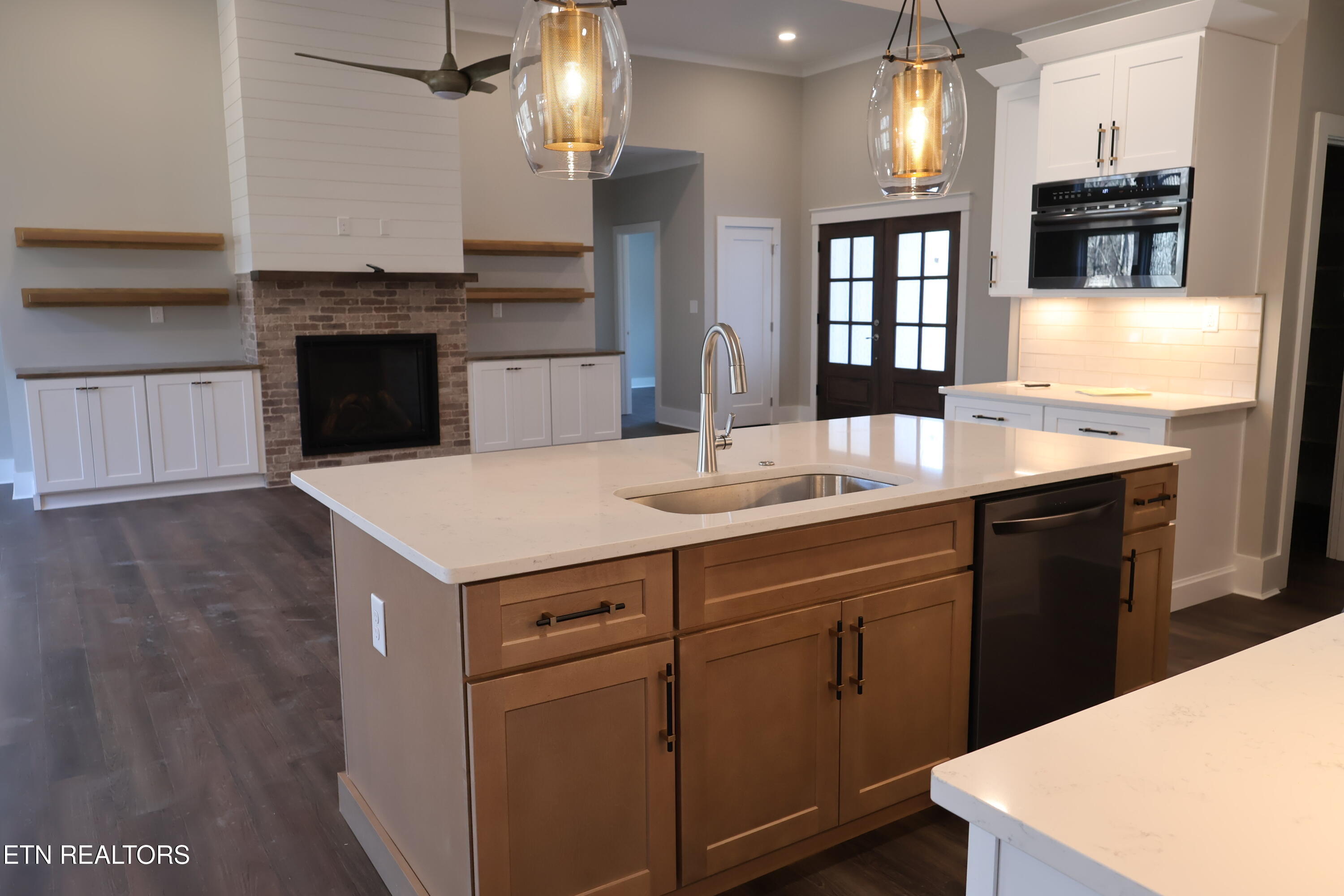 This is truly an AMAZING Home . Exquisite features. Beautiful quiet .46 acres cul-de-sac lot. Curb Appeal off the chain. Covered Front porch with Stone Surround and a gorgeous Double Door Entry. Professional landscaped front flower beds. Upon entry a beautiful foyer. Large Dining Room with Tray Ceiling. Huge Living Rm open to Kitchen and Breakfast nook. Living RM has a Black-Stacked Stone Gas Log Fireplace with Floating Accent Shelves, with Lower Cabinets. Vaulted Ceiling. This Ultra Modern Kitchen has it all. A Walk-in Pantry. White Custom Cabinets with Black Center Island White Quartz Counters and Stainless Appliances complete the look. The hall leading to the Primary BR has a large Butlers Nook , and Mud room. Large Laundry Rm with lots of Cabinets and sink. Primary Br has Tray Ceiling. Primary Bath and Closet are oversized. Phenomenal Tile Shower, large Soaker tub, Double sinks in Vanity. Private Toilet. On the opposite of the house there are 2 additional Bed RMs with Large Guest Bath. New Modern Laminate Wide Board flooring throughout the house. A great Screened porch and open deck for Grilling make you feel like youre in a tree house. Nice Steps lead off the deck to the tall crawl space and back patio. Dont miss out on the enclosed workshop or man cave. Irrigation System. A 3 car Garage. Buyer to Reimburse Builder 2182 Loudon Co. Impact Fee. 1 Yr Builders Warranty. Toe Mold around Center Island is to be painted black to match cabinets.