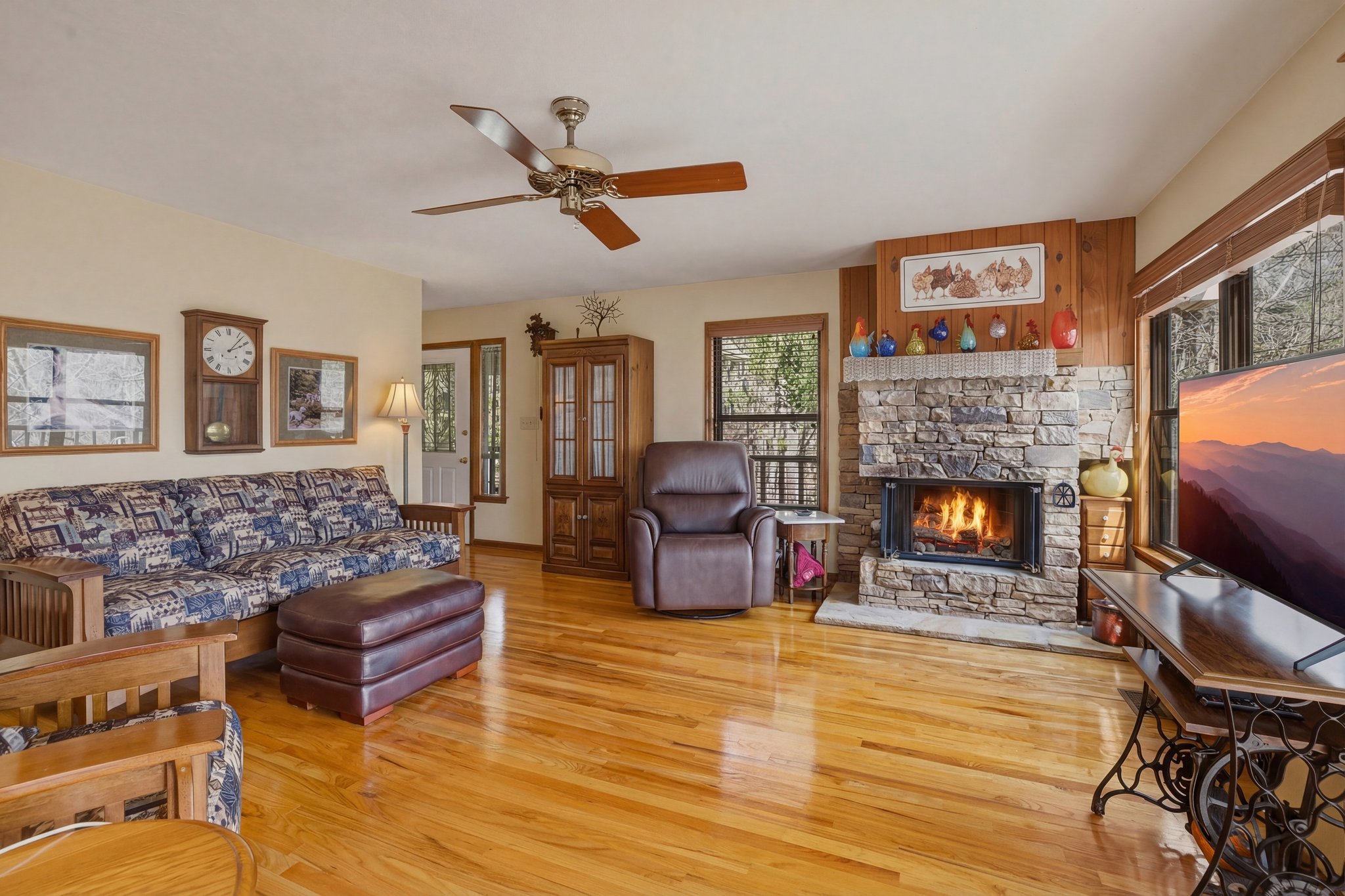 Welcome to your picturesque retreat in the heart of Pigeon Forge, Tennessee! Just minutes from all the attractions- this delightful 4-bedroom 3-bath cabin is located in the lovely Brookstone Village Resort. As you enter the cabin, notice a bedroom on the main. This level offers an open kitchen with family room and a floor to ceiling stack stone fireplace.