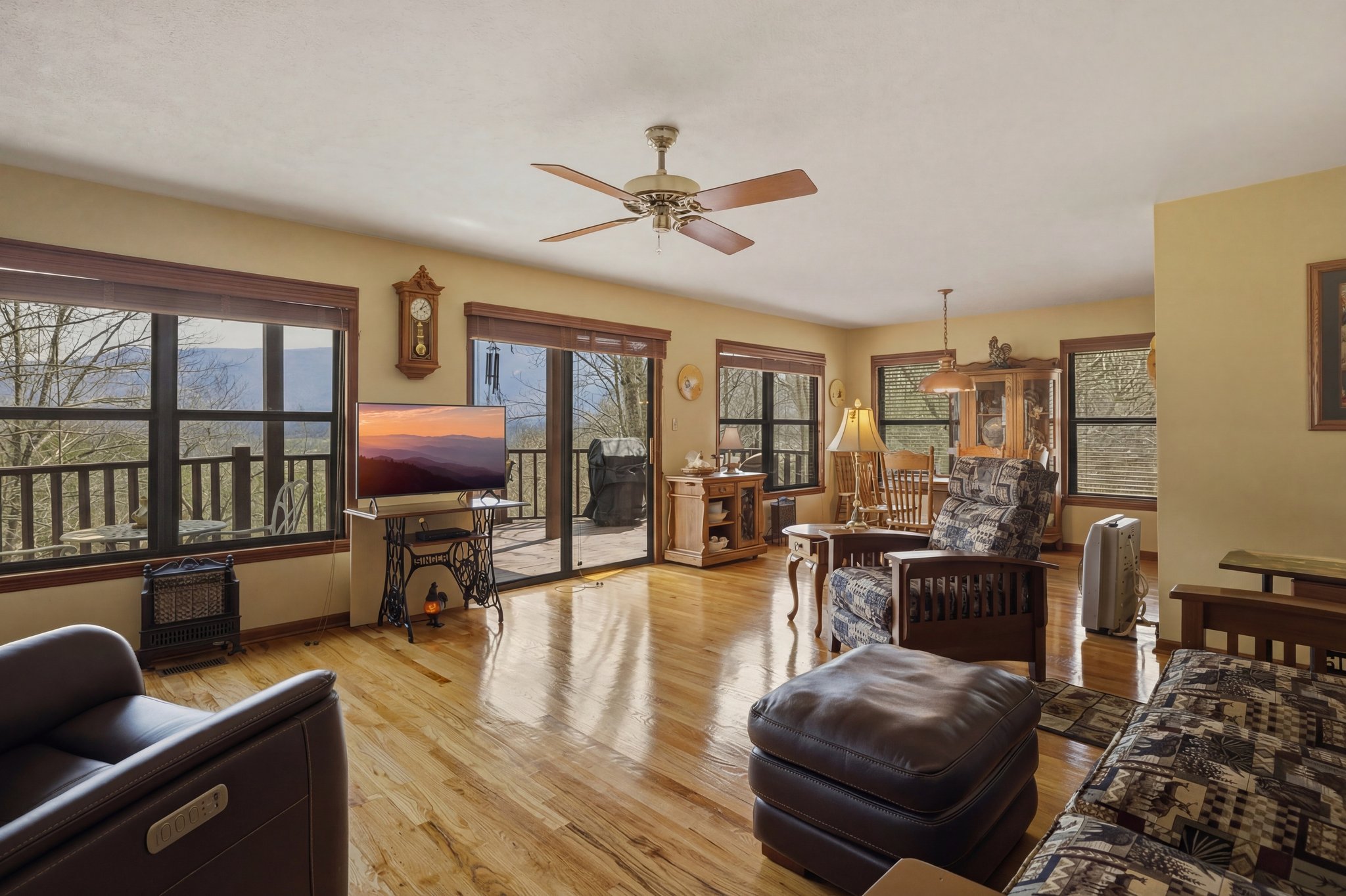 Limited-Service Listing. Contact seller direct for showings. Hearthstone log home perched at the highest point of a private gated community of six properties, 2.86 acres, with unobstructed 180-degree views of Mt. LeConte that have earned this property the name Million Dollar View. Completely secluded on a mountaintop yet 18 minutes to Pigeon Forge and 26 minutes to Gatlinburg. 2,289 sq ft finished on main and upper levels. Walkout basement adds 1,344 sq ft with approx. two-thirds above grade, double exterior doors, multiple windows with mountain views, full bath, laundry, and game room with ping pong, air hockey, carpet ball, putting green, and arcade. Three bedrooms per septic approval plus a flex room with closet, window, and door currently used as a fourth sleeping space. Three full baths. Main level master suite with king bed, walk-in closet, updated tile shower with glass doors, and covered porch access. Open-concept great room with wide plank pine floors and wood-burning fireplace with electric insert. Kitchen features island, stainless appliances, new refrigerator, under-cabinet lighting, and pantry. Upper level adds second master suite with king bed, walk-in closet, and updated bath with new tub and shower, plus a loft and a bonus room with closet, window, and door currently used as a fourth sleeping space. Covered front porch, covered back porch, and 2022 composite deck with 5-person hot tub facing Mt. LeConte. Private well with inline filter. WiFi Squared internet up to 50 Mbps. Gravel parking for 5-6 vehicles. No STR restrictions. Landowners association 1,600/yr covers gated access and road maintenance. Currently on Airbnb and VRBO with 60-plus five-star reviews; owner-managed with no paid advertising or property management. All info deemed reliable but not guaranteed. Buyer and buyers agent to verify.