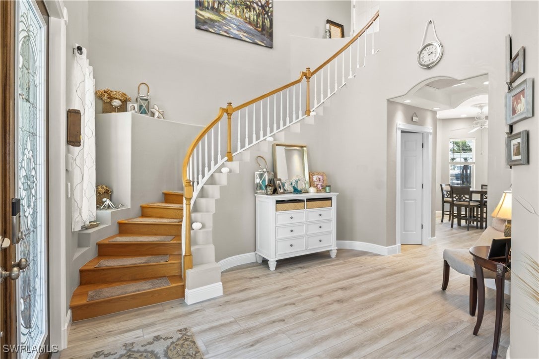 A Rare Gulf Access Gem Awaits You! Step into luxury waterfront living in this stunning 4-bedroom, 3-bathroom, 2-story masterpiece nestled on a prime triple corner lot with direct Gulf access in minutes! Boasting an impressive 297 feet of Captains Walk, this home is a boaters dream and the ultimate entertainers haven. As you walk through the grand entry doors, your eyes will be captivated by breathtaking water views, enhanced by the elegance of Versailles-patterned chiseled travertine marble floors in the main living area. Experience the perfect blend of luxury and comfort in this stunning home. The walls, beautifully adorned with custom Venetian plaster infused with marble dust, exude sophistication and create an upscale ambiance. Adding to the allure, the bedrooms feature hand-scraped, distressed hardwood floors that bring warmth, charm, and timeless character to the space. This home seamlessly combines elegance with inviting details, offering a truly exceptional living experience. The chefs kitchen is a culinary dream! Featuring a 48" 5-star dual fuel range and hood, a massive 66" stainless steel side-by-side refrigerator, and a center island with under-cabinet lighting, this space is designed for both practicality and wow-factor. The finishing touches, including custom blown glass fixtures, elevate the homes artistic appeal-from the dining rooms centerpiece to the dramatic chandelier in the stairwell leading to the lavish Main Bedroom suite. Relax in your private oasis with a heated pool and spa or step out onto the expansive lanai, protected by hurricane-impact glass and Kevlar automated shutters. The property also boasts a state-of-the-art 20,000 lb 4-motor e-drive Dolphin Boat Lift (raised 5 feet) with a 10,000 lb boat lift, complete with a Gem remote-perfect for showcasing your prized watercraft. Located in Cape Corals prestigious Yacht Club area, this home overlooks the tranquil Bimini Basin, offering unmatched water frontage and effortless access to the Gulf of Mexico. This home is Turnkey ready, and is a must be seen to truly appreciate its grandeur and unbeatable value.