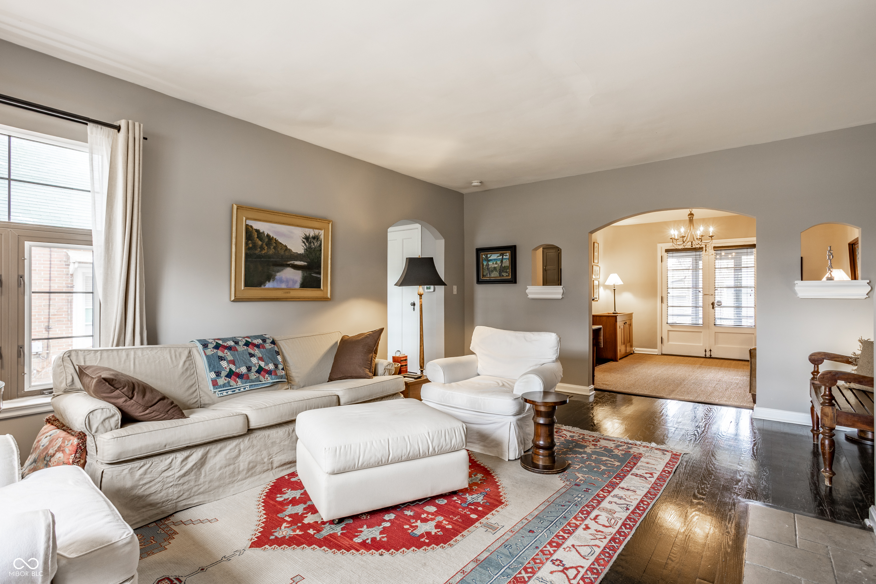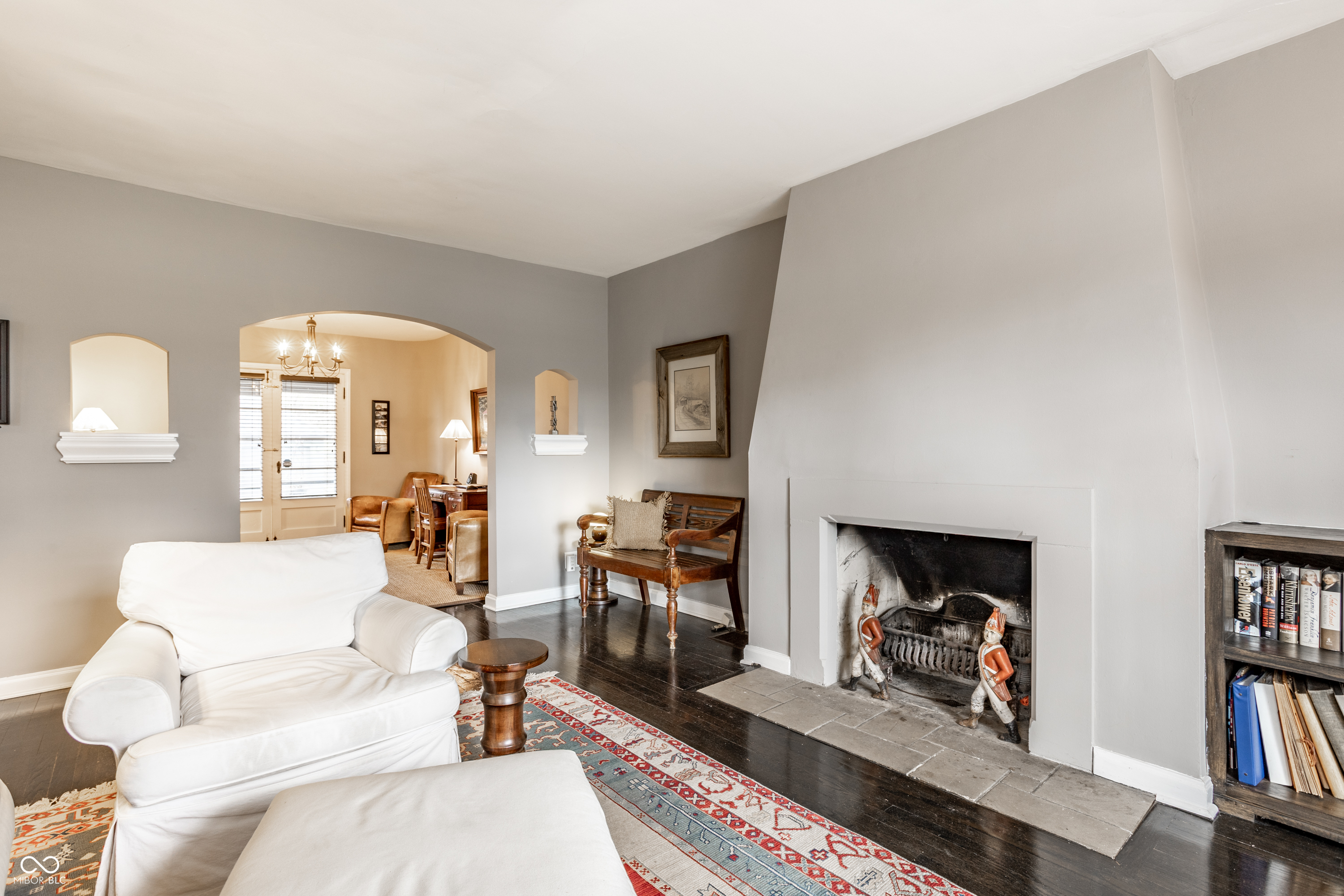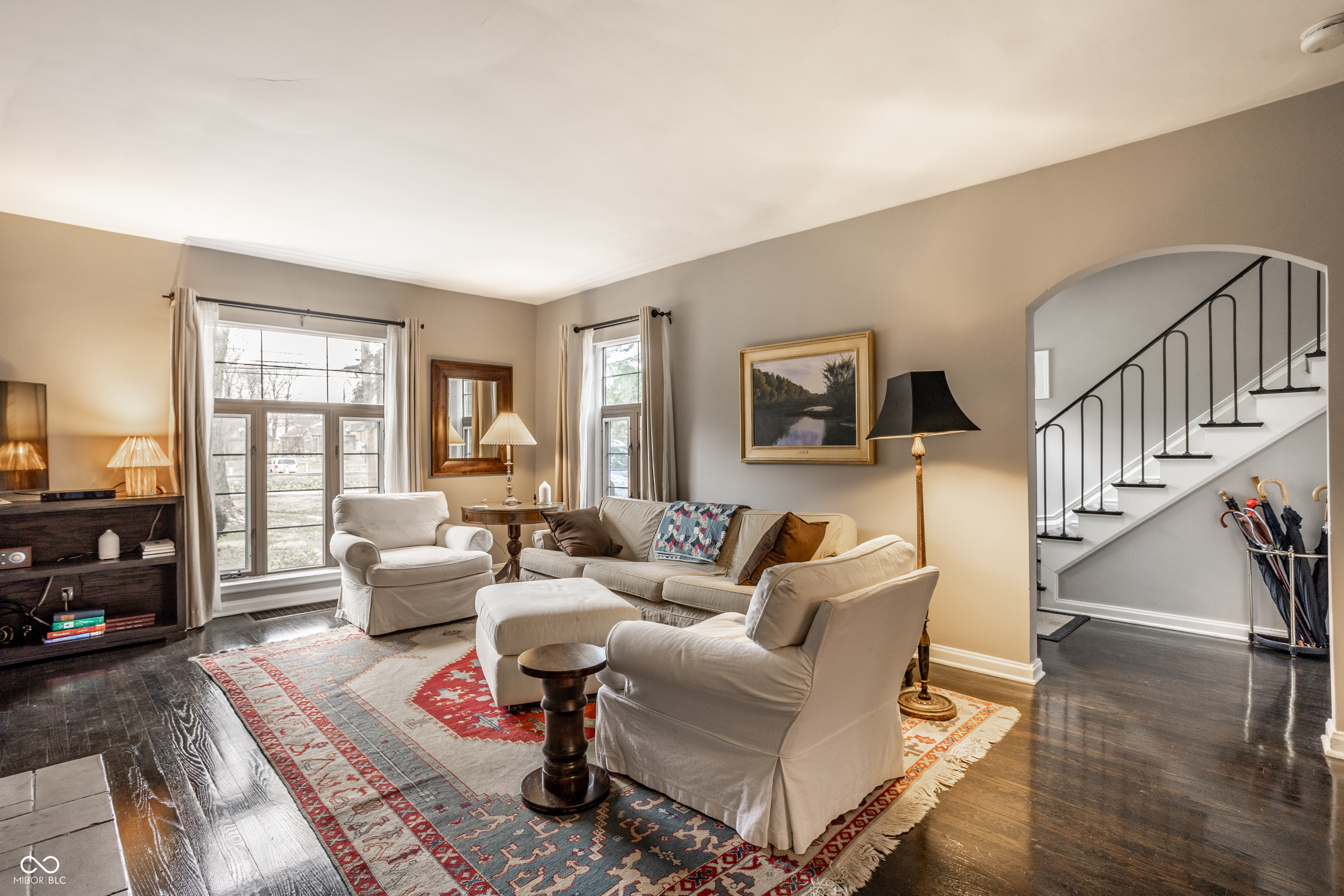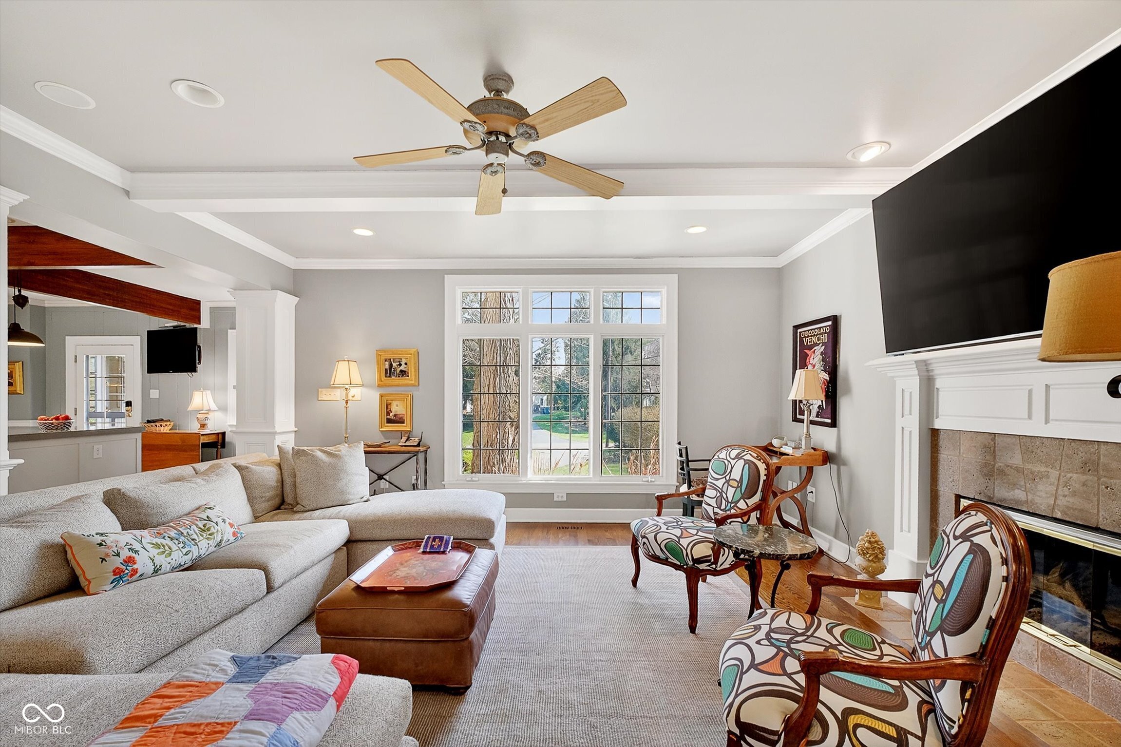 Welcome to timeless Meridian Hills living, where classic 1920s architecture meets modern luxury on nearly half an acre. Step past mature trees and into an inviting home designed for connection, comfort, and elegant entertaining. The sunlit living room with fireplace, beamed family room, and showpiece kitchen with quartz island and bar create the ultimate gathering spaces.
