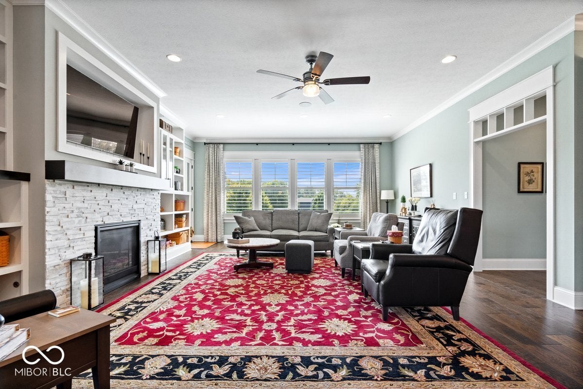 Gorgeous classic home in the HIGHLY desirable Springmill Crossing neighborhood! Situated on a spacious 0.65-acre lot along the pipeline, this beautifully updated home offers both privacy and room to enjoy the outdoors. Step inside to a warm, inviting interior that has been meticulously maintained. The main floor features hardwood flooring and newer carpet throughout. The well-appointed kitchen includes rich wood cabinetry, granite countertops, and stainless steel appliances, including an induction range. All windows throughout the home have been updated & feature built-in screens and blinds - for a clean & functional look throughout the home. The large family room is perfect for gathering, complete with built-ins and a new gas log fireplace insert (2025). Formal dining and living rooms provide flexible space for entertaining, a home office, or holiday traditions. Don't miss the cozy, climate-controlled sunroom with both heating and cooling for year-round enjoyment. Outside, a spacious deck overlooks a peaceful, private setting, with a fenced area ideal for children and pets. The professionally landscaped yard (2023) enhances the home's curb appeal. The primary suite is a true retreat, featuring an oversized walk-in closet, soaking jetted tub, separate shower, and dual vanities. Additional updates include a newer roof (2023), A/C (2020), and hot water heater (2025). Located in the highly sought-after Carmel school district, the neighborhood also offers a community pool and swim team, all conveniently close to shopping and amenities. Hurry! Will go fast -schedule your showing today!