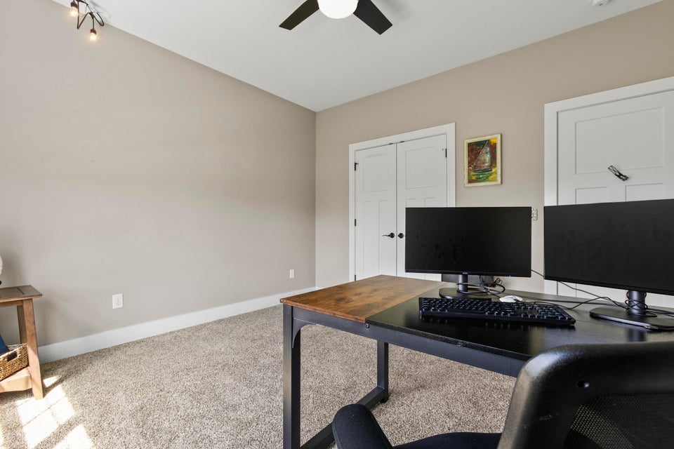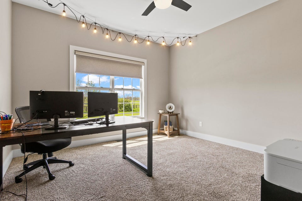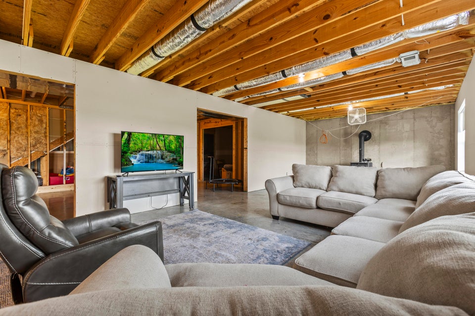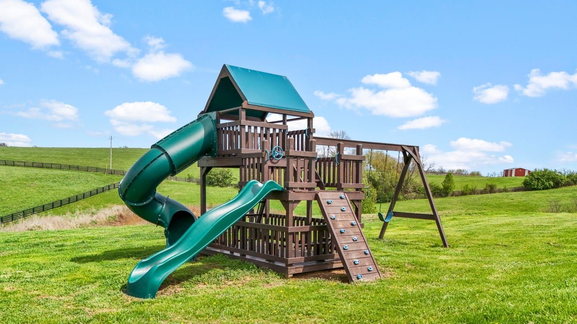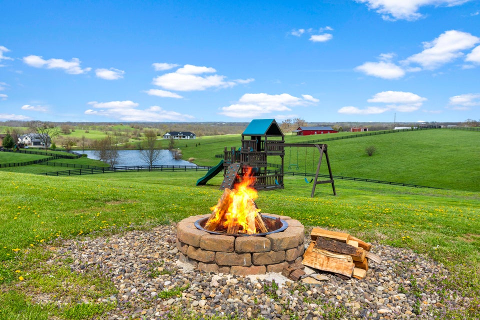 Prepare to be WOWED with this unique and stunning 3 year new home. Built by Schumacher Homes and completed in December of 2022, this open plan is an entertainers dream, both inside and outdoors. Located in Spencer County on a private 9 acres, this home features an incredible outdoor space which includes a 20x40 in ground pool with pool deck entry and slide, pool house, full bath house, pavilion with refrigerator, covered back porch with vaulted wooden ceiling, and stocked pond. Coming up the drive, one will be impressed with the curb appeal of this home. The pavers walkway to the covered front porch is highlighted by a stained wooden pergola that complements the dark siding of the home. A real standout. The front door blends in with the modern style of the home. Once inside, youll notice that this plan was built with views to the outside as a priority. Large windows everywhere flooding the space with natural light. The floor plan is an H shape with the foyer in the middle, great room, kitchen and lounge (office) on one side and the bedrooms and baths on the other. Spanning the space between the H outside is a fabulous and huge Timber Tech deck overlooking the pool area with entrances from the great room and primary bedroom. The great room space showcases a vaulted ceiling with beams and a gas fireplace with tile surround extending to the ceiling. A great focal point. Not to be missed is a wall of windows looking out to the rear of the property. The doors lead out to a fabulous covered patio with vaulted wooden ceiling and paved floor. The great room accommodates the dining room as well with plenty of space for a large gathering table. So now lets focus on the amazing kitchen. Featuring white cabinetry and quartz counters, this kitchen hides a big surprise. The tall cabinet doors open up leading into a butlers pantry room, or messy kitchen in todays terms. This room serves as a walk-in pantry with wrap around solid shelving, separate storage closet, base cabinet with sink and beverage fridge and even a window with remote shades. Very cool design and amazing storage. The kitchen is outfitted with stainless Jenn-Aire appliances throughout which remain with the home. Release your inner chef with the Jenn-Aire 5 burner gas chef stove and touch control stainless hood. Around the corner from the kitchen and facing the front of the house is a lounge/office room with an expanse of windows to make the work day better. The wall unit shelves with ladder can remain. On the other side of the foyer is a coat closet and a half bath featuring quartz countertop. The primary bedroom has a vaulted ceiling and faces the back of the property overlooking the pool area and pond. There is an accent wall for your headboard which adds a nice touch. Across from the bed is a wall of windows, maximizing the view for the perfect wake-up call or star gazing in the evening. Primary bedroom windows have remote shades for privacy and light blocking. The primary bath features tile floors, a soaker tub surrounded by windows, double vanity with quartz counter, walk in tiled shower with glass enclosure and a walk in closet with custom shelving. Down the hall are two other bedrooms, both with two closets. One is currently set up as an office. There is a convenient mudroom with built-in shelving and cubbies for dropping off items when entering the home. The laundry room is an efficient space with a sink cabinet, and two wall mounted fold up/down tables for ease of doing laundry. The washer and dryer can remain with the home. The basement walkouts to the side of the house and here youll find a finished bedroom, family room and a full bath with walk in tiled shower. There is also an area plumbed for a kitchen. And an amazing amount of space for storage or future expansion. Outside is the heated pool (propane) which is concrete with stainless steel lined walls. The bath house features a full bath with walk in shower - no need to go inside to get cleaned up after a swim! The outdoor pavilion has a refrigerator that will remain and plenty of space for a grill and dining space. The entire outdoor area has unilock pavers so no solid concrete to crack or maintain. Theres plenty of room for lounging around the pool and the area is surrounded by aluminum fencing to keep everyone safe and secure. All the pool equipment is housed in the attached pool house and of course, will remain with the home. The composite deck was built with support for a hot tub should one desire. In addition, there is a new large storage shed to house your yard equipment and tools or toys with ramps for ease of moving in and out. Other noteworthy features of the home are a Lennox HVAC system, Anderson windows throughout, luxury vinyl plank flooring, custom closets, and custom remote shades on windows. Warranty information on home and items in the home will be provided. This is a one of a kind property and is a must see. Schedule your private showing today.