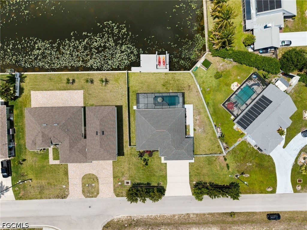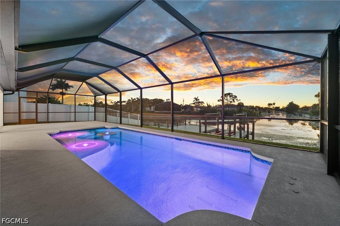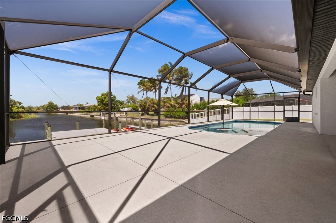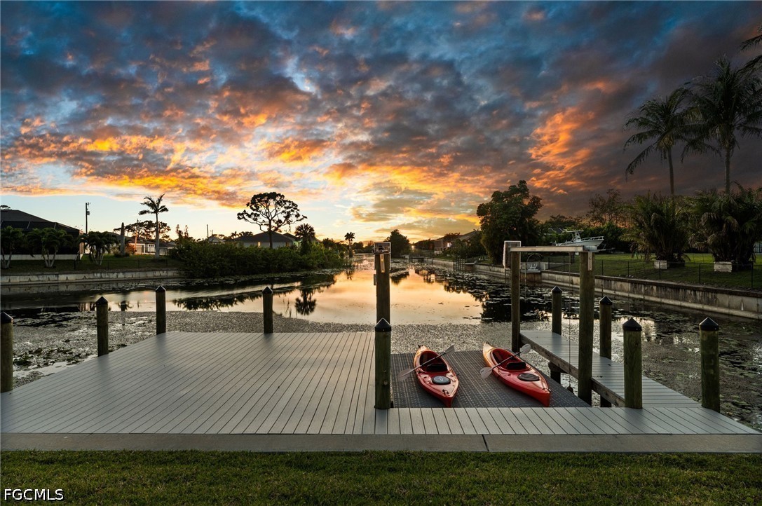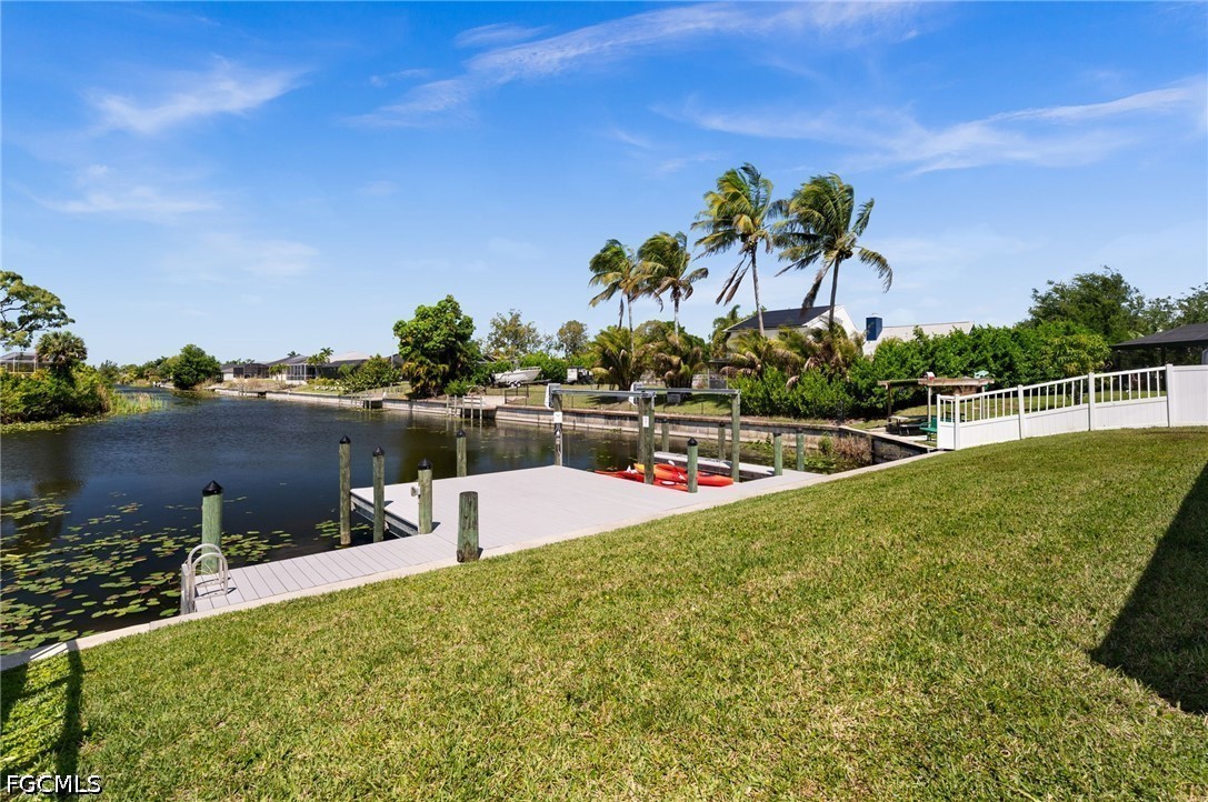 LONG WESTERN CANAL VIEWS on an INTERSECTING CANAL! 2020 BUILT HOME with CUSTOM, HEATED SALTWATER POOL, DOCK WITH BOAT LIFT, AIR-CONDITIONED 3-CAR GARAGE, and OVERSIZED LOT. Welcome to 1808 SW 8th Pl, a 4 BEDROOM, 2 bath waterfront home BUILT IN 2020 offering 1,718 sq ft of living space on a beautiful INTERSECTING FRESHWATER CANAL with spectacular long water views. Situated on an oversized lot of more than a quarter acre, this property offers an uncommon amount of outdoor space along with privacy created by a fully FENCED YARD and lush landscaping in front. WESTERN EXPOSURE provides incredible sunset views down the canal every evening. The outdoor living area is designed to take full advantage of the waterfront setting. The large SCREENED LANAI features a CUSTOM, HEATED SALTWATER POOL built in 2022 with a unique swim-up table, integrated umbrella stand, water features and tanning shelf, all overlooking the water views. The pool system is SMARTPHONE APP CONTROLLED, allowing you to easily manage heating, lighting, and pool features from anywhere. Just beyond the pool, the property includes a 40 x 20 DOCK WITH BOAT LIFT installed in 2022, offering excellent freshwater fishing for Peacock and Largemouth bass or easy access for kayaking and cruising the canal system. Inside, the home features tile flooring throughout, high ceilings, and an open split-bedroom floor plan. The kitchen offers granite countertops, stainless steel appliances, an island with breakfast bar, and a great view down the canal. The adjacent dining area includes sliding glass doors that open directly to the lanai and pool area, making indoor-outdoor living easy. The spacious primary suite enjoys water views and direct lanai access through sliding glass doors, along with two walk-in closets and an en-suite bath with dual sinks and a tiled shower. On the opposite side of the home, the 3 ADDITIONAL GUEST BEDROOMS are arranged for privacy, with 2 ADJOINING ROOMS that work well for guests or families. The guest bathroom also functions as a convenient POOL BATH. Additional features include a 3 CAR GARAGE WITH MINI-SPLIT A/C (2021), laundry room with washer and dryer, and a large FENCED SIDE YARD that provides excellent space for storage, equipment, or additional outdoor use. The home also includes SMART HOME FEATURES, with app-controlled pool equipment, smart door locks, and smart lighting that allow convenient control and monitoring from your phone. The pool and lanai were added in 2022, the dock and lift in 2022, and the fence in 2021. Located in the heart of SW Cape Coral, this home offers easy access to shopping, dining, schools, and parks while enjoying one of the best long canal views in the area. The property is NOT IN A FLOOD ZONE AND HAS NOT FLOODED IN ANY HURRICANE.