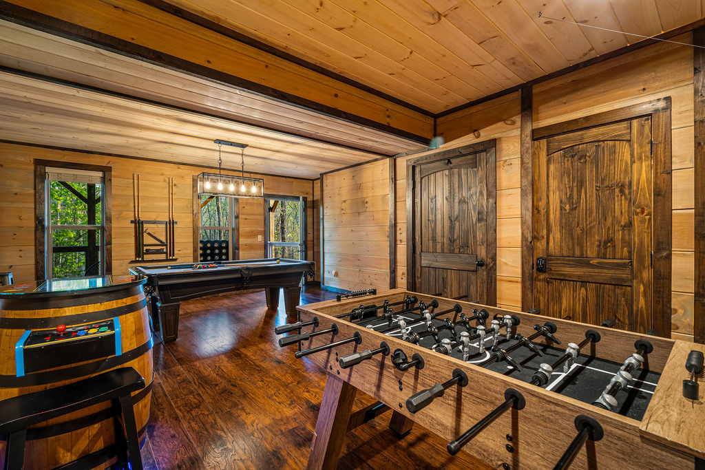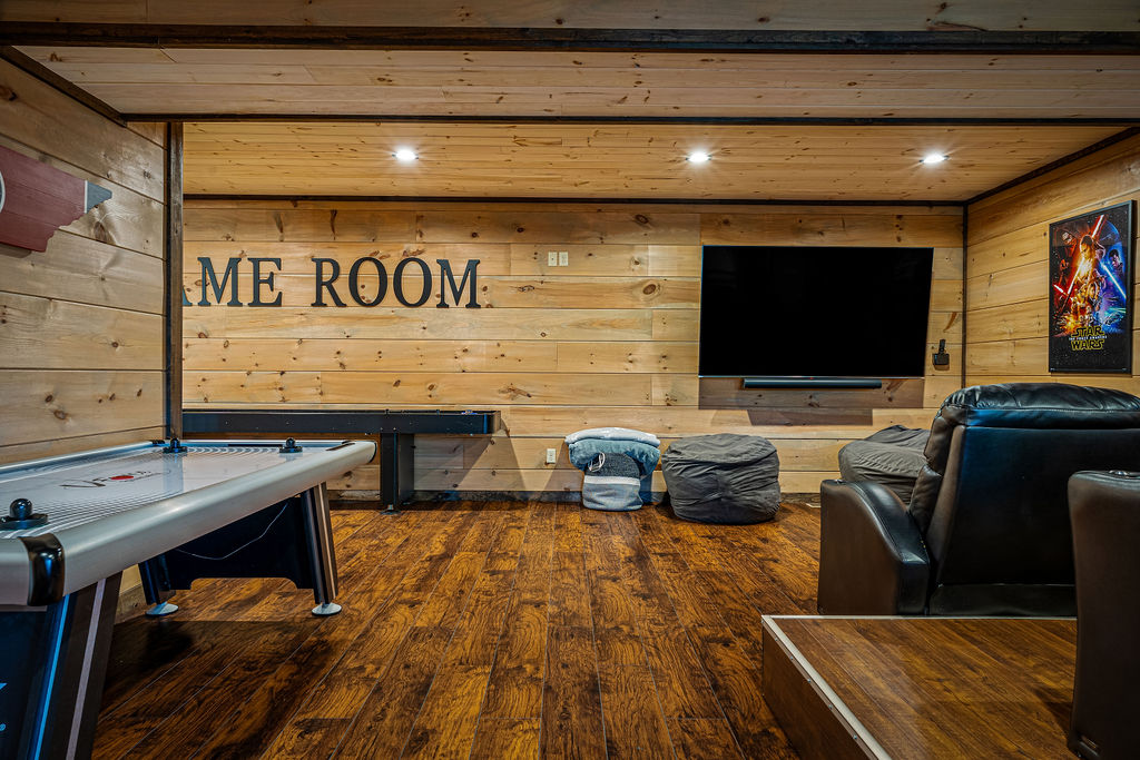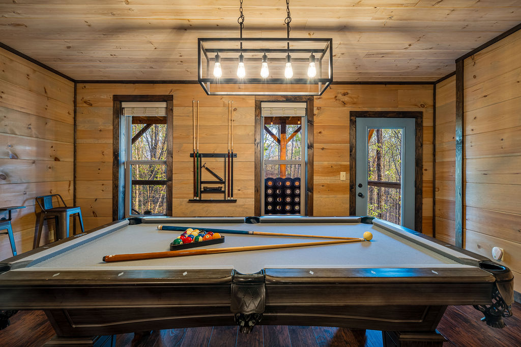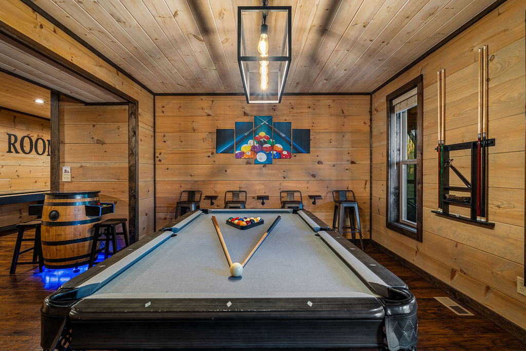 Welcome to this pristine 3 story modern cabin in the highly desired Pinnacle View community, offering top tier finishes, unmatched amenities, and breathtaking Smoky Mountain views from every floor. Built in late 2024, this masterpiece was crafted with quality in every detail, and its excellence has not gone unnoticed. Recognized as one of AvantStays best, this home was a finalist in the 2025 AvantStay Awards, honoring top tier vacation experiences across the country.Inside, you will find three uniquely themed bedrooms, including a main level primary suite featuring a stunning double shower head walk in tile shower. The open living area radiates comfort and style with granite countertops, stainless steel appliances, a dramatic floor to ceiling fireplace, a 98-inch Smart TV, plush sectional seating, and a custom built in live edge bar, perfect for cozy movie nights or gathering for meals and conversation. Extra wide staircases on both levels make carrying luggage effortless, a rare and highly appreciated upgrade in mountain homes.Entertainment is where this property truly shines. The expansive game room is an immersive wonderland, complete with bejeweled guitars, artwork, dual 50-inch Smart TVs, and an incredible assortment of nostalgic and modern arcade favorites. Guests of all ages will enjoy Silver Strike Bowling, Target Toss and Power Putt-Putt Golf (three in one), Golden Tee, California Speed driving game, Pandora, Galaga, Multicade, and more. Light block out film on windows and doors enhances the gaming experience by eliminating glare. Step directly onto the covered deck from the game room to take in the views while still staying close to the fun.For the ultimate year-round attraction, enjoy your indoor heated pool, maintained at a comfortable 84 degrees with epoxy grip coat flooring for added safety. Outside, multiple balconies and seating areas offer panoramic vistas of the Great Smoky Mountains. Unwind in the hot tub, watch breathtaking sunsets, or gather around the outdoor wood burning firepit, complete with two 6-foot benches, an unforgettable place to end the day under the stars.Additional features include custom blinds, privacy tinted windows, a dedicated office area for remote work with a view, a solar lit driveway, Hardie board siding, and a stone exterior for long lasting, low maintenance durability.Thoughtfully designed and loaded with upgrades, this cabin embodies modern luxury, full scale entertainment, and iconic Smoky Mountain scenery, ideal as a personal retreat, full time residence, or high performing short-term rental with award level appeal.