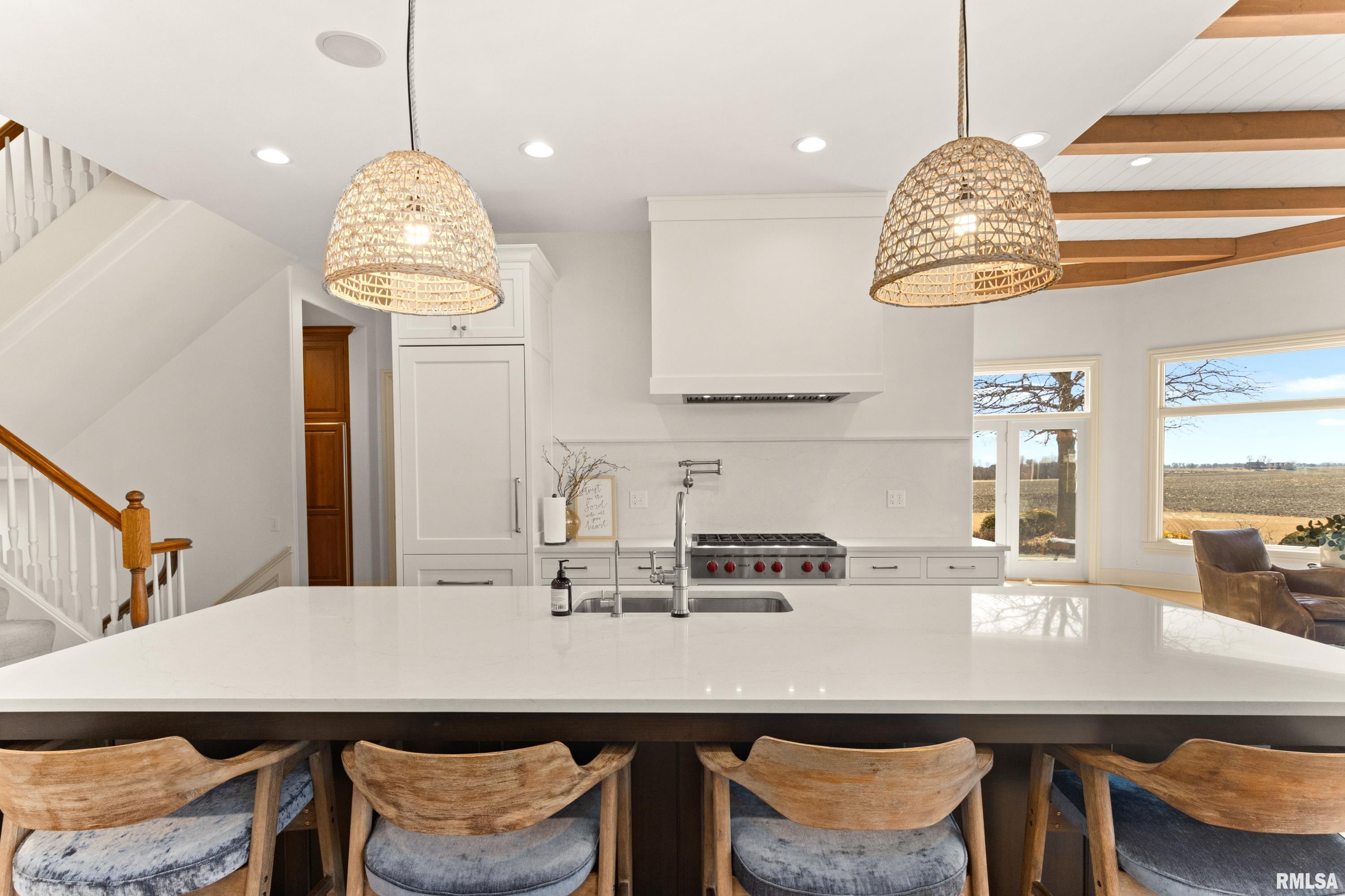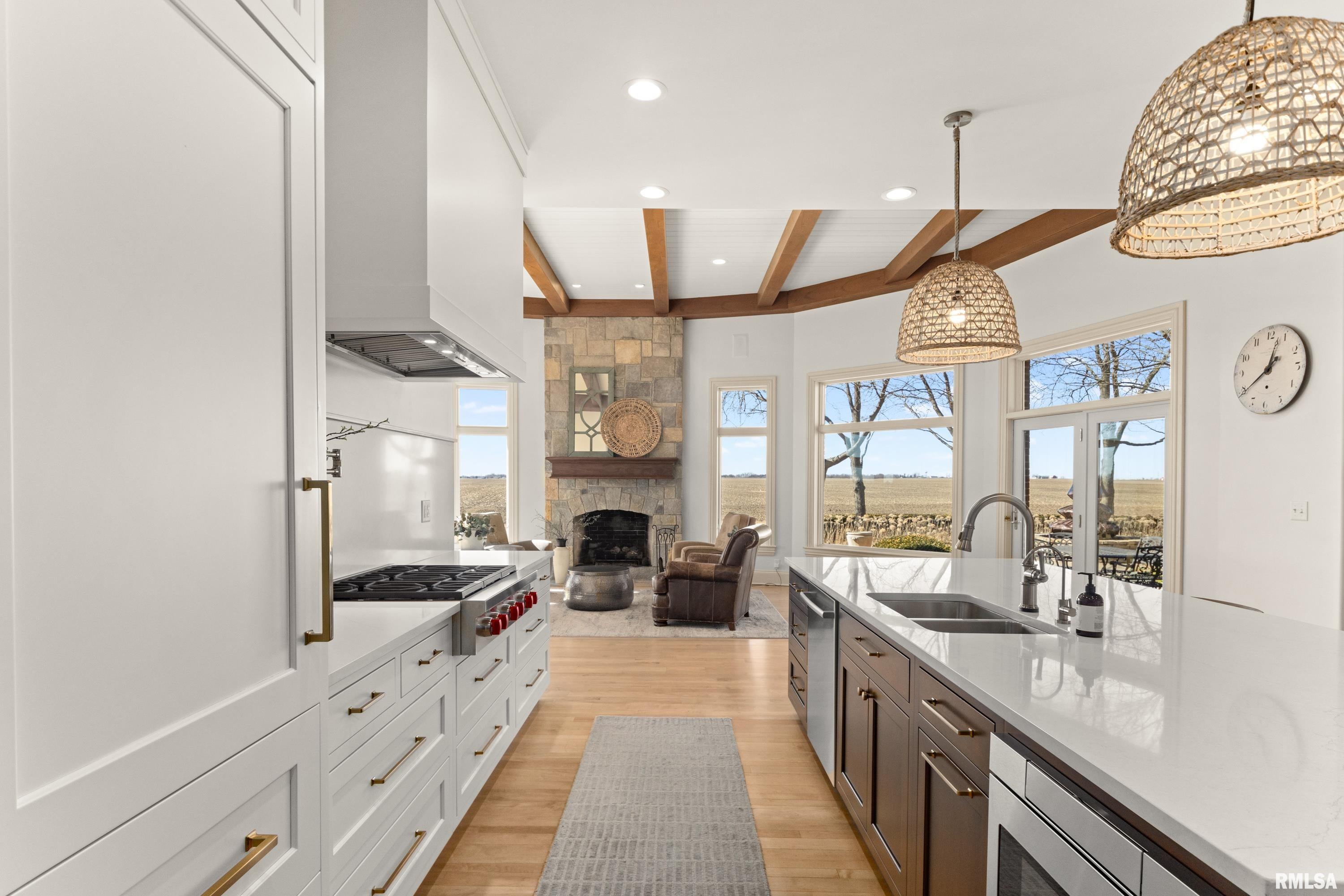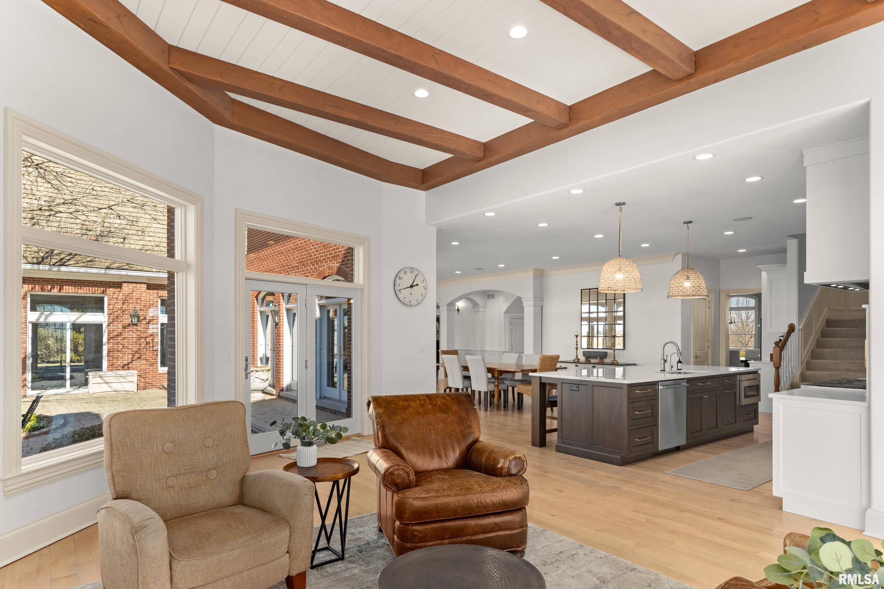 California Coastal in the Midwest: Stunning 5 bed, 8 bath, 2-story in Sunset Hills Estates, completely transformed with a sophisticated high-end rebuild in 2016 by the current owners. A custom mahogany front door opens to a grand foyer with oxidized tiles, curved staircase, and RH crystal/metal chandelier. The living area is anchored by a soaring 20 vintage Douglas Fir timber.