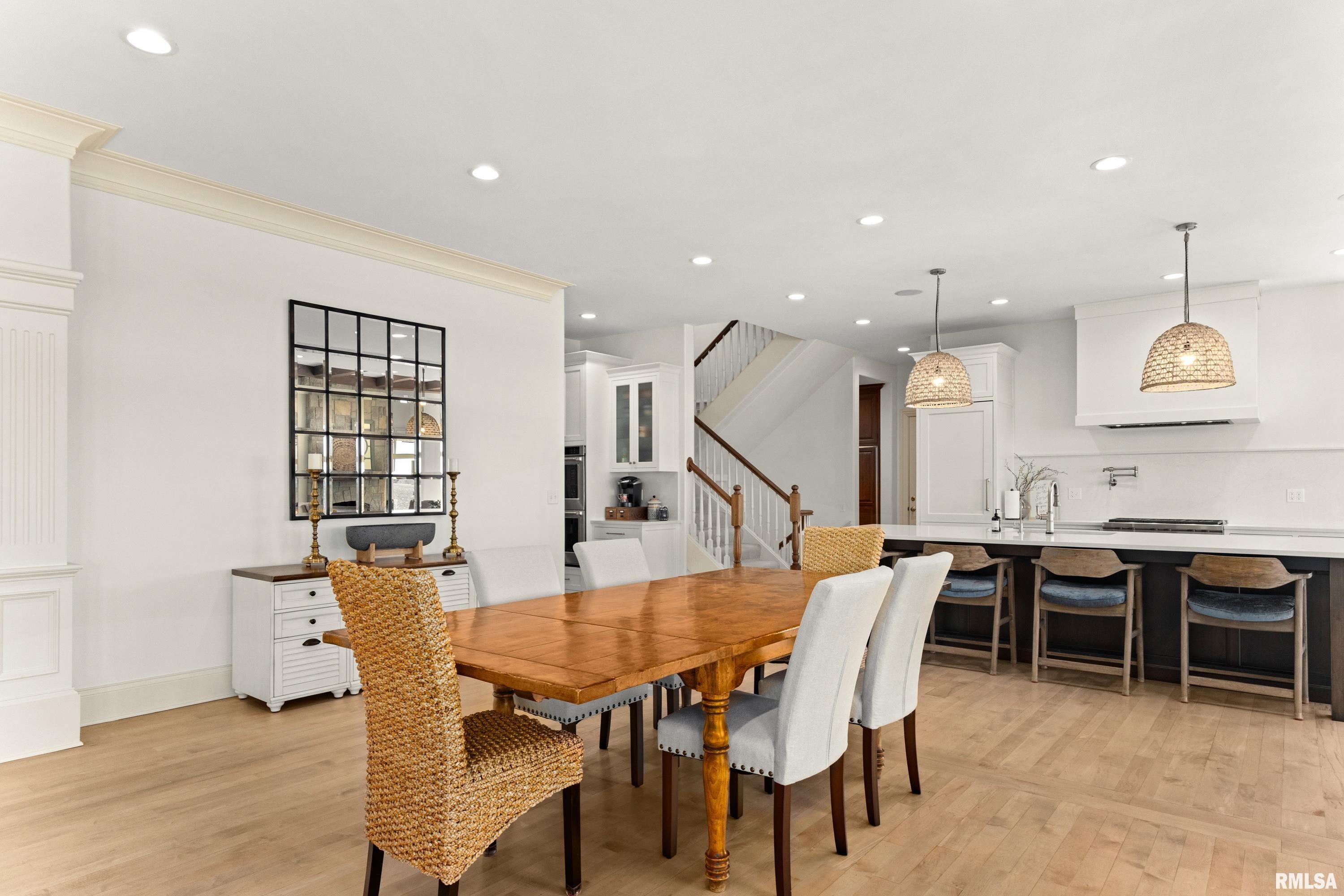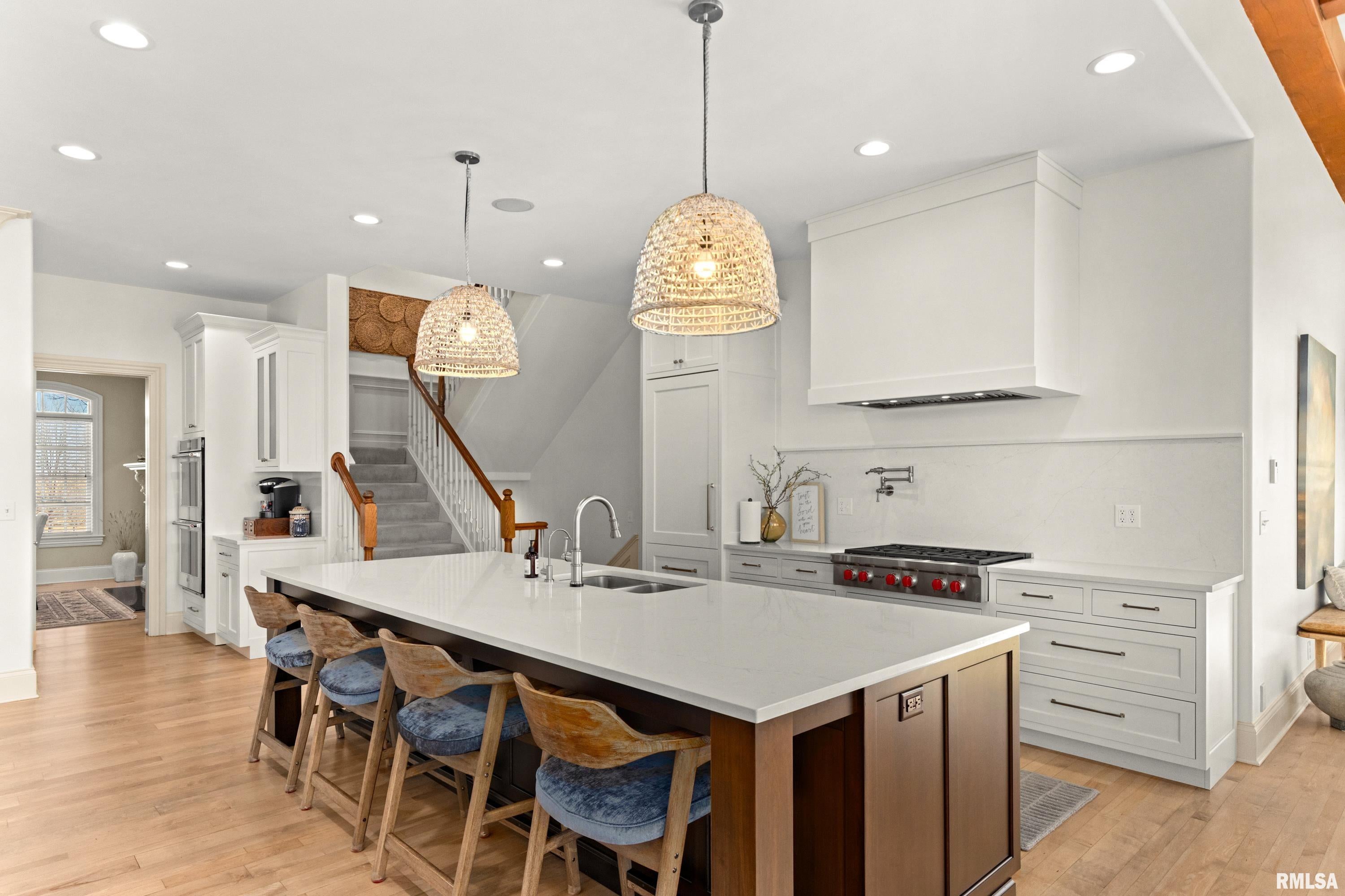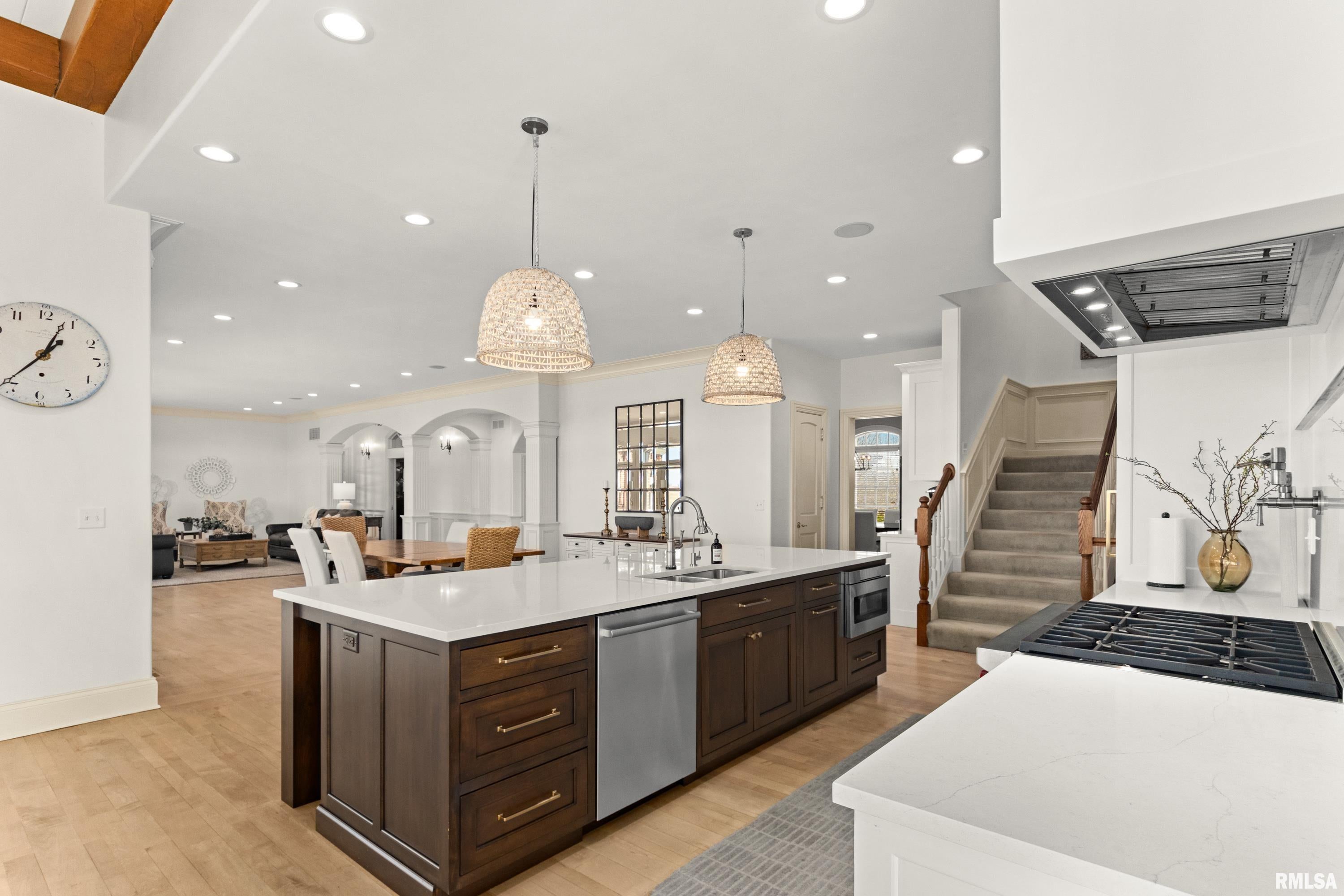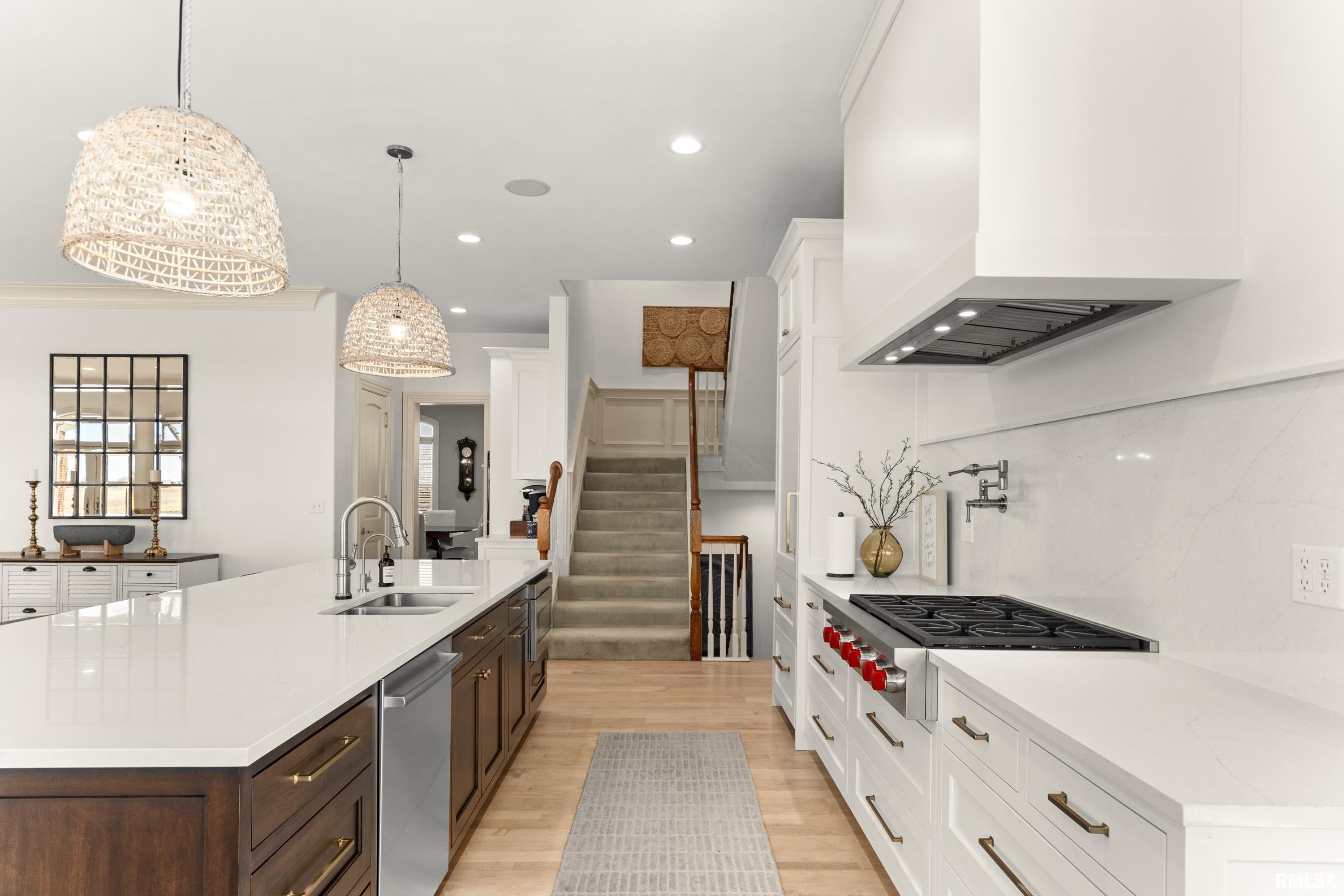 California Coastal in the Midwest: Stunning 5 bed, 8 bath, 2-story in Sunset Hills Estates, completely transformed with a sophisticated high-end rebuild in 2016 by the current owners. A custom mahogany front door opens to a grand foyer with oxidized tiles, curved staircase, and RH crystal/metal chandelier. The living area is anchored by a soaring 20 vintage Douglas Fir timber.