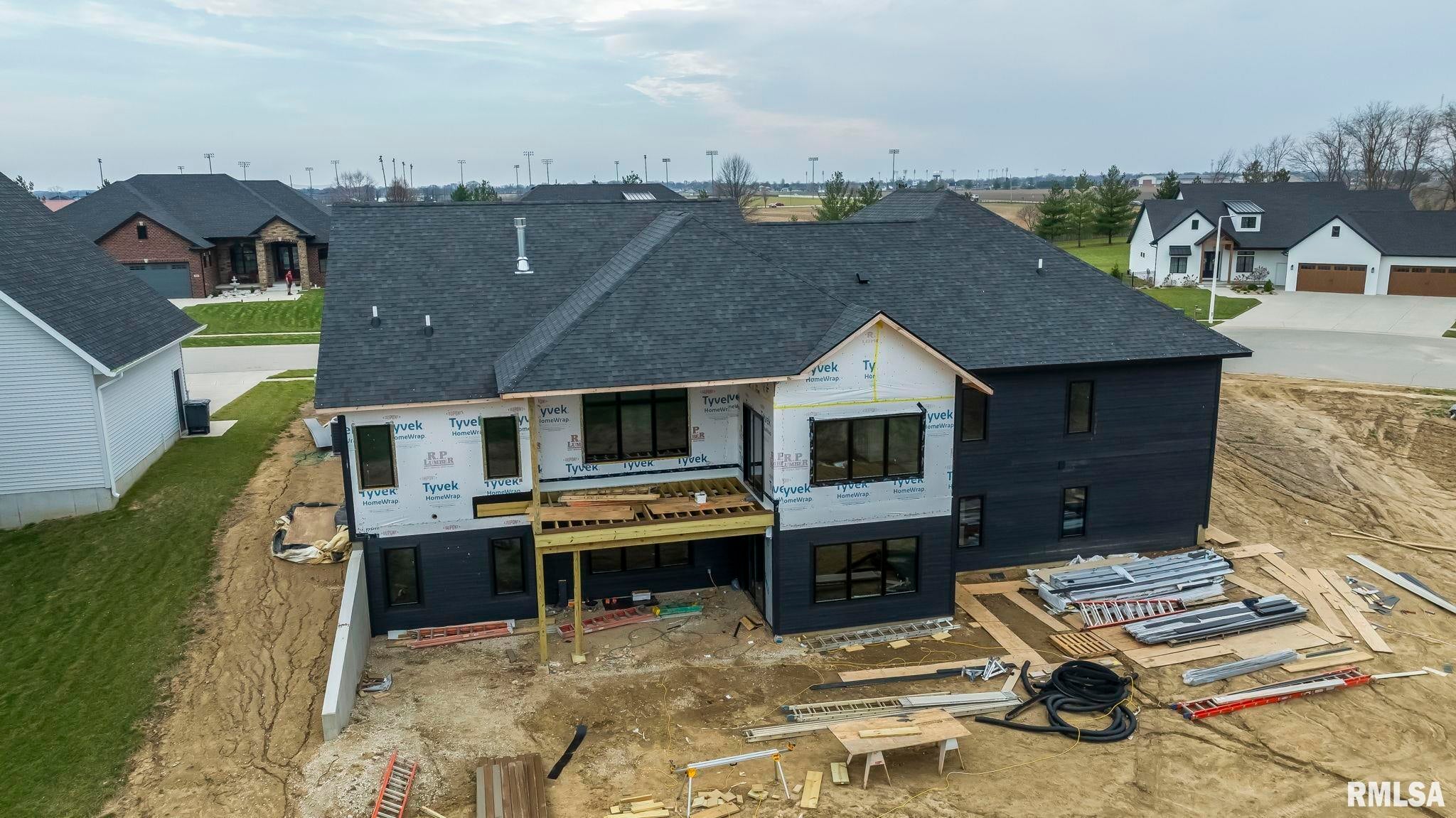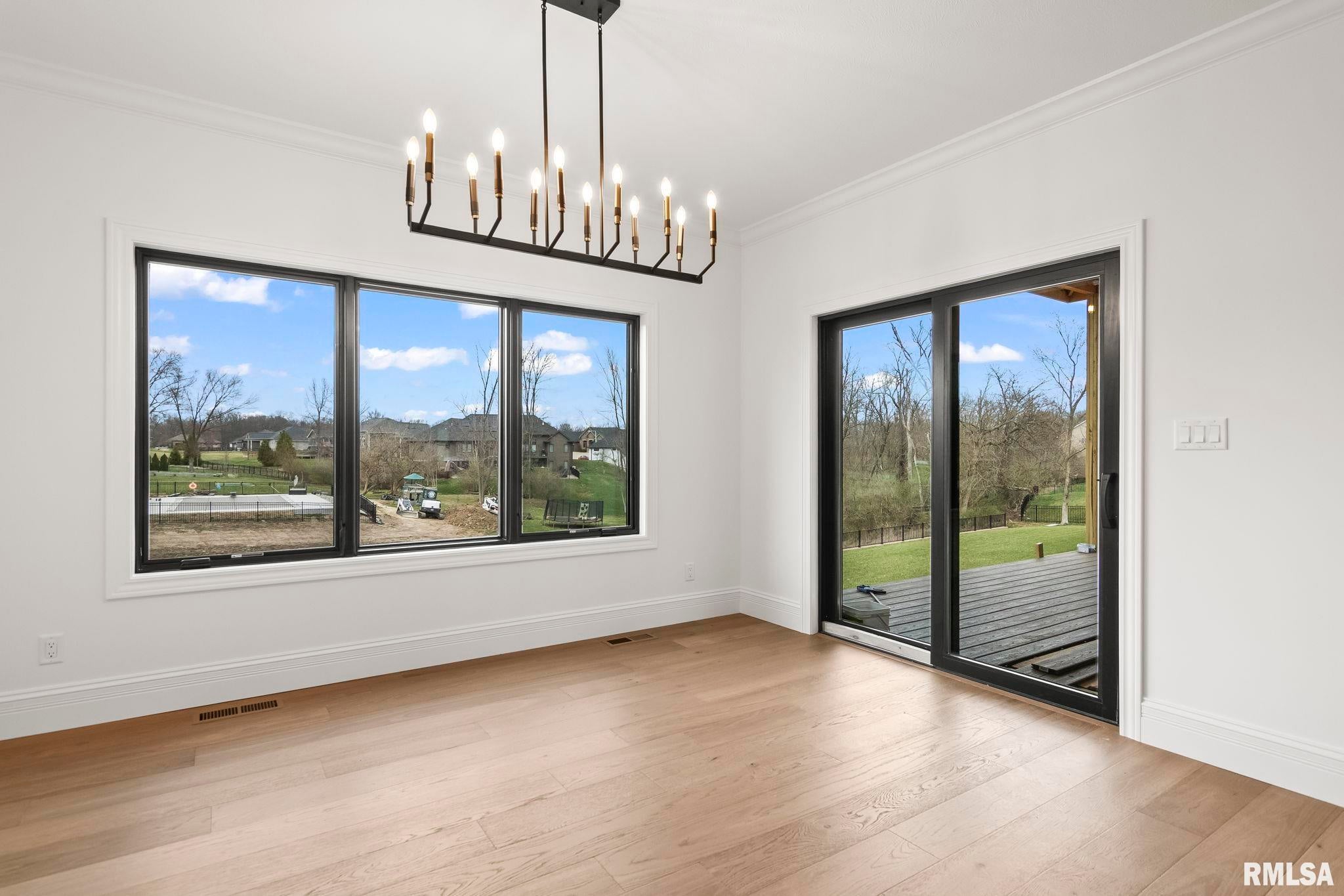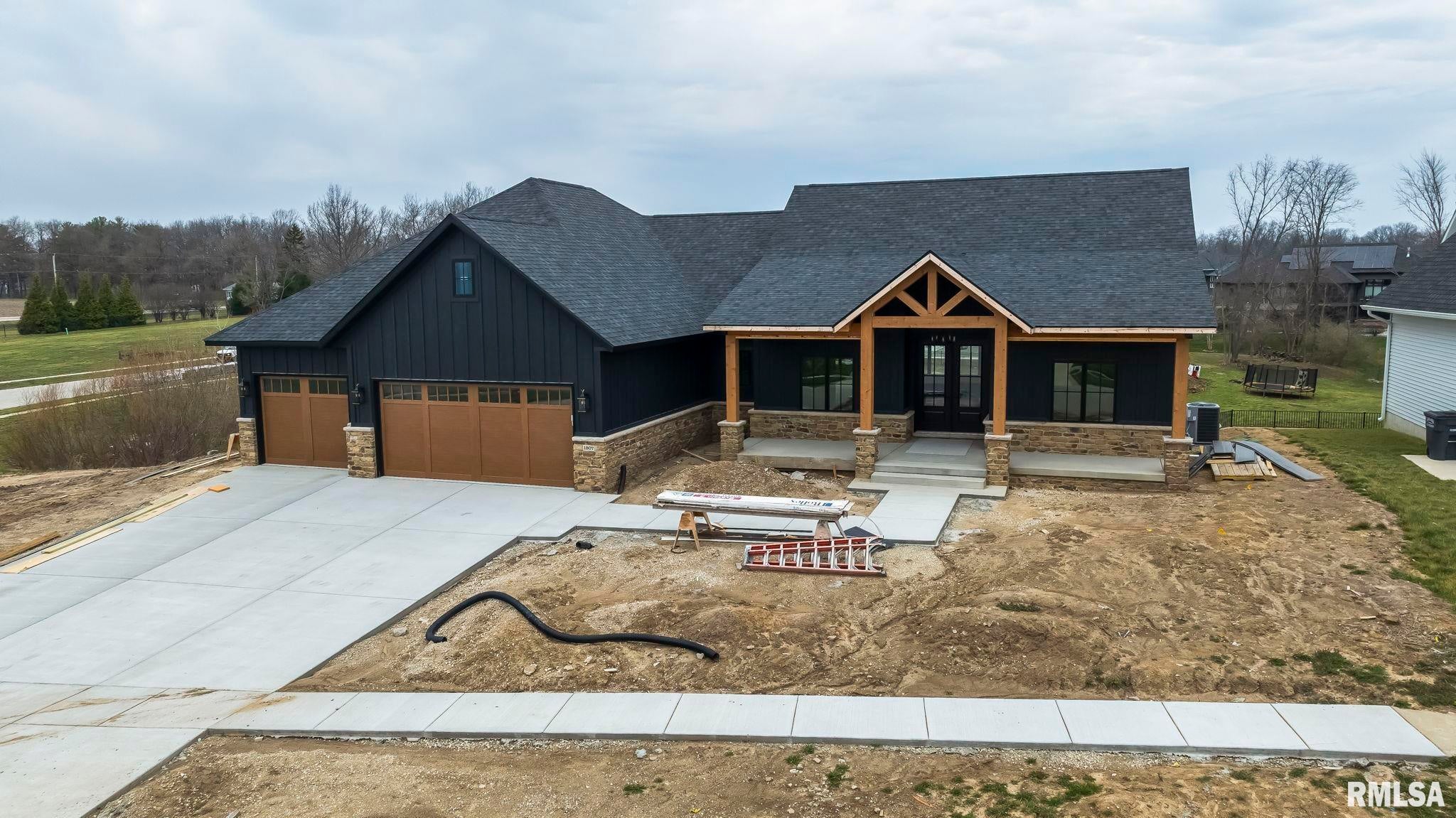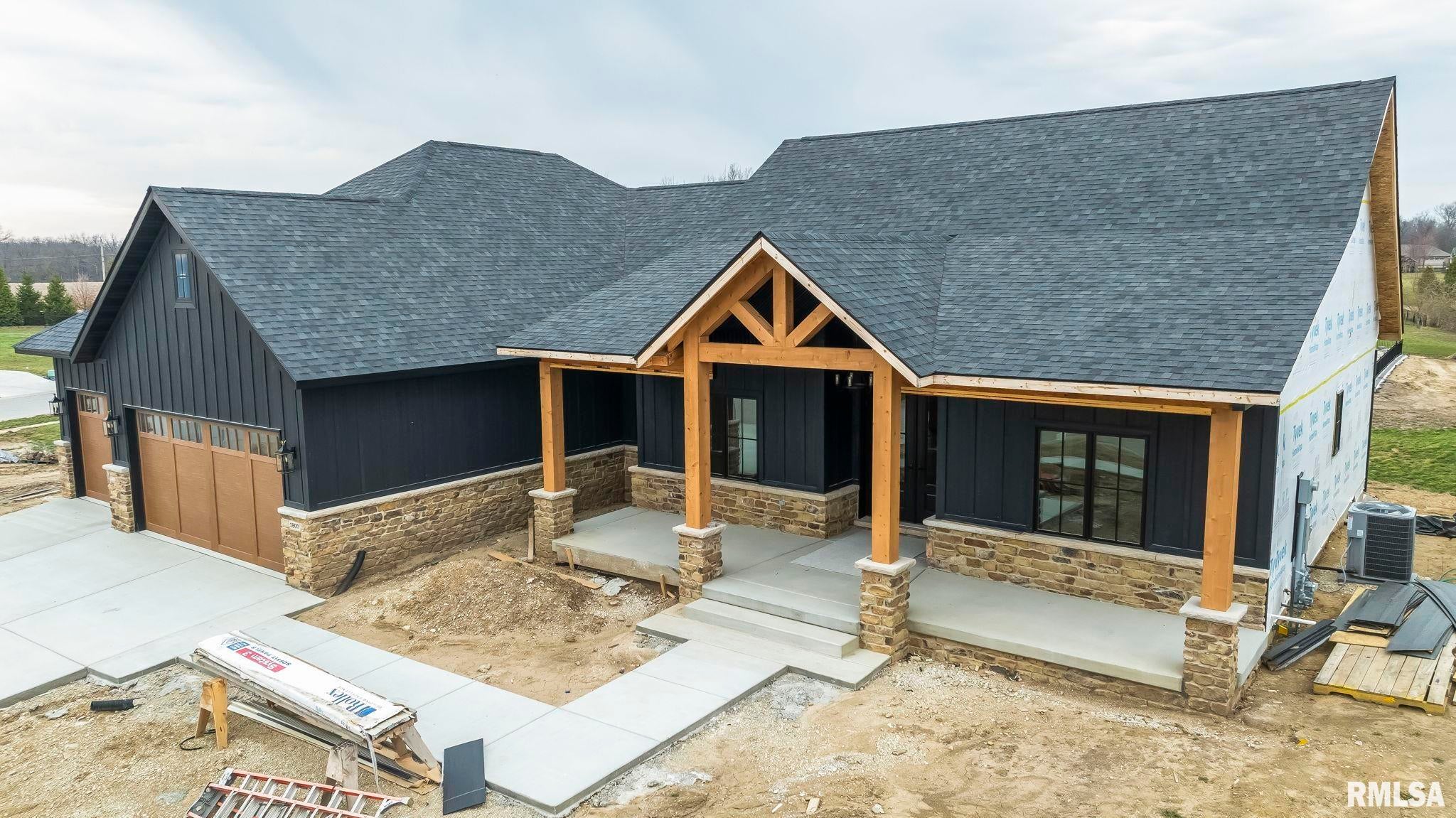 Striking new construction in Iron Bridge Estates by Moughan Builders, featuring black vertical siding with warm cedar accents for standout curb appeal. This 5 bedroom, 3.5 bath home blends modern design with inviting, natural elements. The open concept floor plan offers light filled, airy spaces perfect for everyday living and entertaining. The living room showcases exposed wood beams for warmth and architectural interest. Entertain effortlessly in the kitchen, complete with an expansive quartz island and top of the line appliances, plus a hidden custom walk-in pantry discreetly tucked behind false cabinetry for a sleek, seamless look. Designer selected finishes shine throughout with clean lines, stylish fixtures, and high end touches that create a polished yet comfortable feel. A convenient drop zone leads to the 3 car garage, adding everyday functionality. The walkout basement expands your living space and opens to serene green space, providing a peaceful, picturesque backdrop. The primary suite is a true retreat, featuring a spa like bath with freestanding tub, floor to ceiling tile, and a custom walk-in closet connecting directly to the laundry room. Located on the north side of Chatham in the Chatham School District, with easy access to Springfield, this home perfectly blends modern style with everyday comfort.