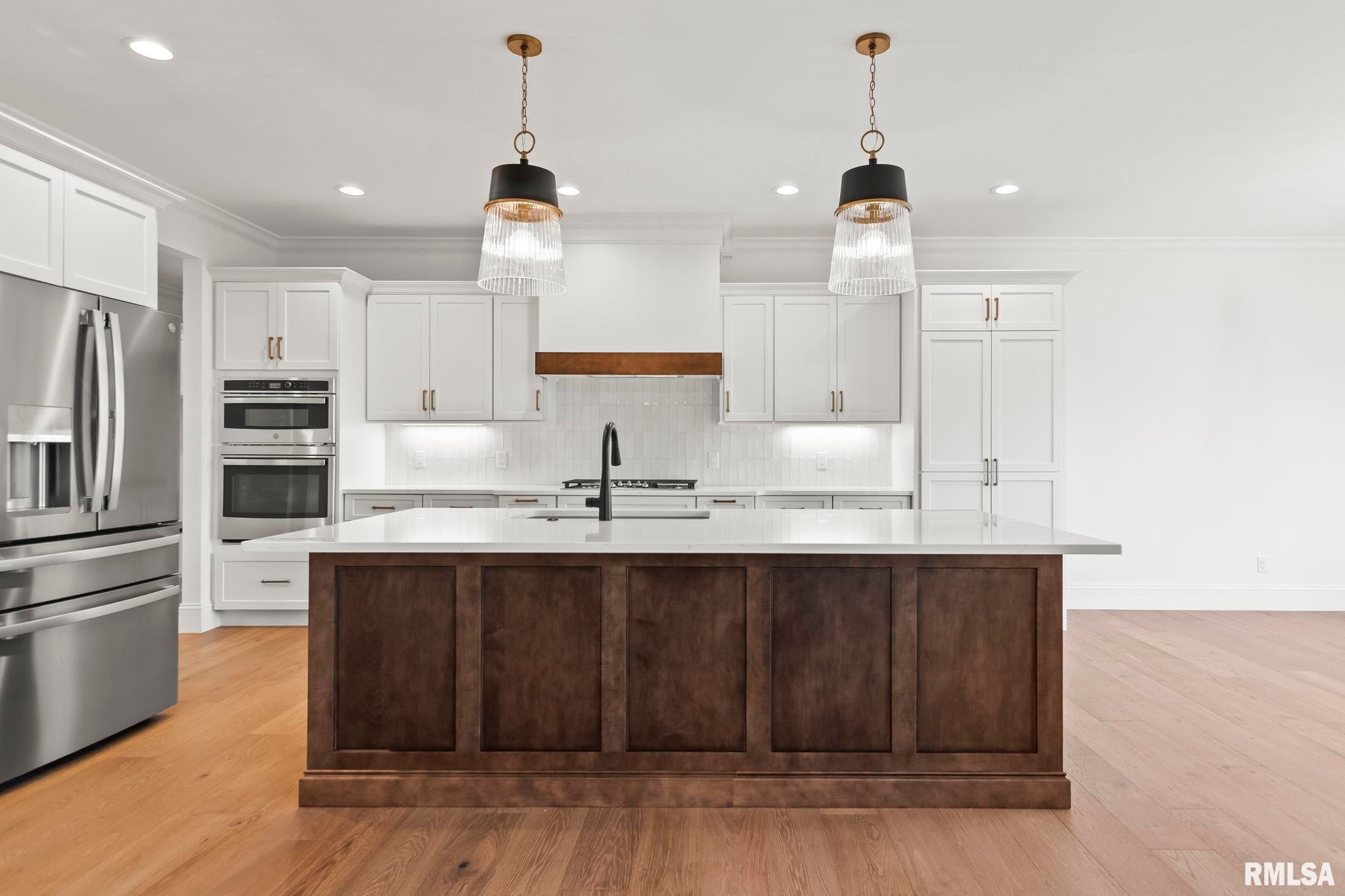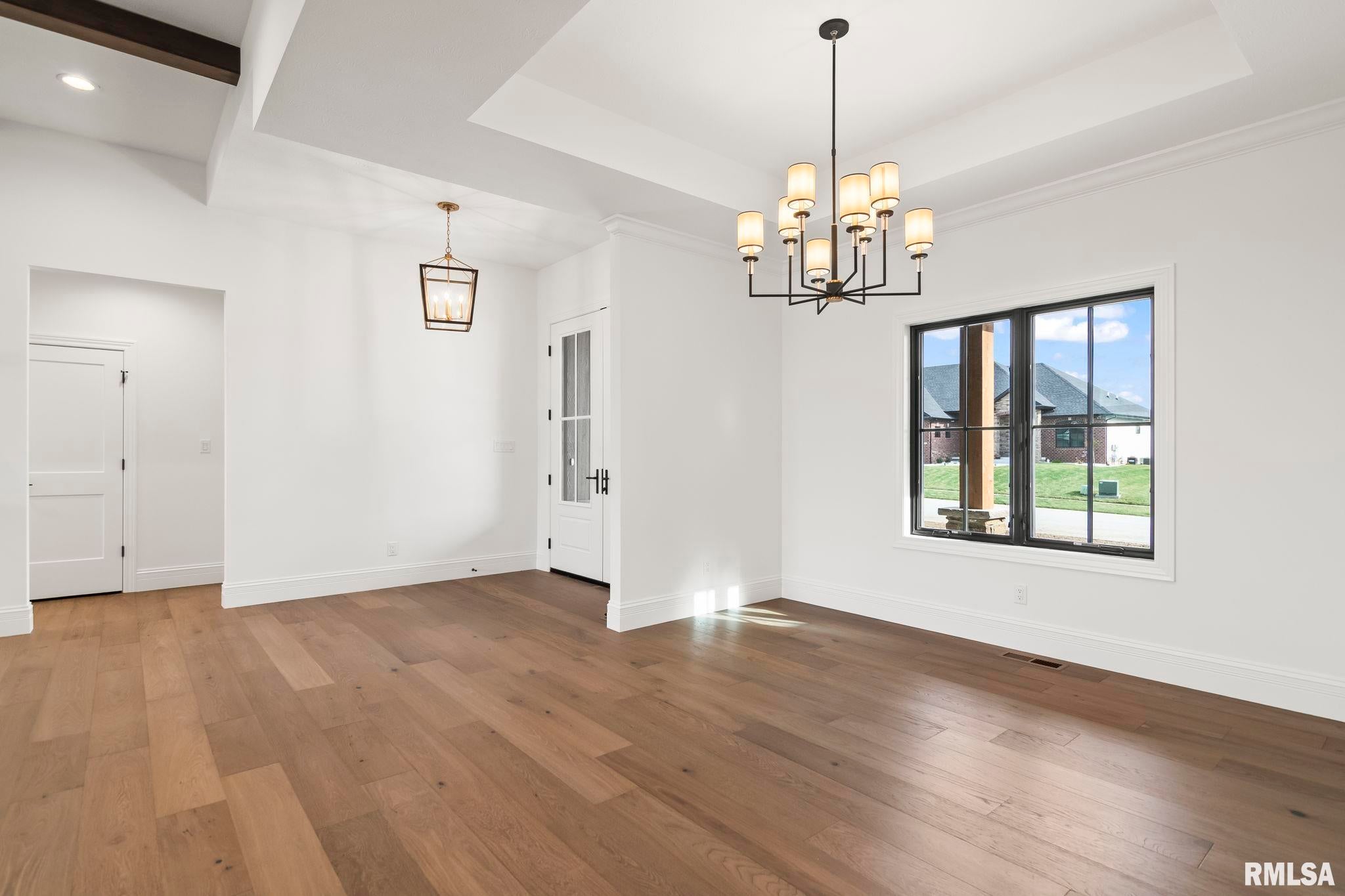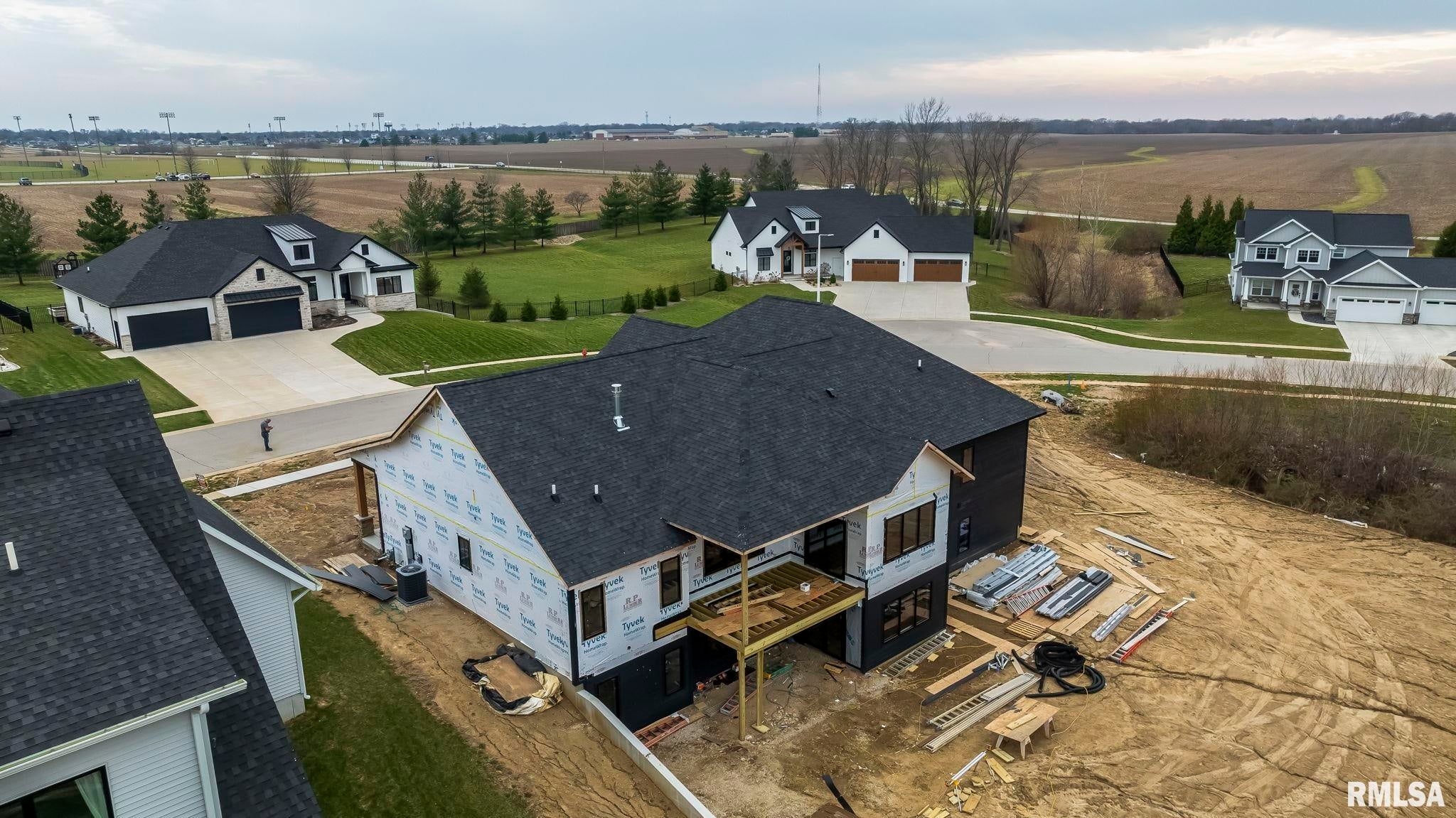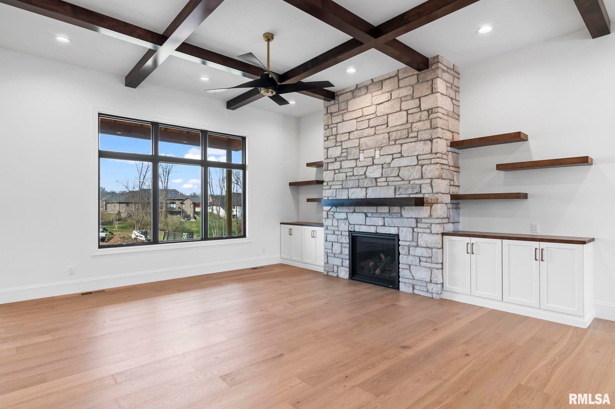 Striking new construction in Iron Bridge Estates by Moughan Builders, featuring black vertical siding with warm cedar accents for standout curb appeal. This 5 bedroom, 3.5 bath home blends modern design with inviting, natural elements. The open concept floor plan offers light filled, airy spaces perfect for everyday living and entertaining. The living room showcases exposed wood beams for warmth and architectural interest. Entertain effortlessly in the kitchen, complete with an expansive quartz island and top of the line appliances, plus a hidden custom walk-in pantry discreetly tucked behind false cabinetry for a sleek, seamless look. Designer selected finishes shine throughout with clean lines, stylish fixtures, and high end touches that create a polished yet comfortable feel. A convenient drop zone leads to the 3 car garage, adding everyday functionality. The walkout basement expands your living space and opens to serene green space, providing a peaceful, picturesque backdrop. The primary suite is a true retreat, featuring a spa like bath with freestanding tub, floor to ceiling tile, and a custom walk-in closet connecting directly to the laundry room. Located on the north side of Chatham in the Chatham School District, with easy access to Springfield, this home perfectly blends modern style with everyday comfort.