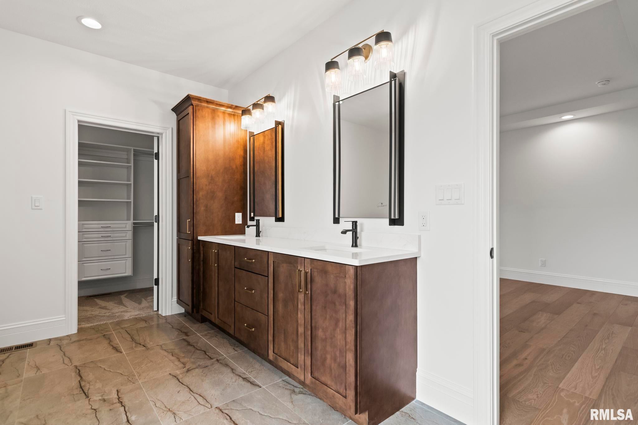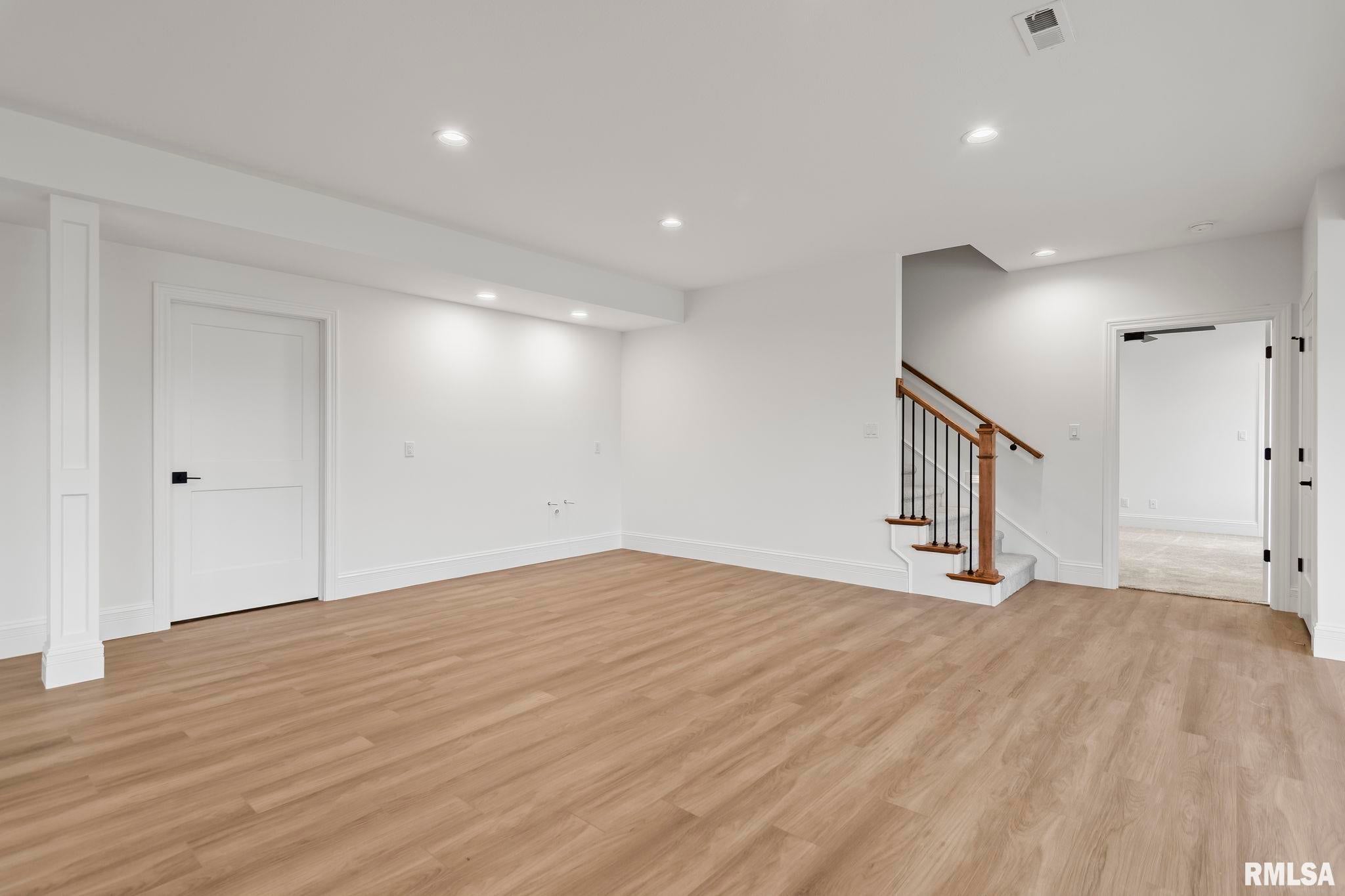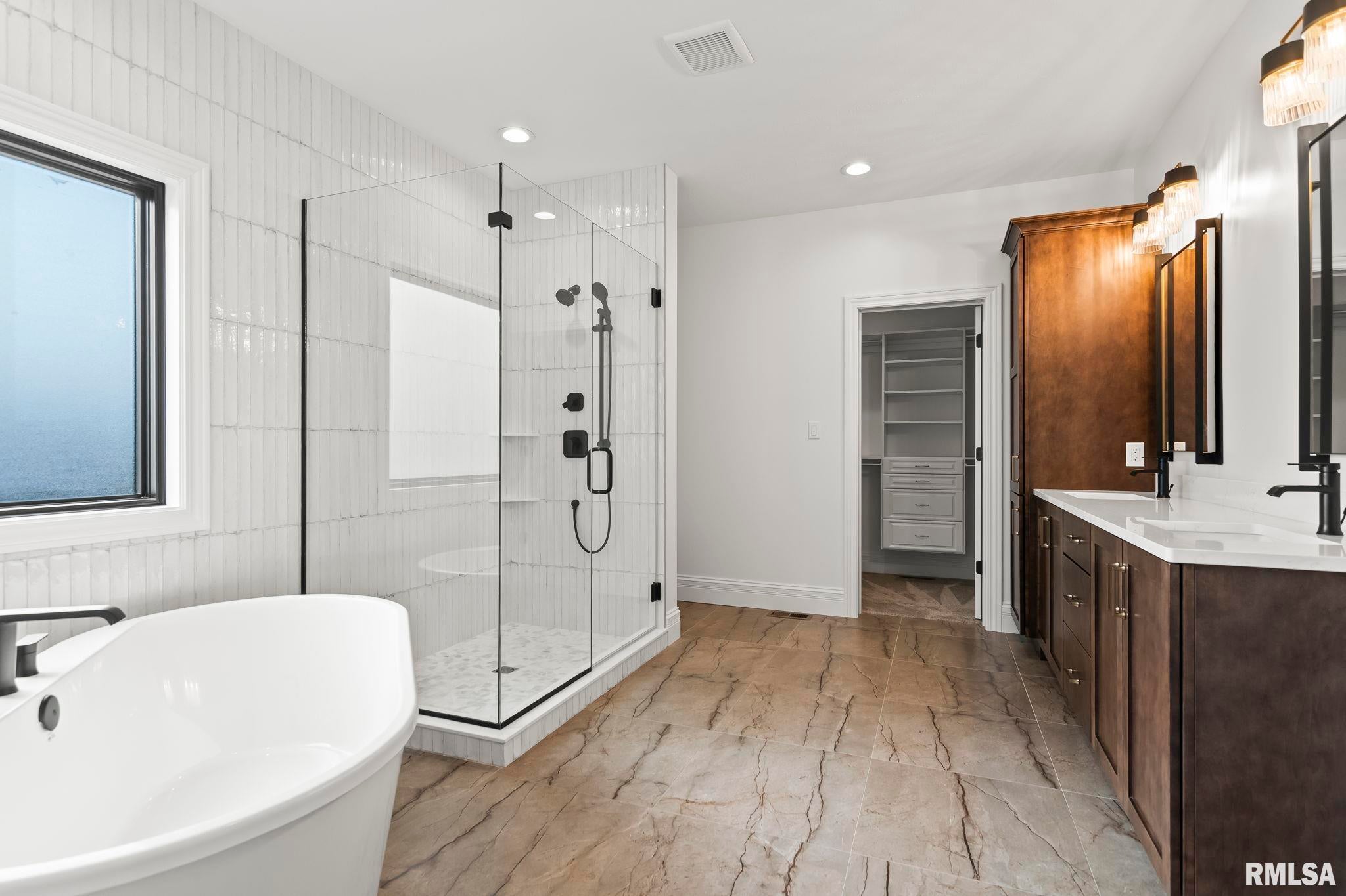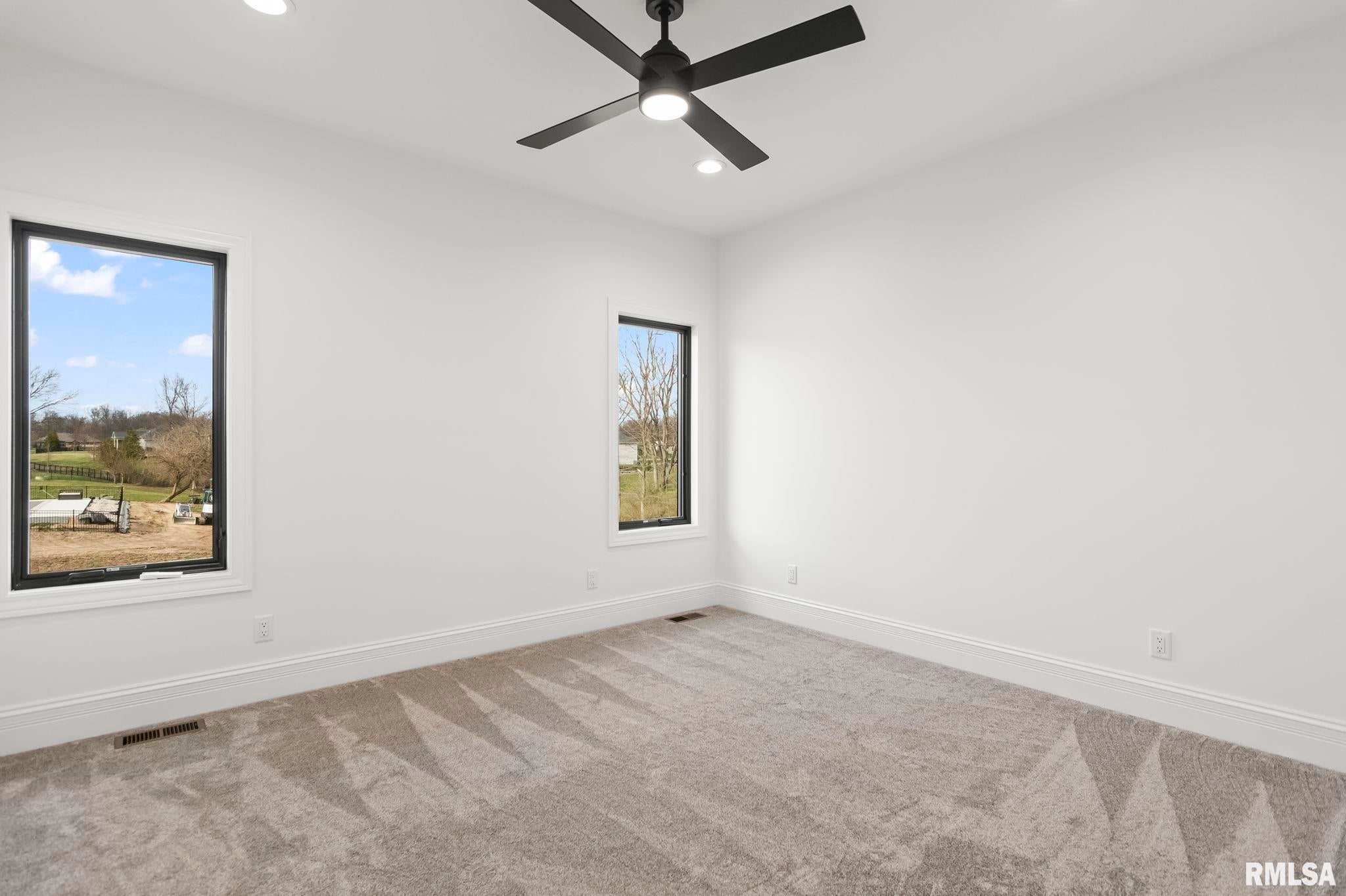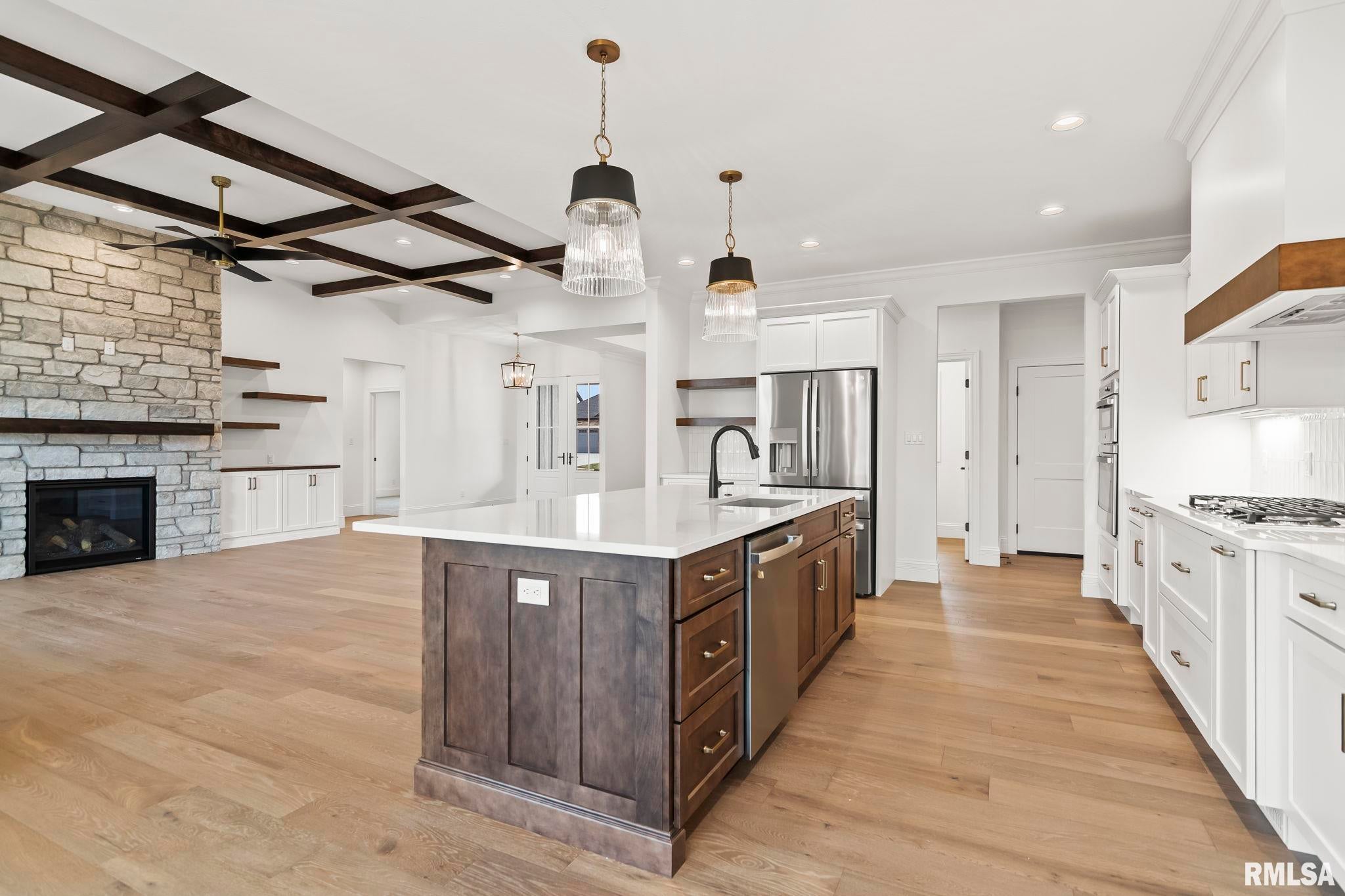Striking new construction in Iron Bridge Estates by Moughan Builders, featuring black vertical siding with warm cedar accents for standout curb appeal. This 5 bedroom, 3.5 bath home blends modern design with inviting, natural elements. The open concept floor plan offers light filled, airy spaces perfect for everyday living and entertaining. The living room showcases exposed wood beams for warmth and architectural interest. Entertain effortlessly in the kitchen, complete with an expansive quartz island and top of the line appliances, plus a hidden custom walk-in pantry discreetly tucked behind false cabinetry for a sleek, seamless look. Designer selected finishes shine throughout with clean lines, stylish fixtures, and high end touches that create a polished yet comfortable feel. A convenient drop zone leads to the 3 car garage, adding everyday functionality. The walkout basement expands your living space and opens to serene green space, providing a peaceful, picturesque backdrop. The primary suite is a true retreat, featuring a spa like bath with freestanding tub, floor to ceiling tile, and a custom walk-in closet connecting directly to the laundry room. Located on the north side of Chatham in the Chatham School District, with easy access to Springfield, this home perfectly blends modern style with everyday comfort.
