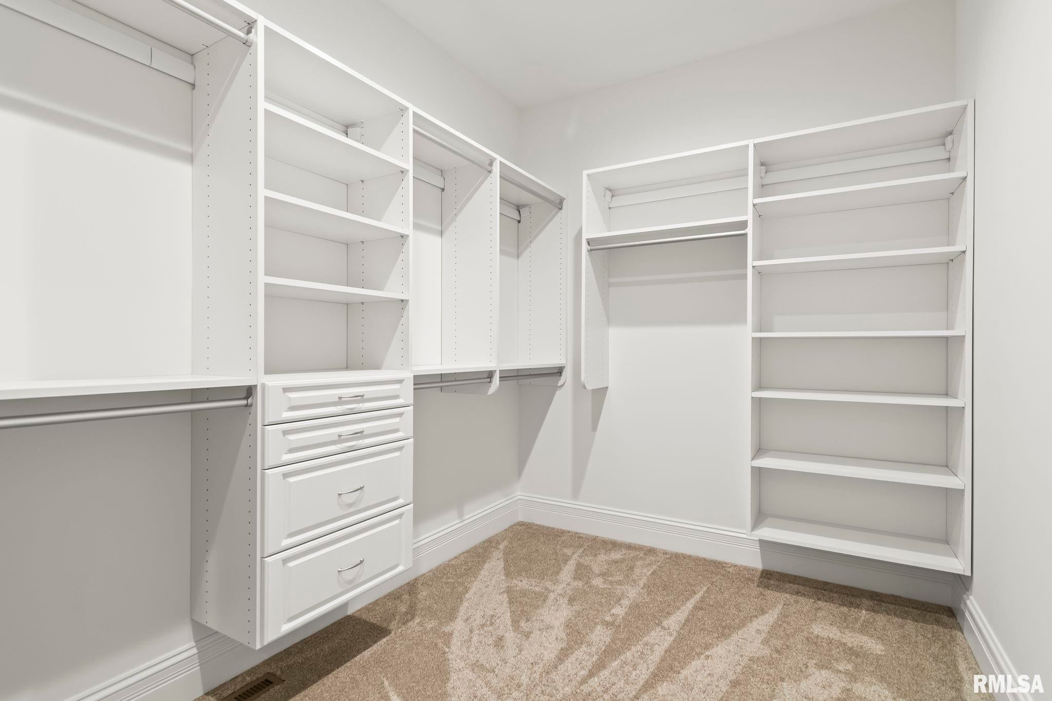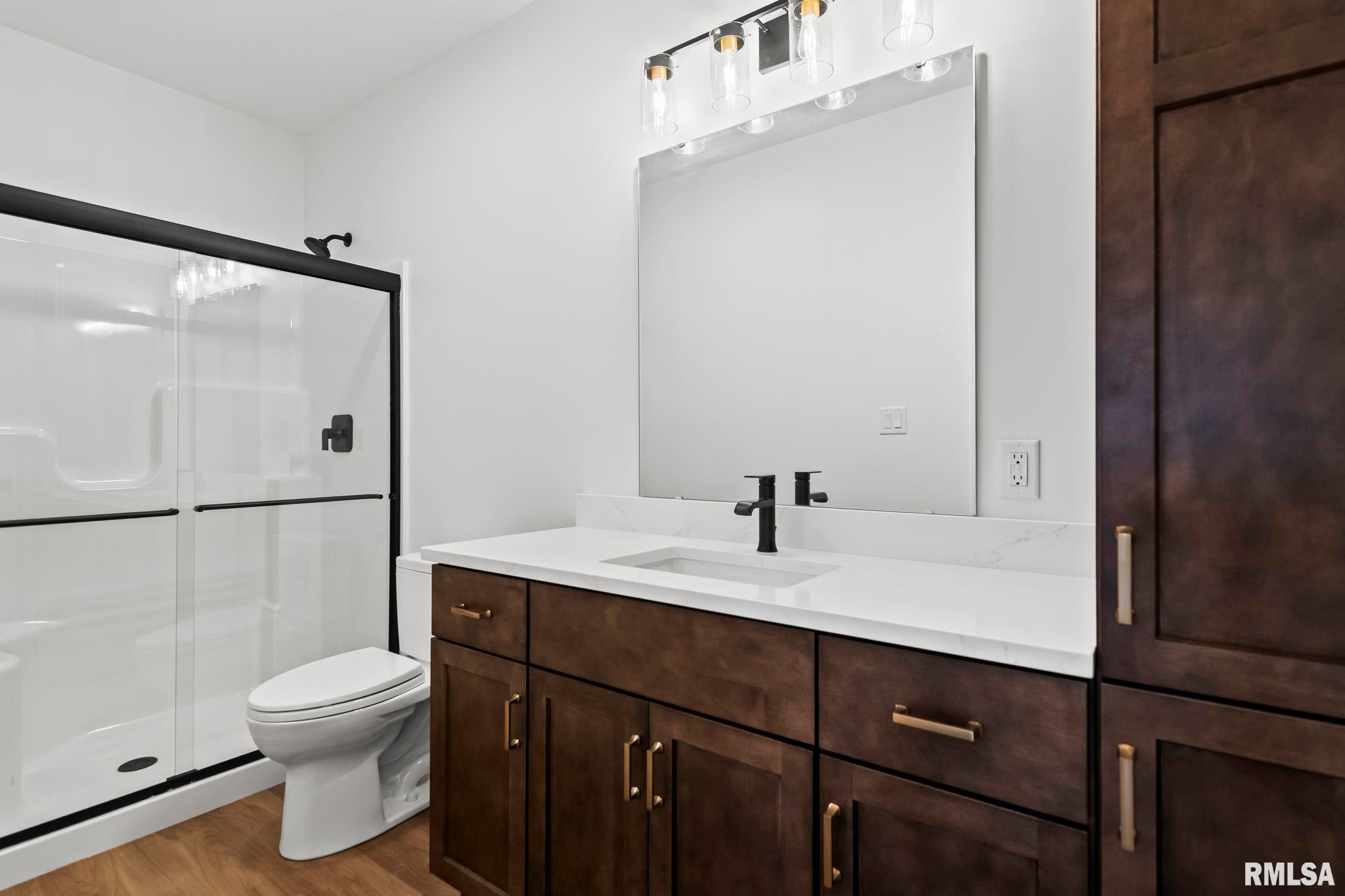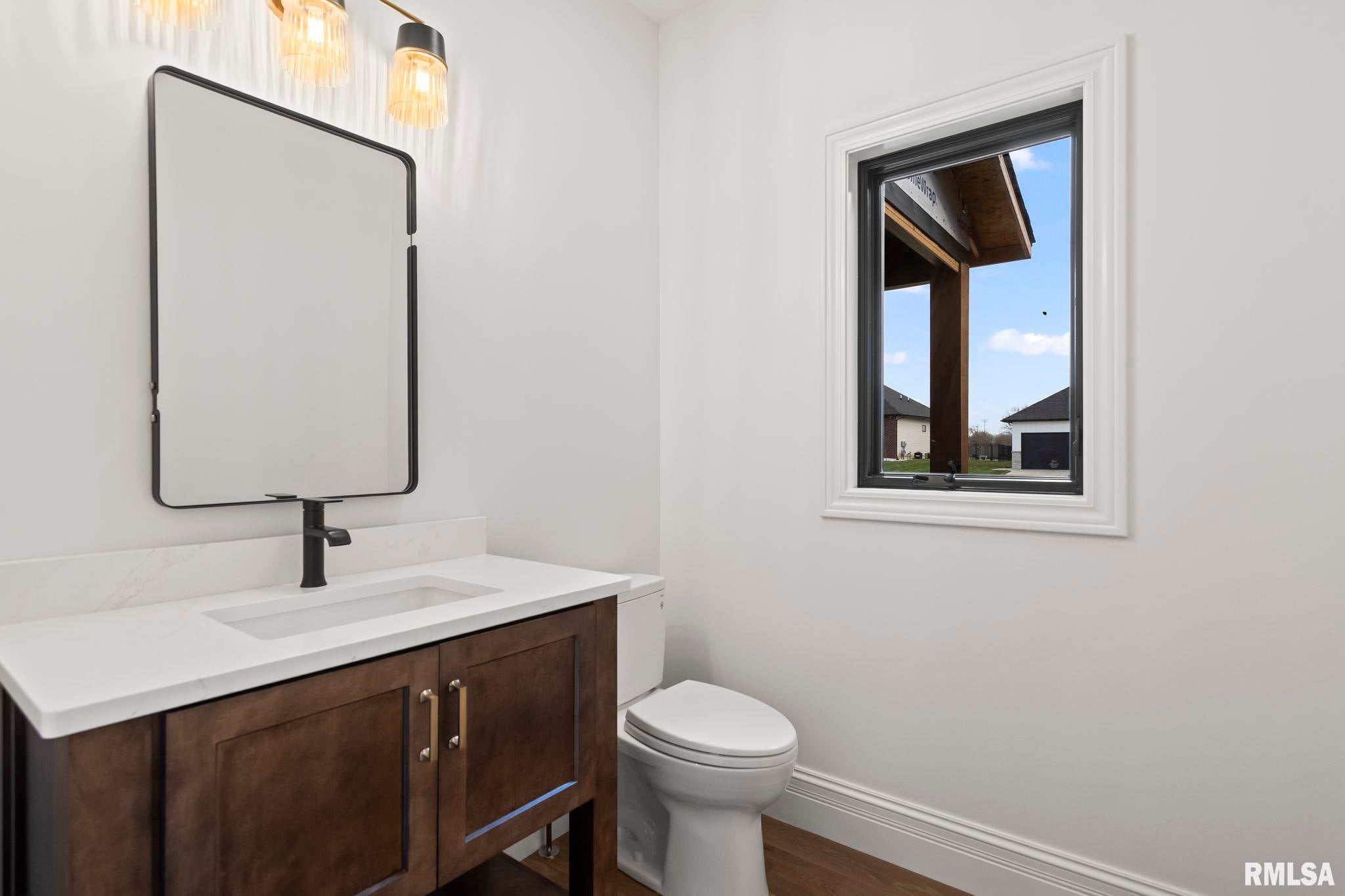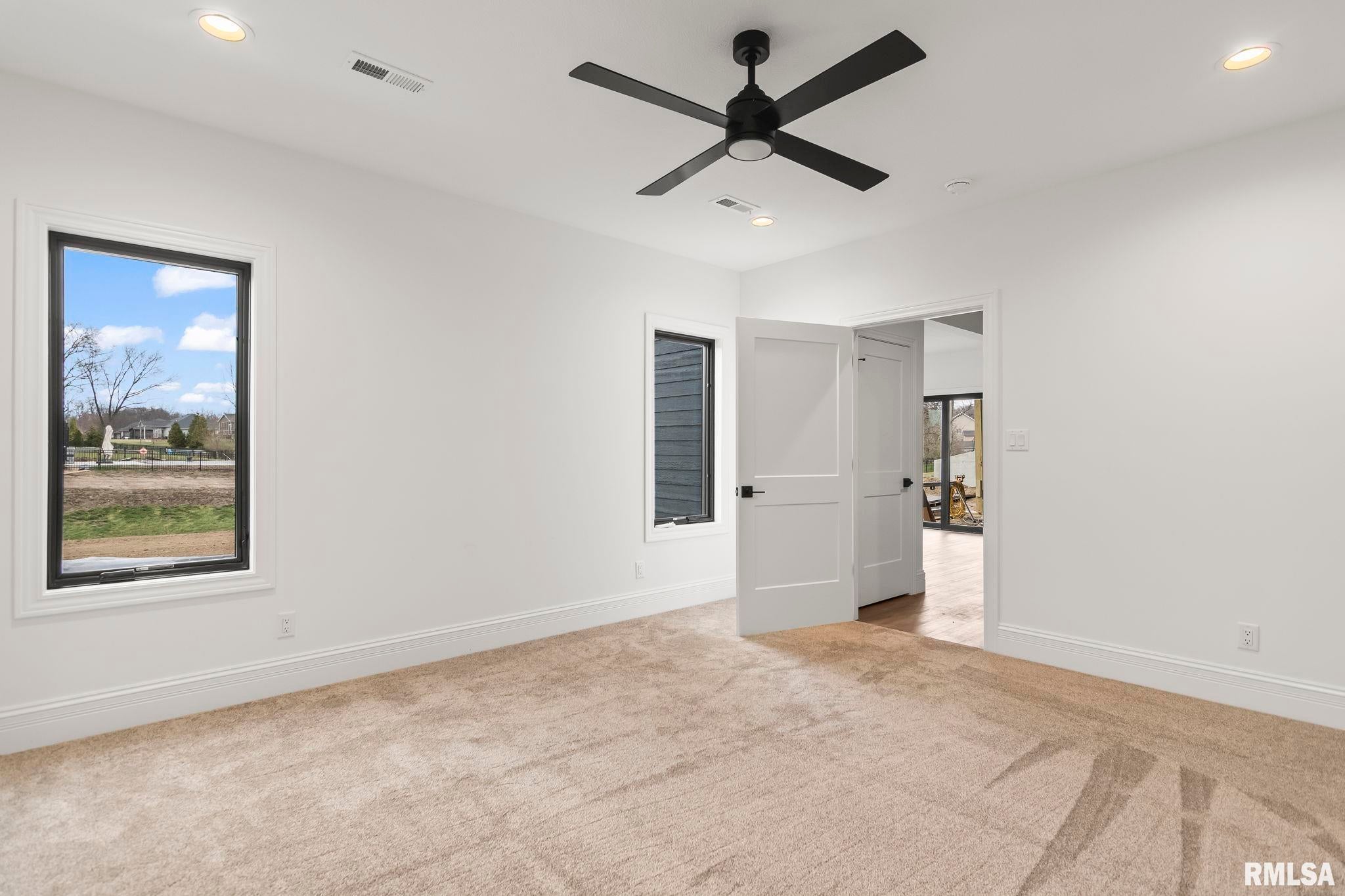 Striking new construction in Iron Bridge Estates by Moughan Builders, featuring black vertical siding with warm cedar accents for standout curb appeal. This 5 bedroom, 3.5 bath home blends modern design with inviting, natural elements. The open concept floor plan offers light filled, airy spaces perfect for everyday living and entertaining. The living room showcases exposed wood beams for warmth and architectural interest. Entertain effortlessly in the kitchen, complete with an expansive quartz island and top of the line appliances, plus a hidden custom walk-in pantry discreetly tucked behind false cabinetry for a sleek, seamless look. Designer selected finishes shine throughout with clean lines, stylish fixtures, and high end touches that create a polished yet comfortable feel. A convenient drop zone leads to the 3 car garage, adding everyday functionality. The walkout basement expands your living space and opens to serene green space, providing a peaceful, picturesque backdrop. The primary suite is a true retreat, featuring a spa like bath with freestanding tub, floor to ceiling tile, and a custom walk-in closet connecting directly to the laundry room. Located on the north side of Chatham in the Chatham School District, with easy access to Springfield, this home perfectly blends modern style with everyday comfort.