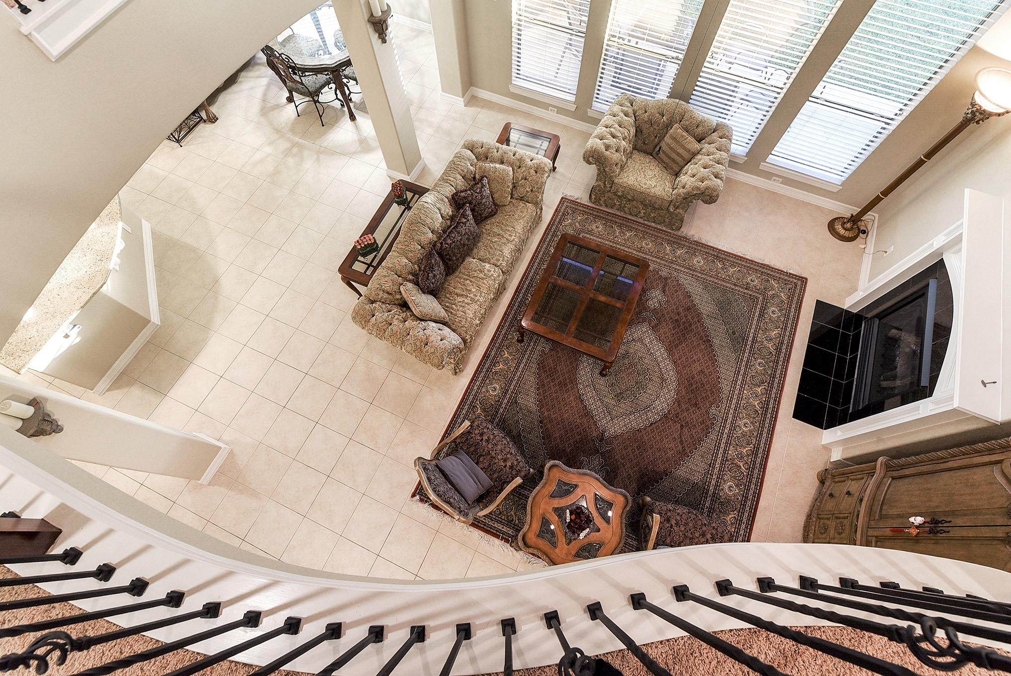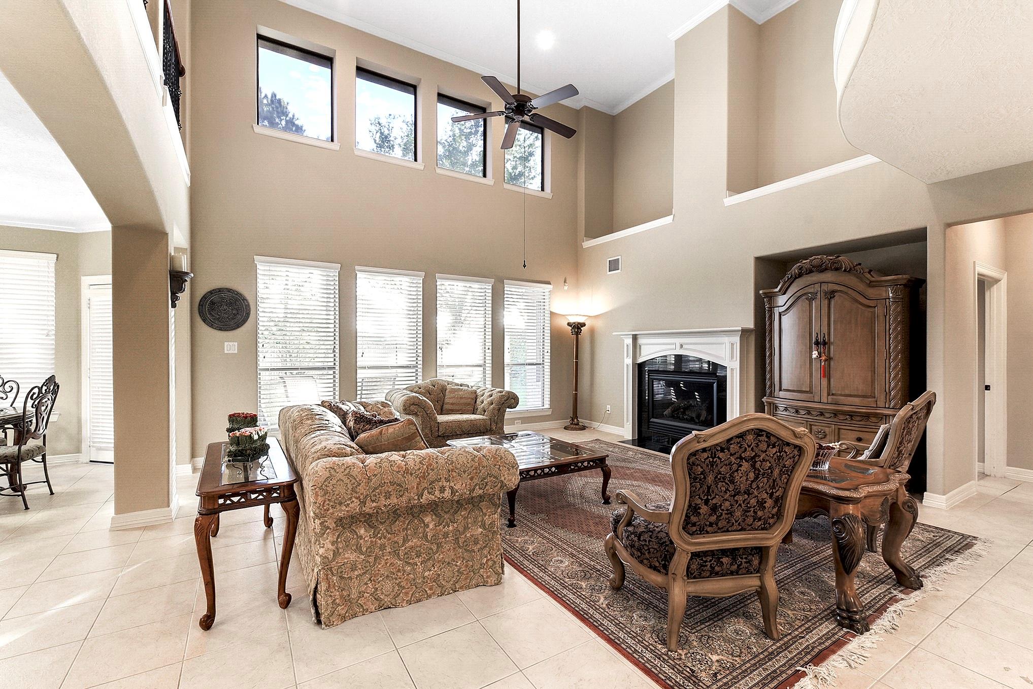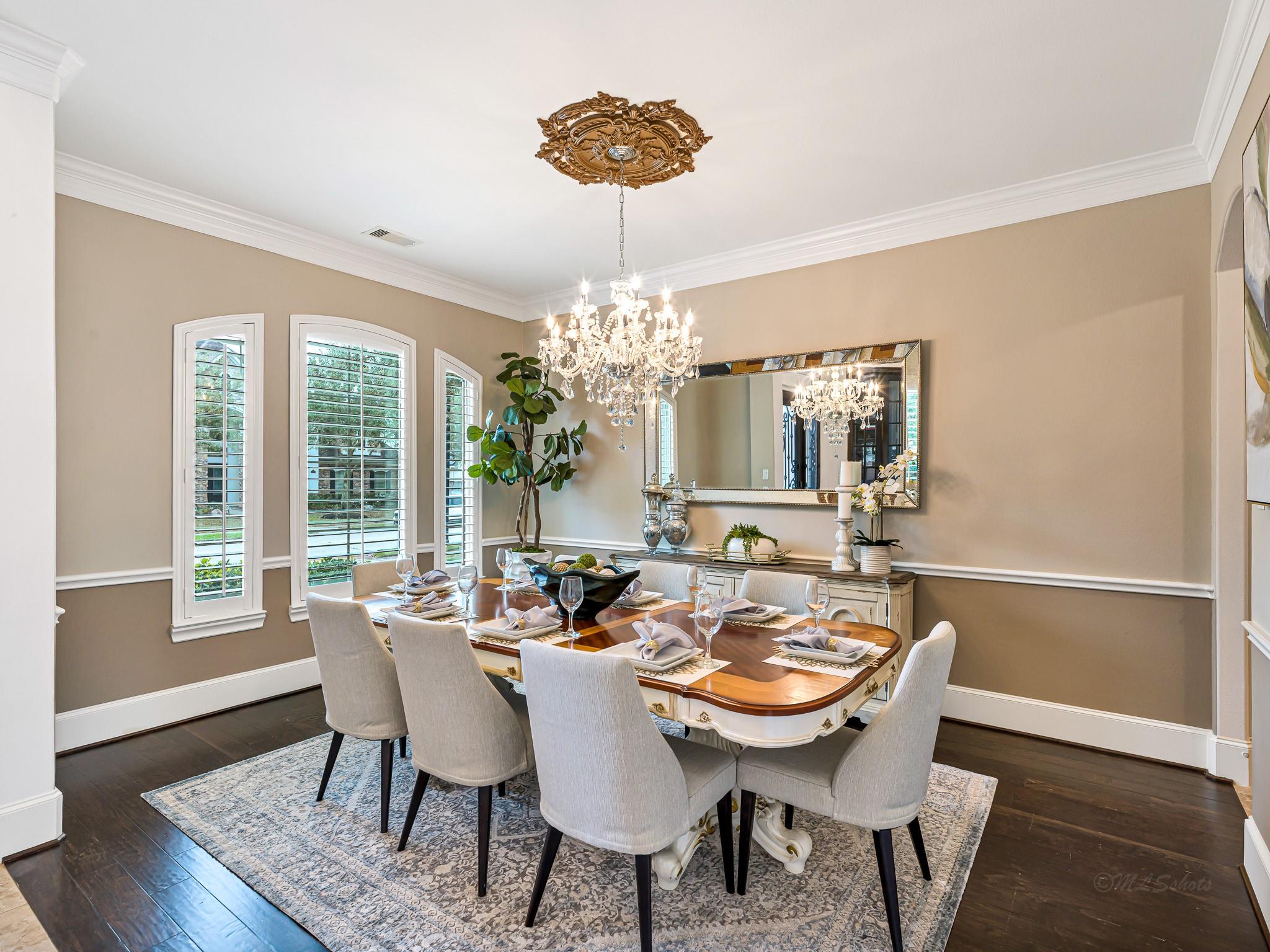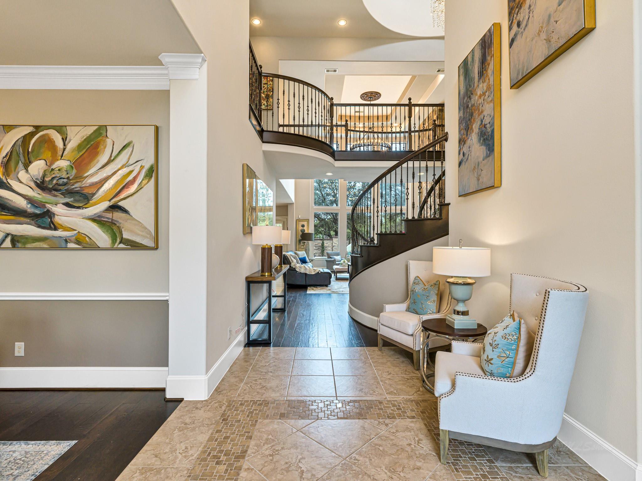 This grand two-story home offers breathtaking lake views. The extended foyer offers a warm welcome, featuring French doors that lead to a private home office and a formal dining room. The island kitchen seamlessly opens to a spacious living room with soaring ceilings, while the bright breakfast area is filled with natural light from numerous windows.