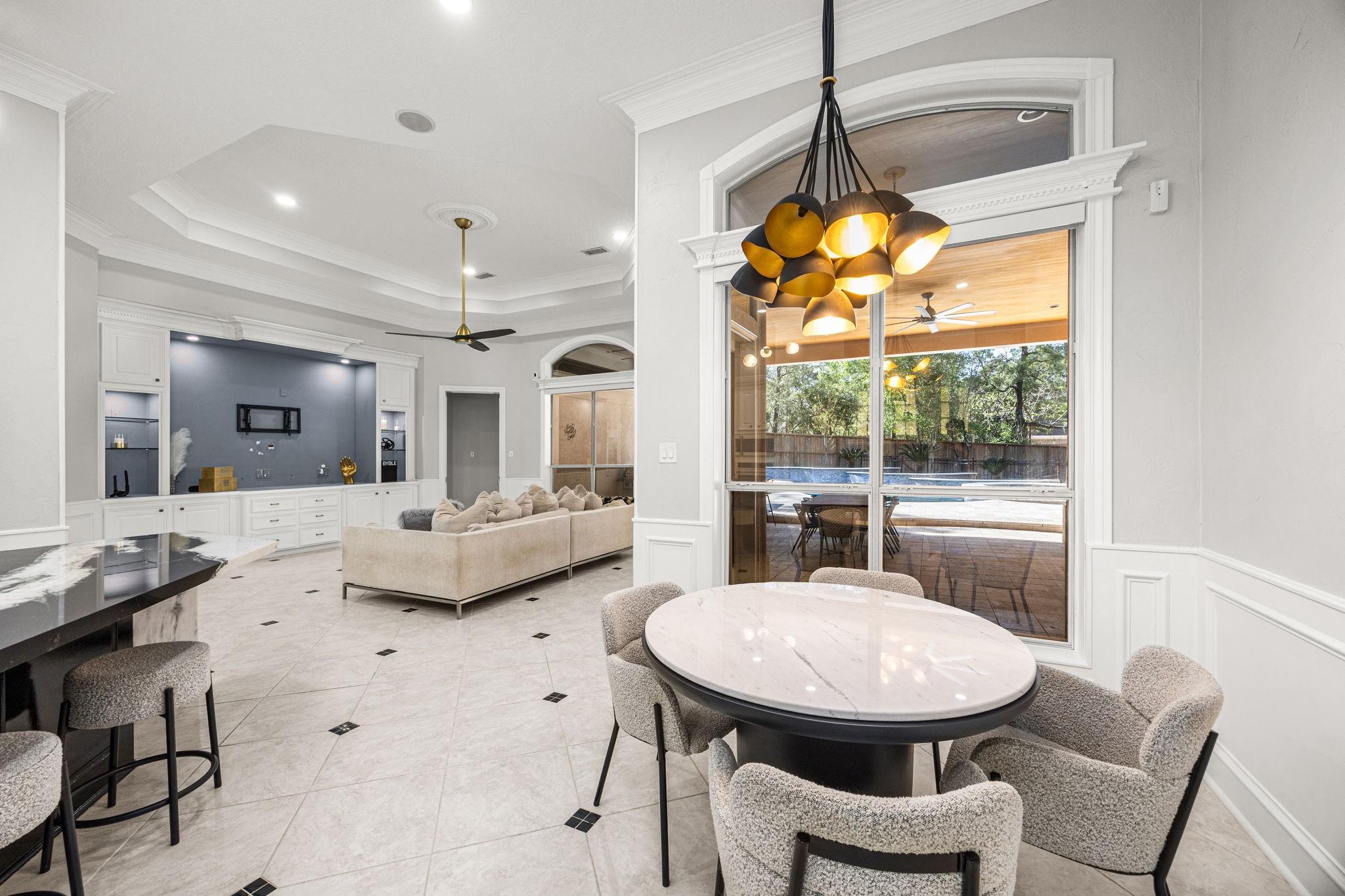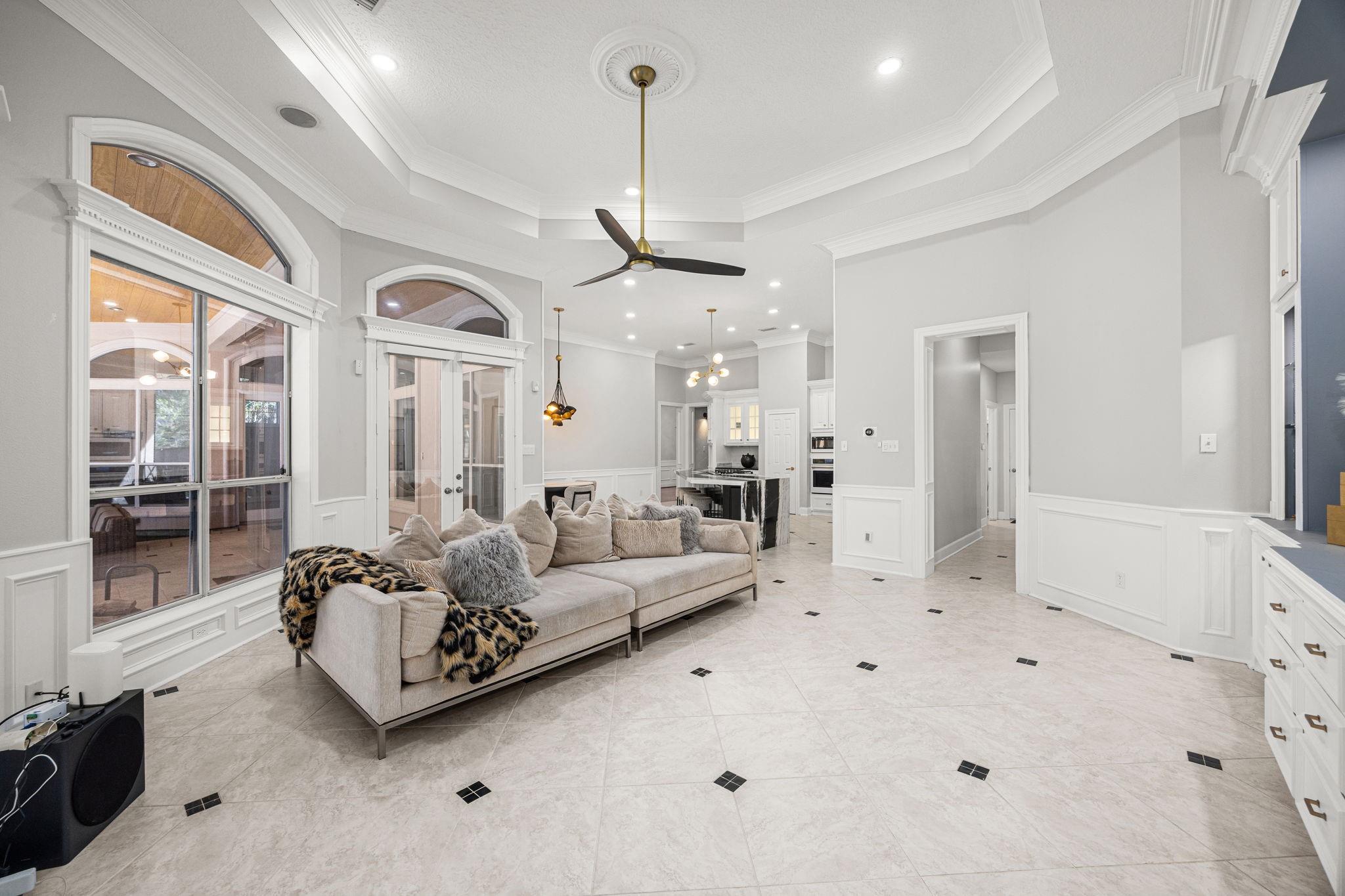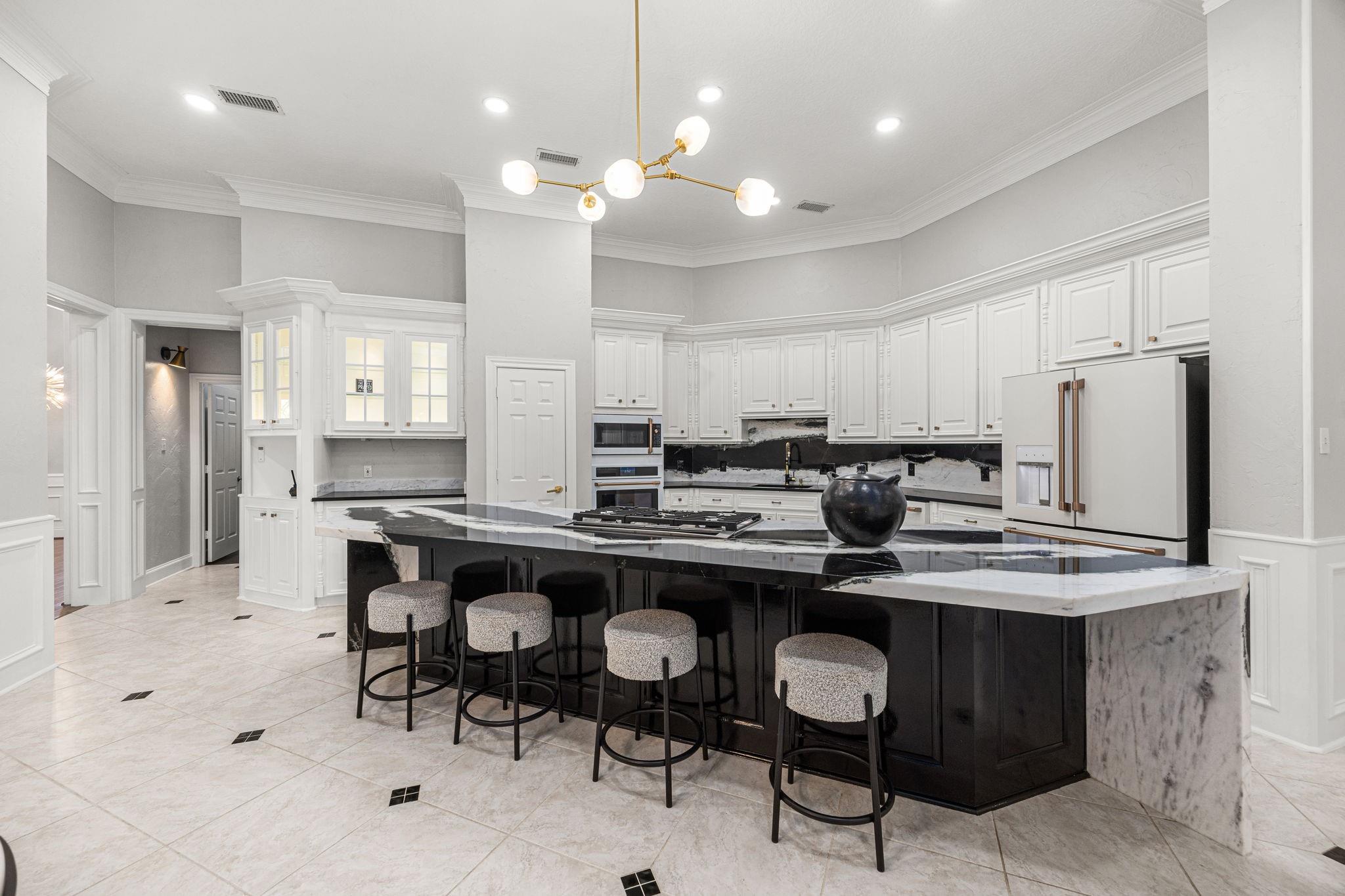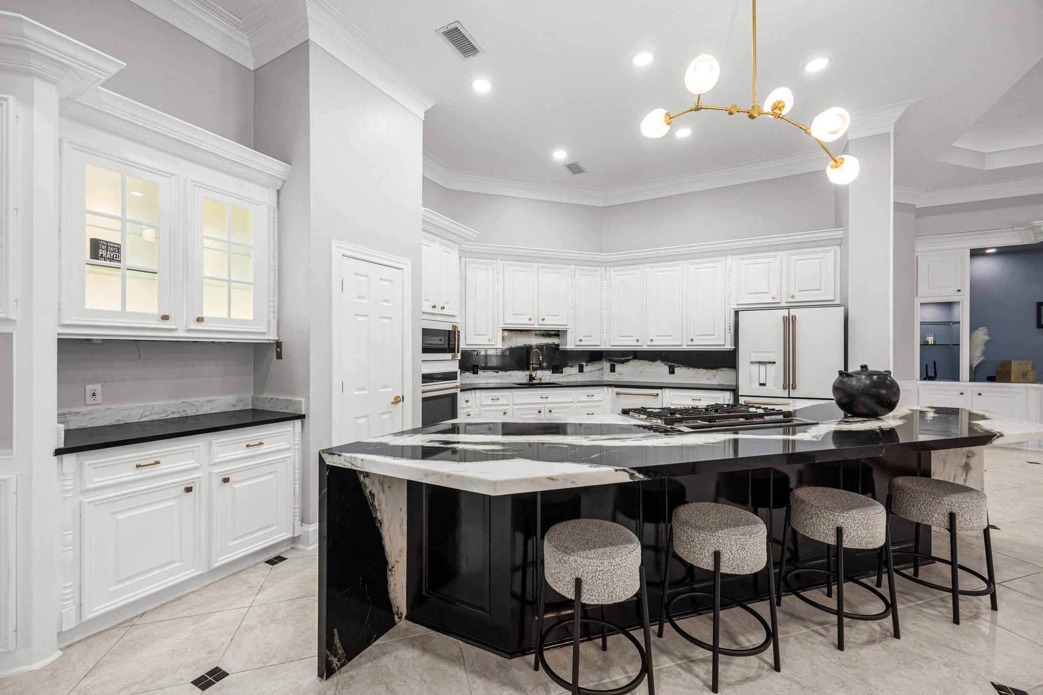 Completely remodeled custom home in Cochrans Crossing! Located in the heart of The Woodlands, this home features a brand new roof and gutters, 2 new Trane a/c units, 2 new water heaters, a new whole-house water softener and filtration system, all new engineered wood floors, new interior doors, designer light fixtures, sky-high ceilings, all new soft-close cabinetry and drawers, a 3-car garage w/epoxy floor and porte-cochere, and much more! Both formals open to one another, with a marble fireplace and coffered ceiling; the study is stunning with custom built-ins and faces the front of the home. Spectacular open kitchen with Taj Mahal leathered counters, a huge island, all new appliances (fridge included), a pot filler, and a warming drawer. Primary bedroom suite down with customized closet and breathtaking bath; 3 bedrooms with 2 remodeled baths and game room up with beverage fridge. The screened-in porch with a new summer kitchen overlooks the beautiful pool.