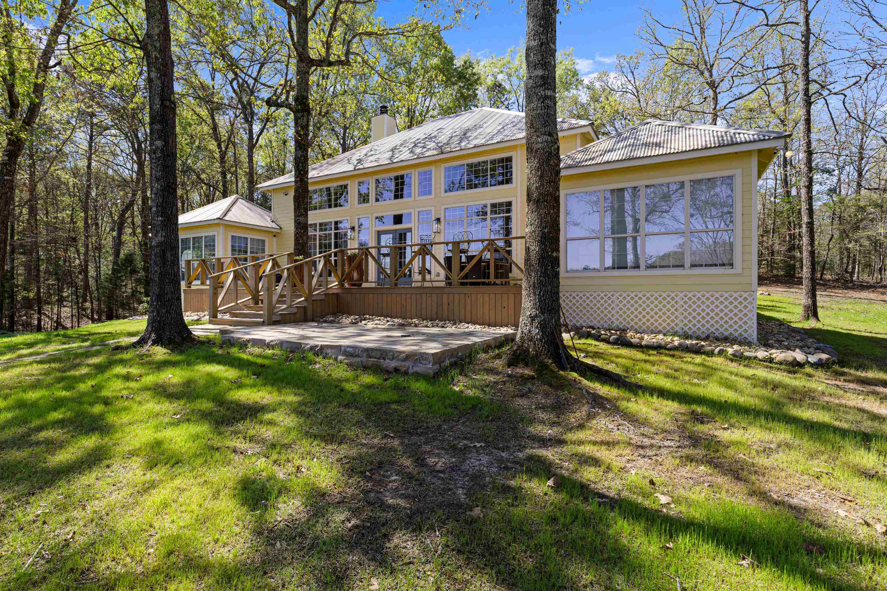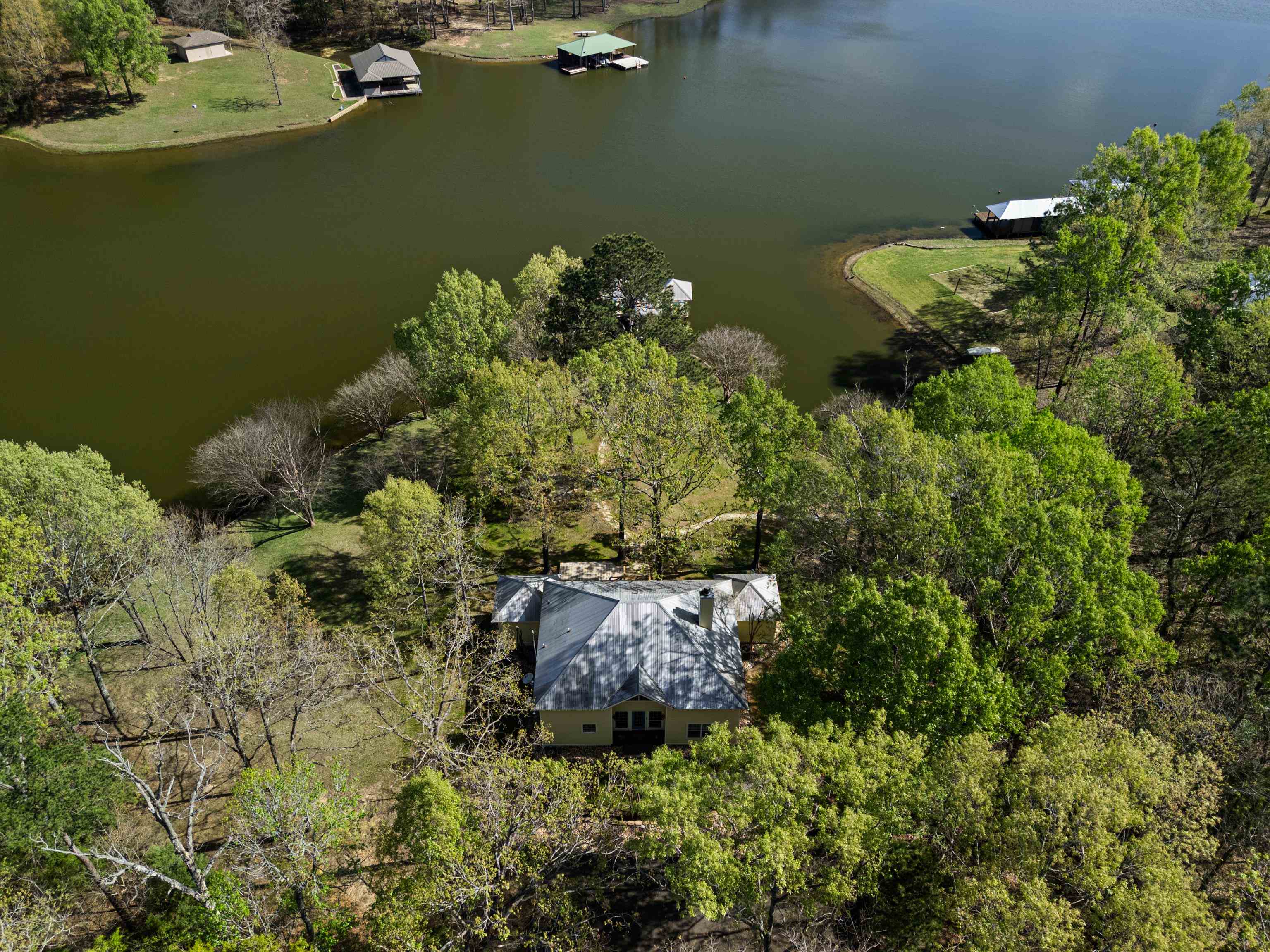 Perched atop one of the most desirable elevations in Cass County, this36- acre East Texas property offers expansive views of rolling terrain and stunning sunsets. The 4-bedroom, 3-bath brick home is nestled among mature oaks and features a thoughtful two-story layout designed to maximize natural light and scenery. The living area includes a soaring wooden cathedral ceiling, front bay windows overlooking the hills, fresh interior paint, and updated flooring. The kitchen and dining space provide abundant cabinetry, generous counter space, and panoramic views of the surrounding landscape. The primary suite offers a tray ceiling and custom barn doors, while the upper level includes a large flex room with extensive closet storage suitable for guests, hobbies, or a private retreat. Built-ins throughout the home add convenience and character. Located at the back of the property is a 1,920 sq ft rustic guest home, constructed with cedar-lined walls, ceilings, and cabinetry. This additional 4-bedroom, 3-bath structure offers versatility for multi-generational living, rental income, or guest accommodations. Exterior features include multiple storage buildings, fenced areas, covered pens, garden space, and open acreage suitable for livestock or agricultural use. A commercial gravel operation located on the north end of the property conveys with the sale, providing potential income and added investment value. With elevated views, rolling topography, and a peaceful setting, this property offers a unique opportunity for residential living, recreation, and income-producing potential.