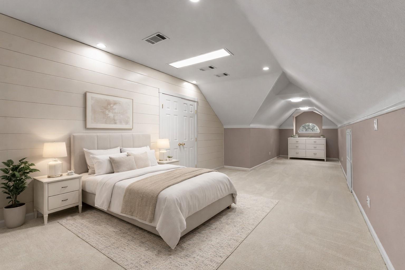 Set in a quiet, low-traffic pocket of Graystone Hills and positioned inside the neighborhood away from main entry roads, this 4-bedroom, 3.5-bath home offers 4,174 sq ft with an open layout and a two-story family room with natural light from expansive windows. The primary suite is downstairs, with three bedrooms and a game room upstairs that opens to a second-floor patio capturing the sun for morning coffee, along with the covered patio outside the breakfast area. The fenced backyard includes a covered outdoor kitchen and a patio that flows into a kitchen-cottage-style garden with fruit trees, roses, bougainvillea, fragrant shrubs, almond verbena, and a treed back corner with mature oaks and cedar providing natural shade. Indoors, two gas fireplaces add warmth, including a three-sided fireplace in the primary suite. A 3-car tandem garage and double-wide driveway provide ample parking, with nearby access to the Graystone Hills park trail and routes to Hwy 105, I-45, and Downtown Conroe.