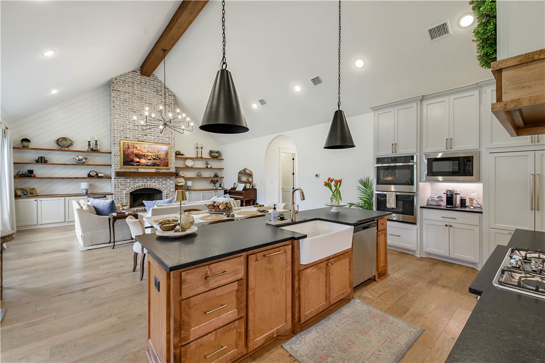 Welcome to this stunning 5-bedroom, 4.5-bathroom Schaefer Custom Home. The home is nestled on 1.42 acres, offering 4664 sq ft of beautifully designed living space. This property blends functionality, comfort, and luxury - inside and out. In the main downstairs living space, you'll find two spacious living rooms, two dining areas, and a dedicated office with a wall of bookshelves. The chef's kitchen is a dream with double islands, double ovens, a pot filler, and a generous walk-in pantry - all designed to make everyday cooking and entertaining a breeze. The private upstairs retreat offers an ideal space for guests, complete with it's own kitchenette, sleeping quarters, living area, closet, and full bathroom - a perfect blend of comfort and independence. Escape to the private primary suite, that allows direct access to the back porch, and enjoy the spa-like en suite bath. A large secondary suite is enhanced by ramped porch access and its own full bathroom, which provides comfort and privacy for extended stays or multi-generational living. Step outside to the expansive covered back porch using one of the four access points, creating a truly seamless indoor-outdoor flow. The outdoor living area features an outdoor kitchen, great for hosting gatherings or enjoying a peaceful evening overlooking the open backyard, that includes a stone fire-pit. Storage is not a problem with the two walk-in attic spaces. Space, style, and substance in one extraordinary package.
