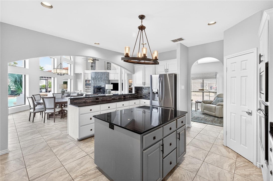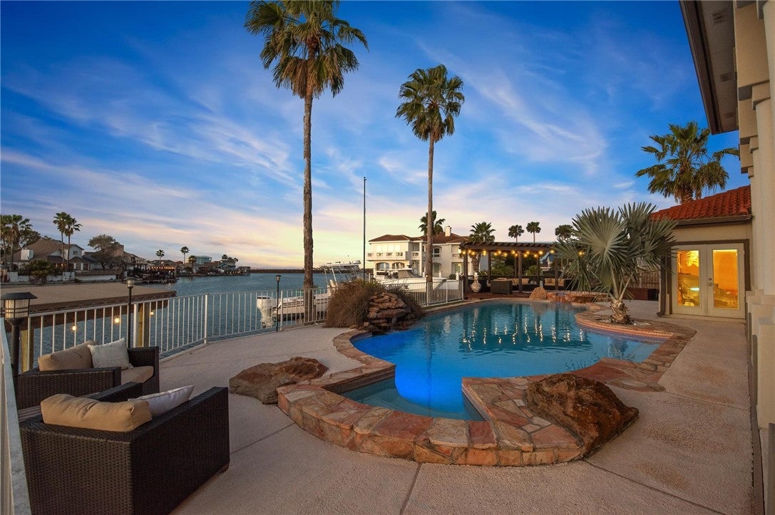 Indulge in coastal luxury living at its finest with this stunning canal-front home nestled in the prestigious gated community of Cane Harbor. Step inside and be captivated by the exquisite craftsmanship showcased throughout. The heart of the home lies in the remodeled gourmet kitchen, where every culinary desire is met with state-of-the-art appliances, custom cabinetry, and Taj Mahal granite countertops. Entertaining is a breeze with the seamless flow from the kitchen to the outdoor paradise. Outside, discover your own private oasis featuring an outdoor kitchen, perfect for al fresco dining under the Texas stars. Take a dip in the sparkling pool or set sail from your private boat lift for a day of adventure on the water. With spacious living areas, luxurious bedrooms including the primary suite on the main floor, this canal-front retreat offers the ultimate blend of comfort and sophistication. Dont miss your chance to experience the coastal lifestyle youve always dreamed of!