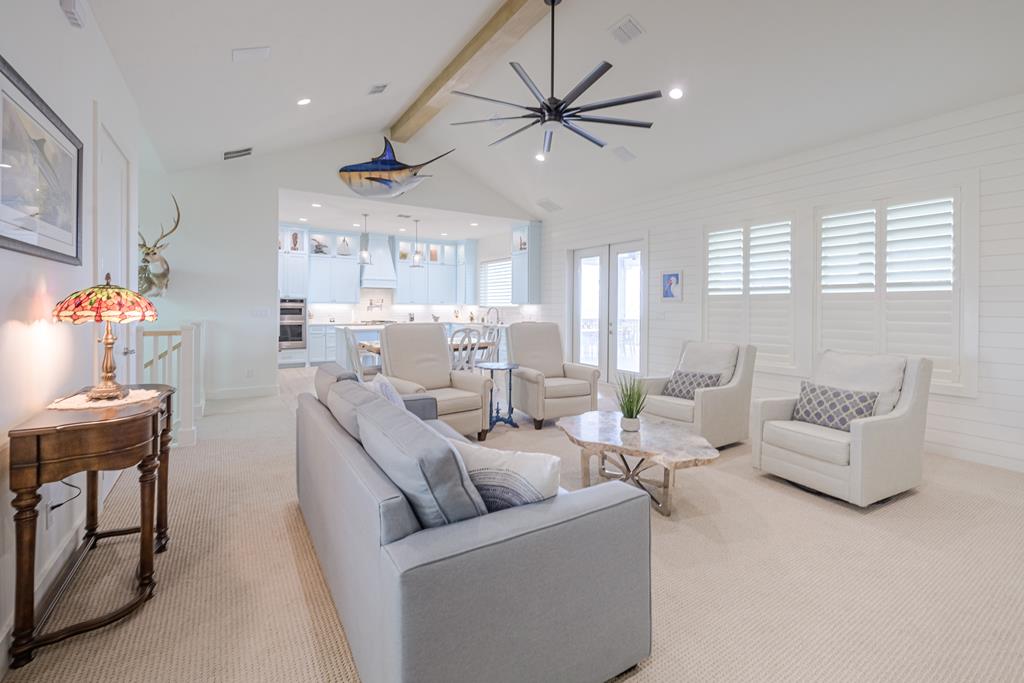 Coastal Luxury Meets Everyday Comfort! This stunning waterfront home offered partially furnished blends coastal elegance with modern comfort, designed to take full advantage of its serene setting and sweeping water views. The open floor plan welcomes you into a great room enhanced with shiplap walls, plantation shutters, and an abundance of natural light.