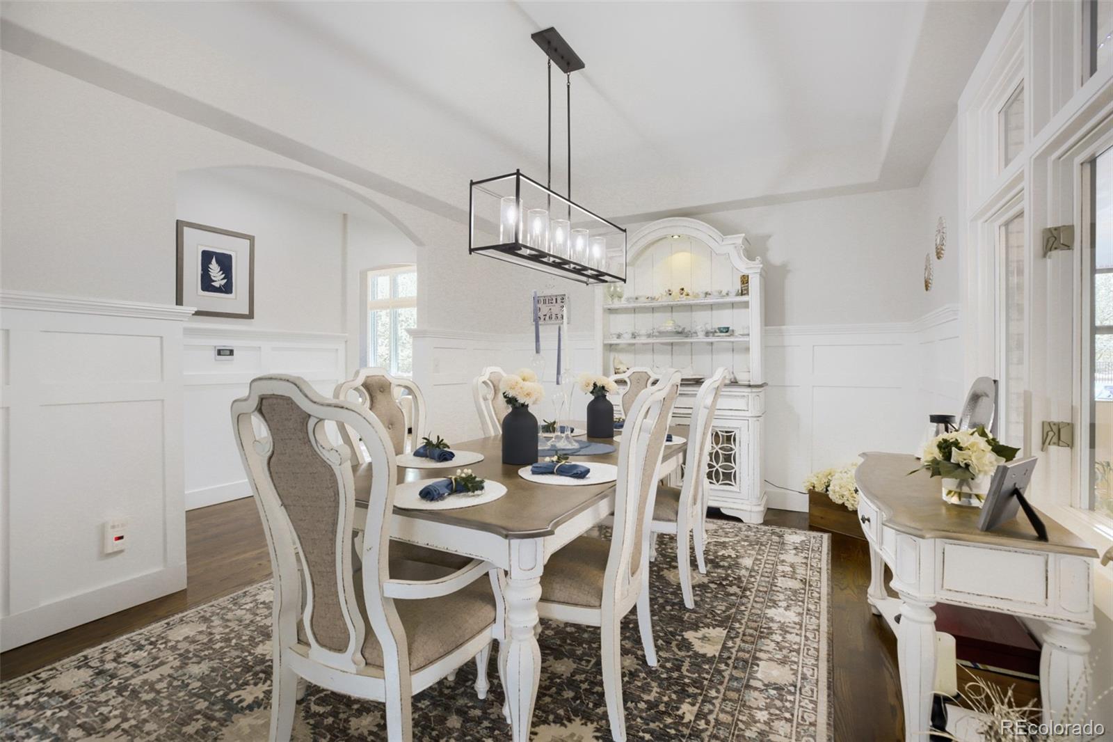 Welcome to 15385 King Ct, a stunning residence in Broomfield where professionally designed interiors, thoughtful upgrades, & panoramic mountain views come together. Every space has been elevated w/ custom interior designer finishesfrom curated lighting & custom wainscoting to 10-in baseboards & skip trowel wall texture. Picture yourself hosting in the chefs kitchen featuring paneled appliances, Ilve range, custom island w/ built-in charging drawer, appliance garage w/ disappearing doors, wet bar, & customized pantry complete w/ a coffee & tea station, 2nd dishwasher, warming drawer, wine fridge, instant hot water, & rolling ladder. The dining space showcases a custom built-in china cabinet & sliding glass wall to patio w/ views. The great room features a coffered ceiling, fireplace, & windows framing the Front Range. The study includes a stained alder ceiling, built-ins, & an included safe. Upstairs the primary suite offers its own fireplace w/ built-ins, custom designer closet, & spa-like bathroom w/ a steam shower w/ dual shower heads, rain feature, & makeup vanity w/ ample storage. The custom laundry room includes shiplap, steam closet, built-in drying rack & pull-out ironing board. Additional highlights include designer wallpaper in secondary bedrooms & a moody upper-level movie room. The finished basement includes a custom bar w/ gold detailing, built-in booth seating, fireplace, & custom built-ins. Main-level gym or 6th bedroom located off the mudroom, featuring removable flooring that reveals hardwood beneath. The mudroom includes custom lockers, while the oversized garage is heated. Enjoy outdoor living w/ custom pavers, mature landscaping, water feature, & heated patio & covered deck off the primary. Additional upgrades include paid solar, central vacuum, remote-controlled shades, whole-house water filtration, leak detection at every valve, & remote water shutoff capabilityoffering efficiency & peace of mind. This stunning designer home is one of a kind.