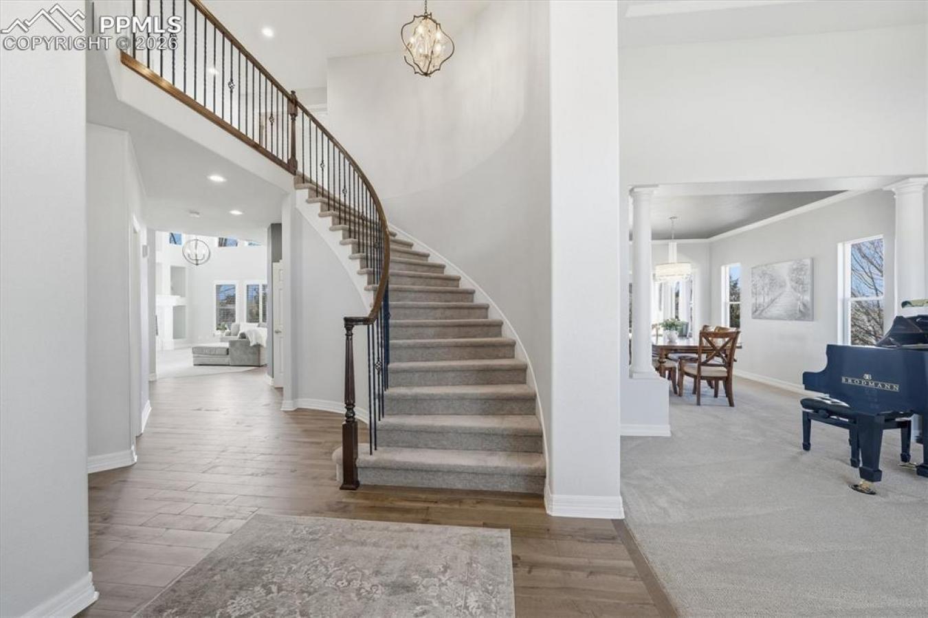 This home checks every box: mountain views, cul-de-sac location, and a rare .41-acre lot in Soaring Eagle Estates. Welcome to 3813 Sky Hawk Court, where space, style, and flexibility come together in one exceptional Castle Rock home. As you step inside, a grand curved staircase, new carpet, and beautiful hardwood floors greet you, establishing the tone for whats to come.