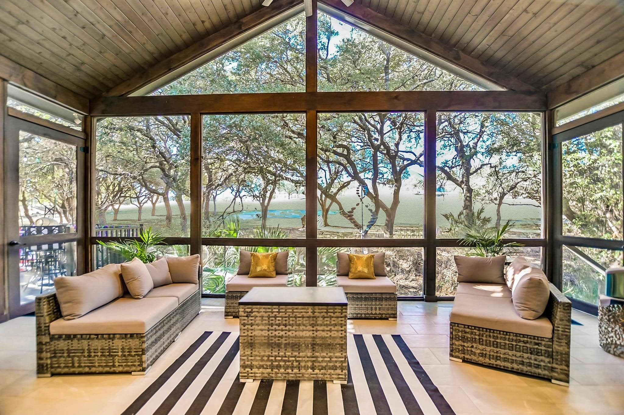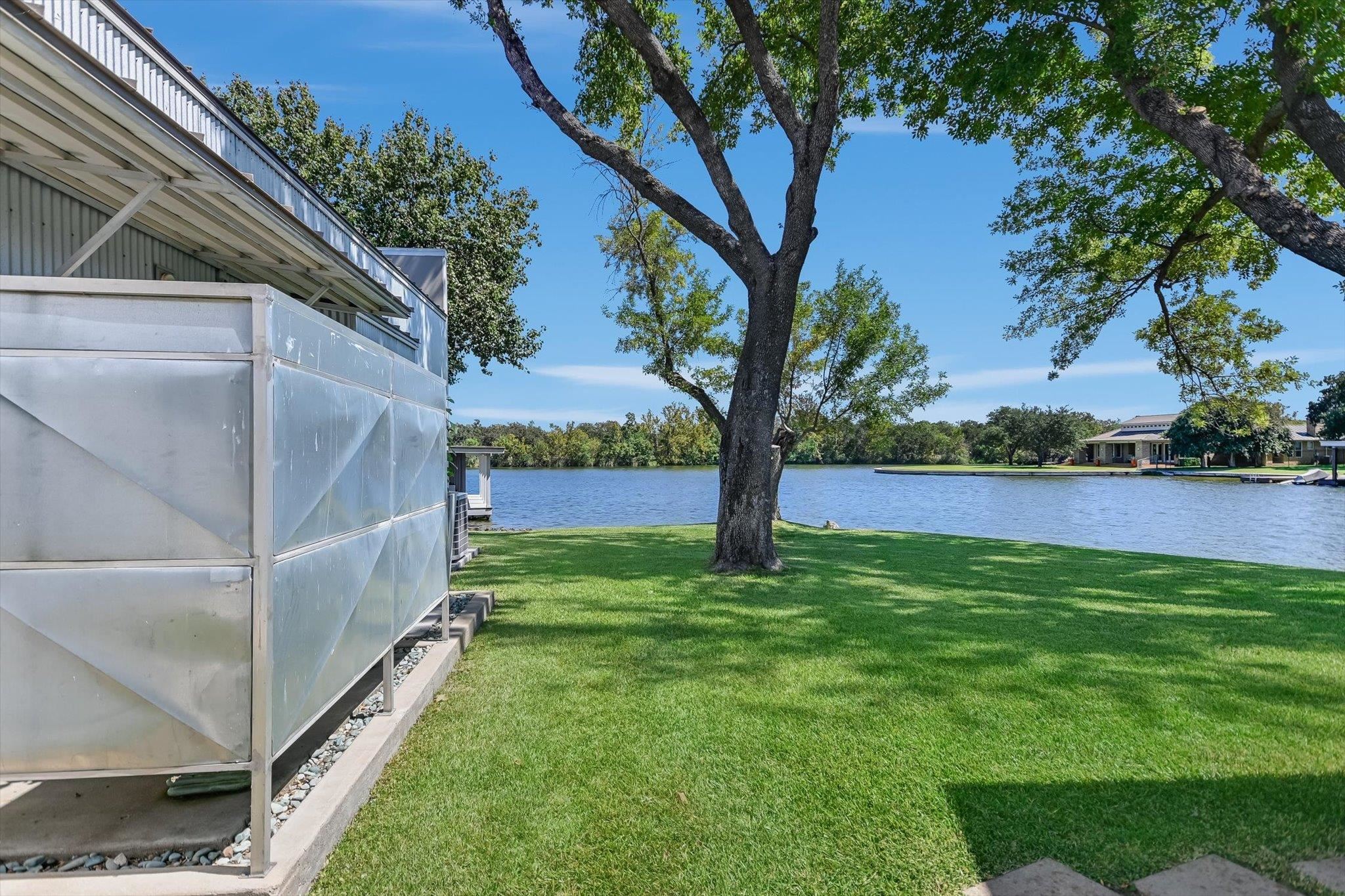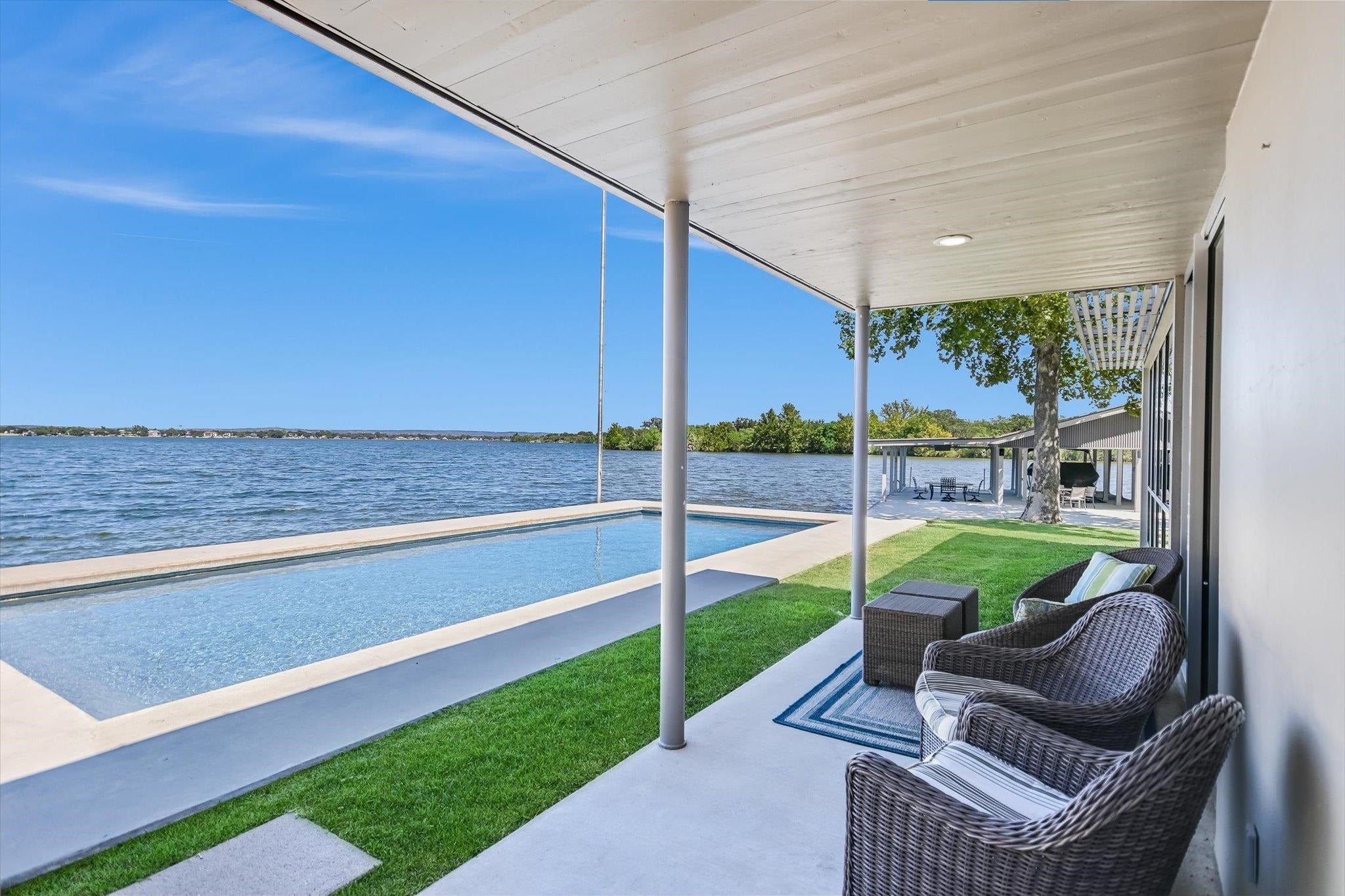 Welcome to 317 Scenic Dr., an exceptional waterfront property offering 287 of constant-level Lake LBJ shoreline in Oak Ridge Estates. Set on two expansive lots totaling 0.71 acres, the property is framed by mature trees and a gently curving shoreline. The dual-lot configuration enhances property value and provides space for future expansion or additional structures. Vacant land across the cove is LCRA-owned, preserving the peaceful setting and views from the property. A private drive introduces the residence, where clean architectural lines and walls of glass frame uninterrupted lake views. The main living spaces are filled with natural light and anchored by new luxury vinyl plank flooring. The main house features two spacious ensuite bedrooms and 2.5 baths, along with open kitchen, dining, and living areas designed for relaxed lakefront living. A detached bunkhouse offers two additional bedrooms with a Jack & Jill bath, comfortably accommodating up to eight guests. Outdoor living defines the experience. A lakeside pool sits just steps from the shoreline, while patios and shaded seating areas create inviting spaces for lounging. The expansive boat dock features two covered boat slips with lifts, two PWC lifts, a spacious lounging deck, and storage room, functioning like a private waterfront pavilion with effortless access to Lake LBJ open water. 317 Scenic Dr. presents a rare opportunity to create an extraordinary waterfront retreat on a homesite defined by privacy, Hill Country and open-water views.