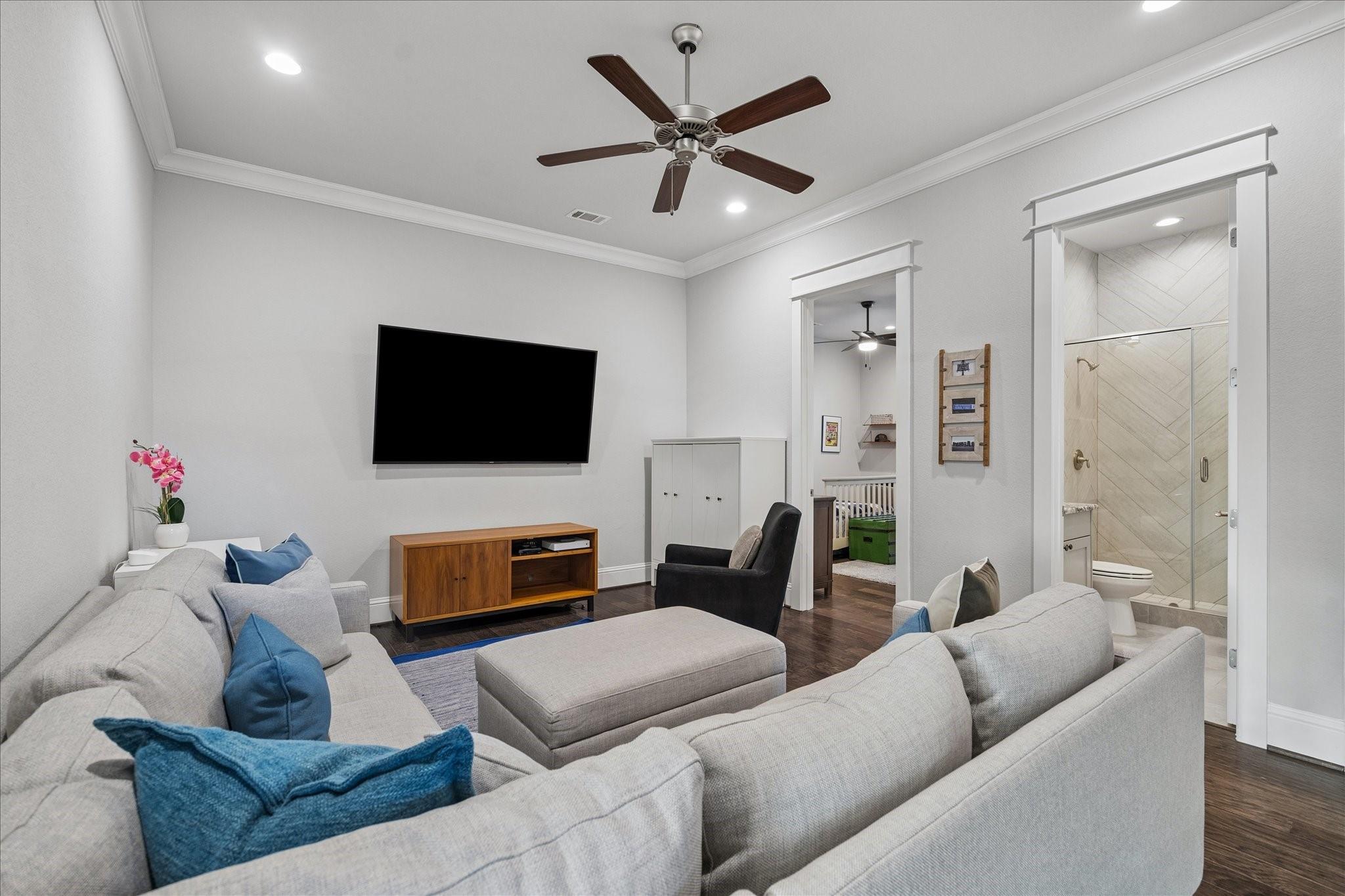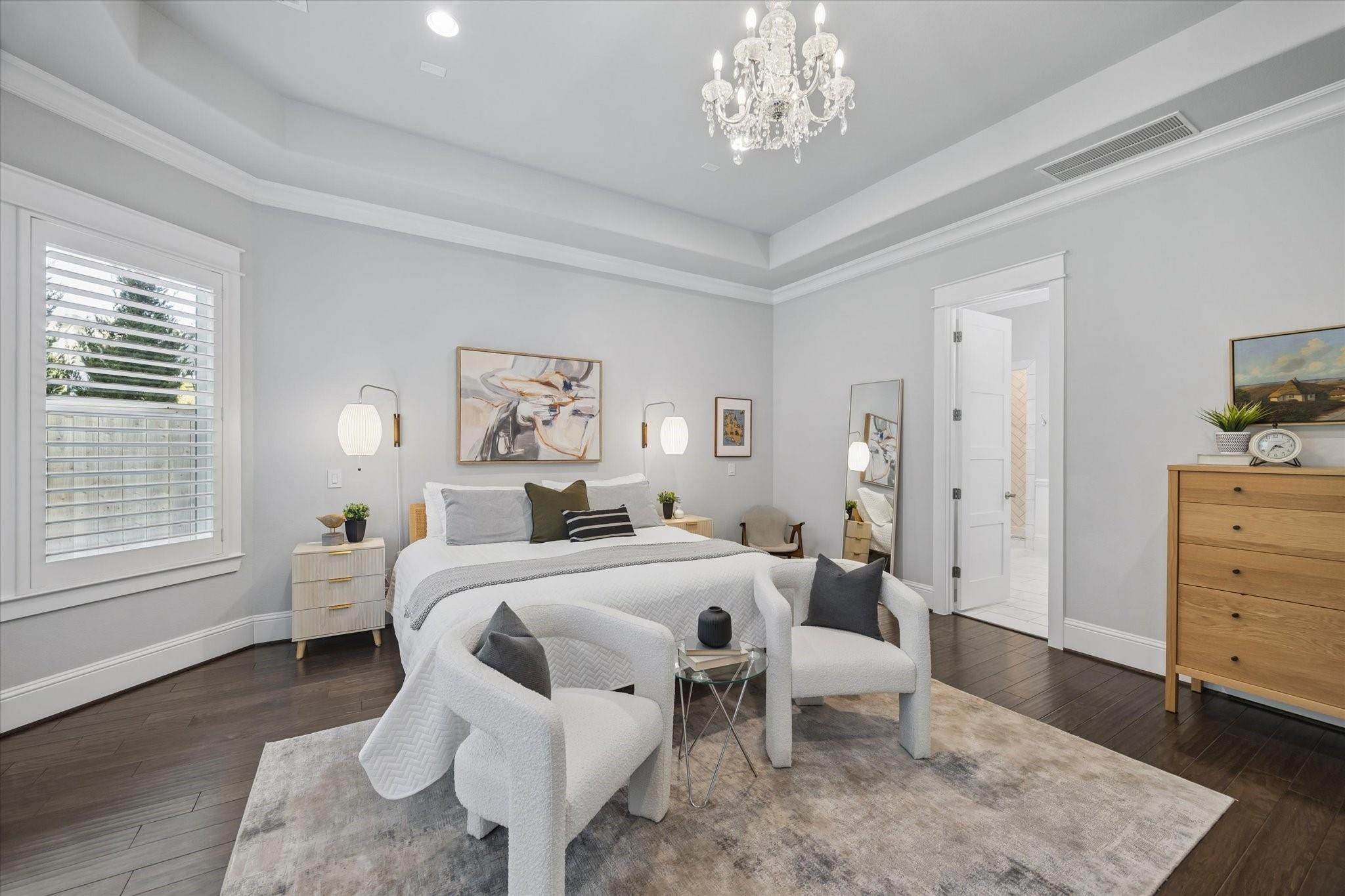 Spectacular custom home in 24-hour guard-gated Carlton Woods! Located on the largest lot on the street, this Mediterranean showstopper was designed for luxe entertaining and comfortable living! A 5-car garage ensures plenty of parking, and a spacious, brick paver driveway leads to the entrance, framed by manicured gardens. Polished travertine and hardwood flooring, Italian crystal chandeliers, plantation shutters, and architecturally carved ceilings are just a few highlights. Venetian plastered walls in the formal dining room; the exquisite living room offers butted glass windows overlooking the backyard and pool. The enormous open kitchen is the heart of the home, with a bar off the family room featuring leathered marble counters, a beverage fridge, and an ice maker. The primary bedroom downstairs has a spectacular bath and 2 huge walk-in closets. A private guest suite with its own garage, kitchenette, and W/D connections is ideal for in-laws. Game room, media room, and 3 bedrooms with en-suite baths upstairs.