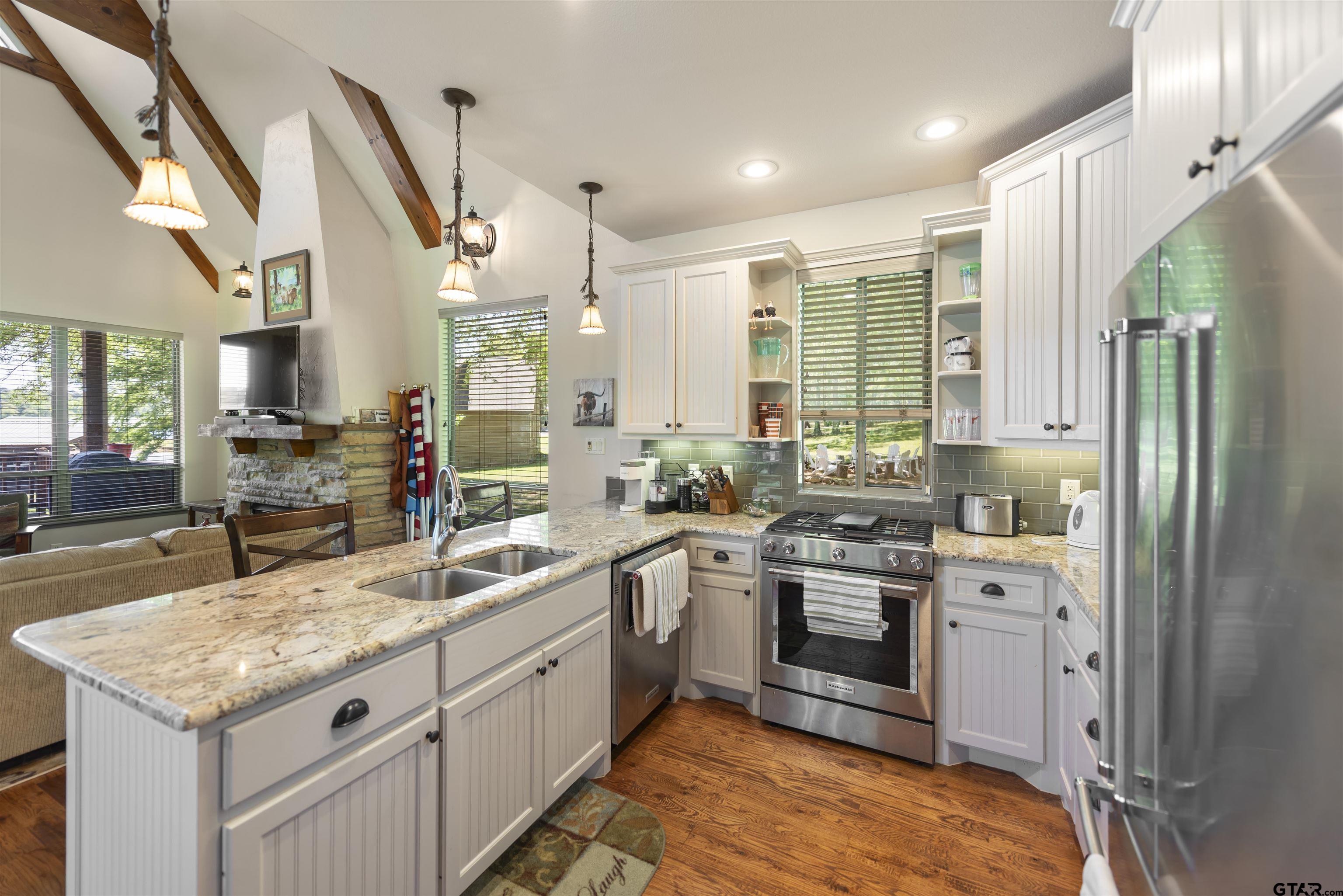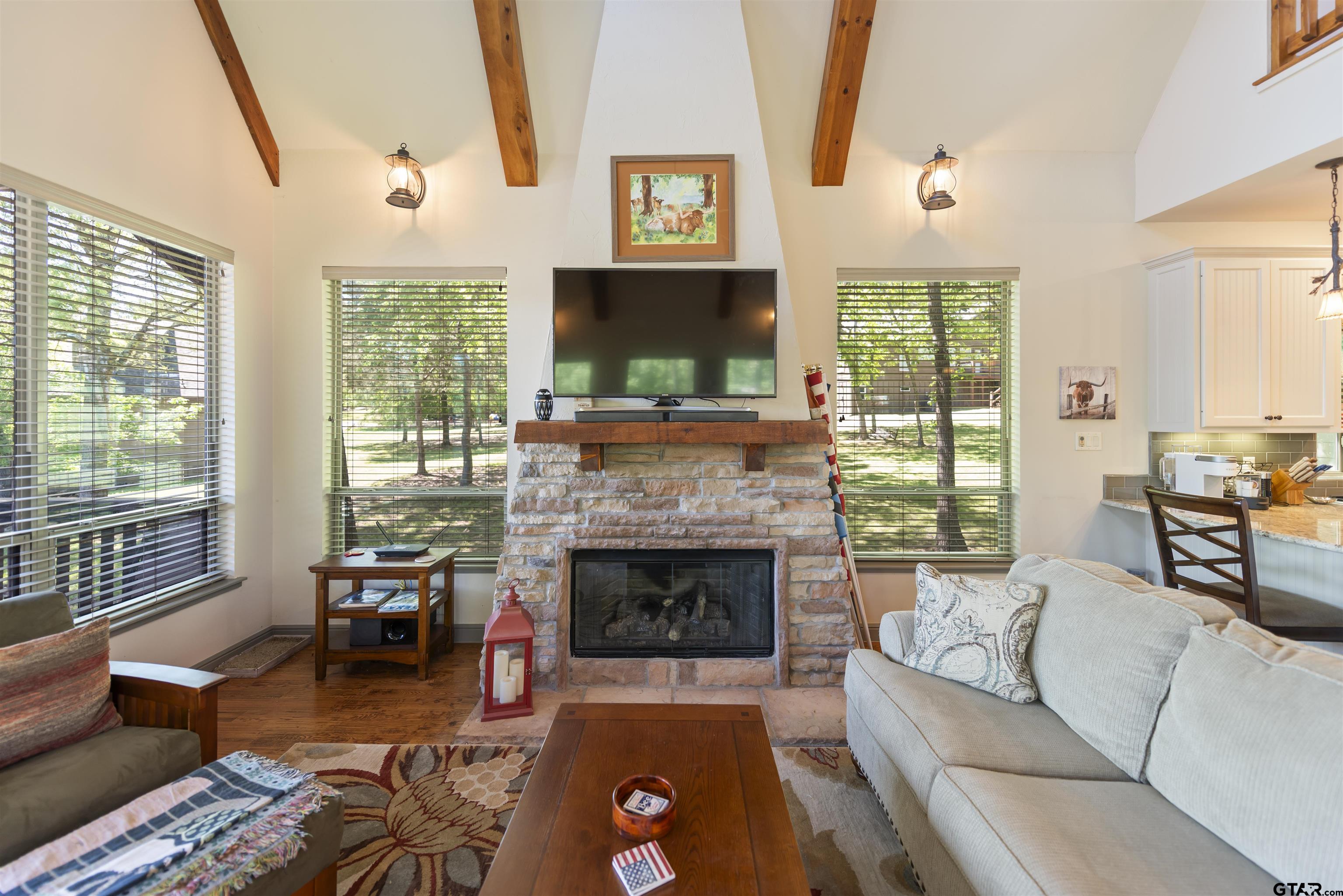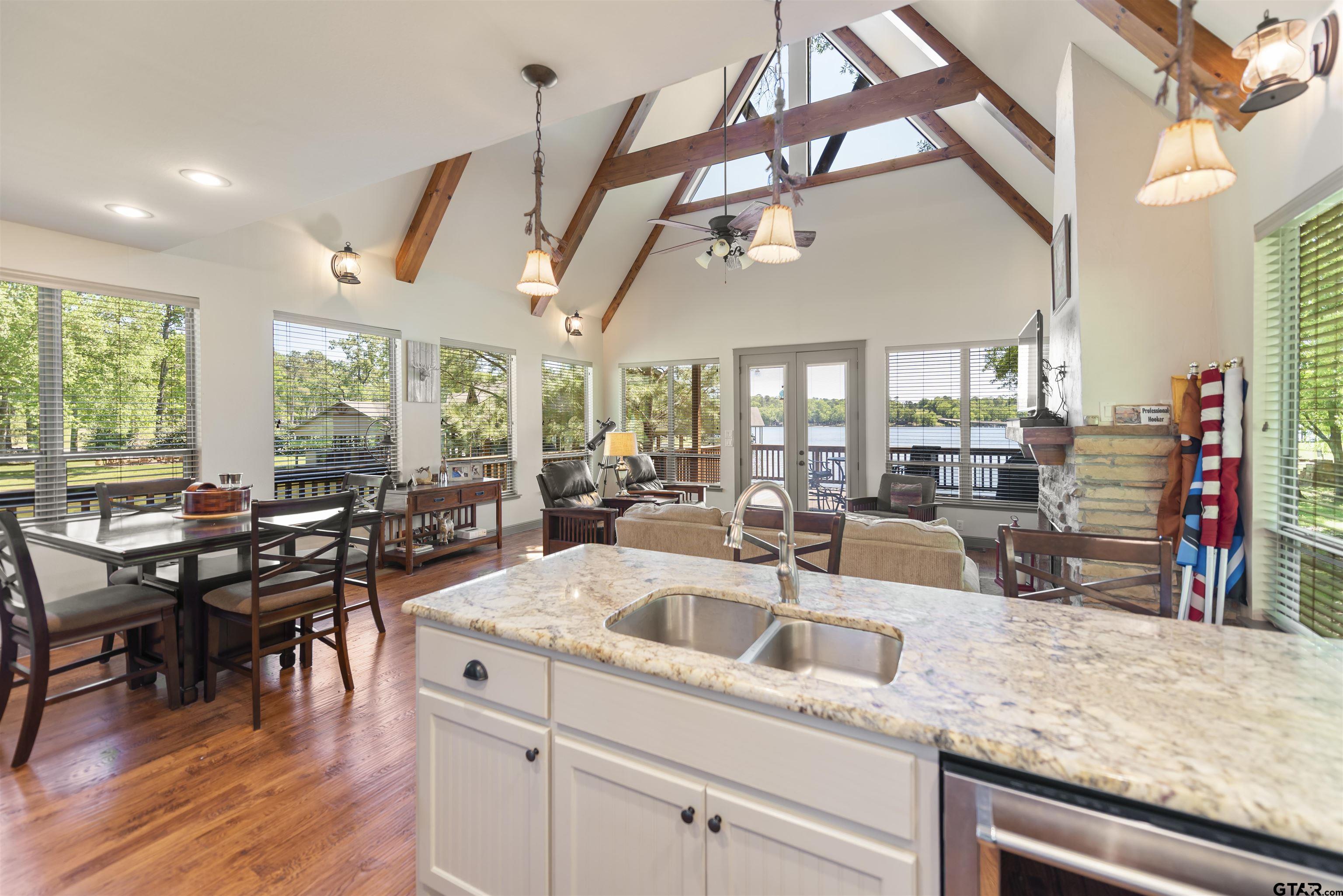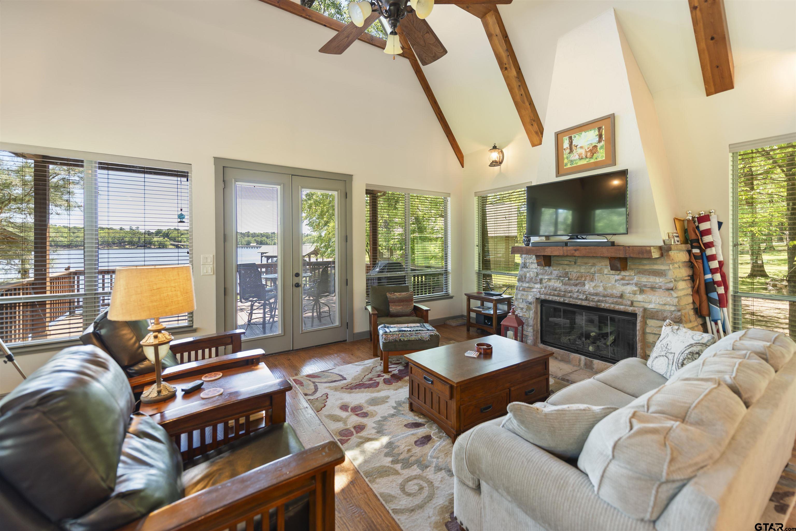The one thing you can’t replace is the feeling of home and this one captures it from the very first look. Set on peaceful waterfront views yet only minutes from Celebration Plaza and I30 access, this property offers the RARE BALANCE of luxury, convenience, and total calm. As you step onto the oversized deck, the horizon opens up in front of you, creating a natural gathering place for morning coffee, family celebrations, and unforgettable sunsets. Inside, the layout is designed for real living. Split floor plan and open concept! The kitchen features gorgeous granite countertops, modern fixtures perfect for each setting, flowing effortlessly into the living area where custom windows bring the outdoors in and a gas-log fireplace adds warmth at the touch of a button. The primary suite feels like a getaway of its own, complete with a walk-through rainfall shower, jetted tub, and custom closet built-ins for everyday ease. Watch the news or your fav show on the Vanity Mirror TV while you get ready! This home is as smart as it is beautiful; with a Nest thermostat, WiFi-enabled garage door opener, energy-efficient LED lighting, whole-home tankless water heater, and high-speed fiber internet. A full Vivint security system with cameras and monitored fire, carbon detection provides reliable peace of mind for both owners and visiting family. Refrigerator, living-room couch, and patio TV convey, making move-in simple! The utility room offers a convenient drop zone, and the oversized fourth bedroom adapts easily to an office, playroom, media space, or home gym. Outdoors, the upper deck sets the stage for hosting, while the lower patio is ideal for game days, grilling, or quiet afternoons by the water. A generous workshop keeps tools, toys, and lake gear organized and out of sight. Homes with this combination of scenery, comfort, and longevity rarely become available. This is a place built for gathering, relaxing, and creating memories a home that welcomes every season of life!