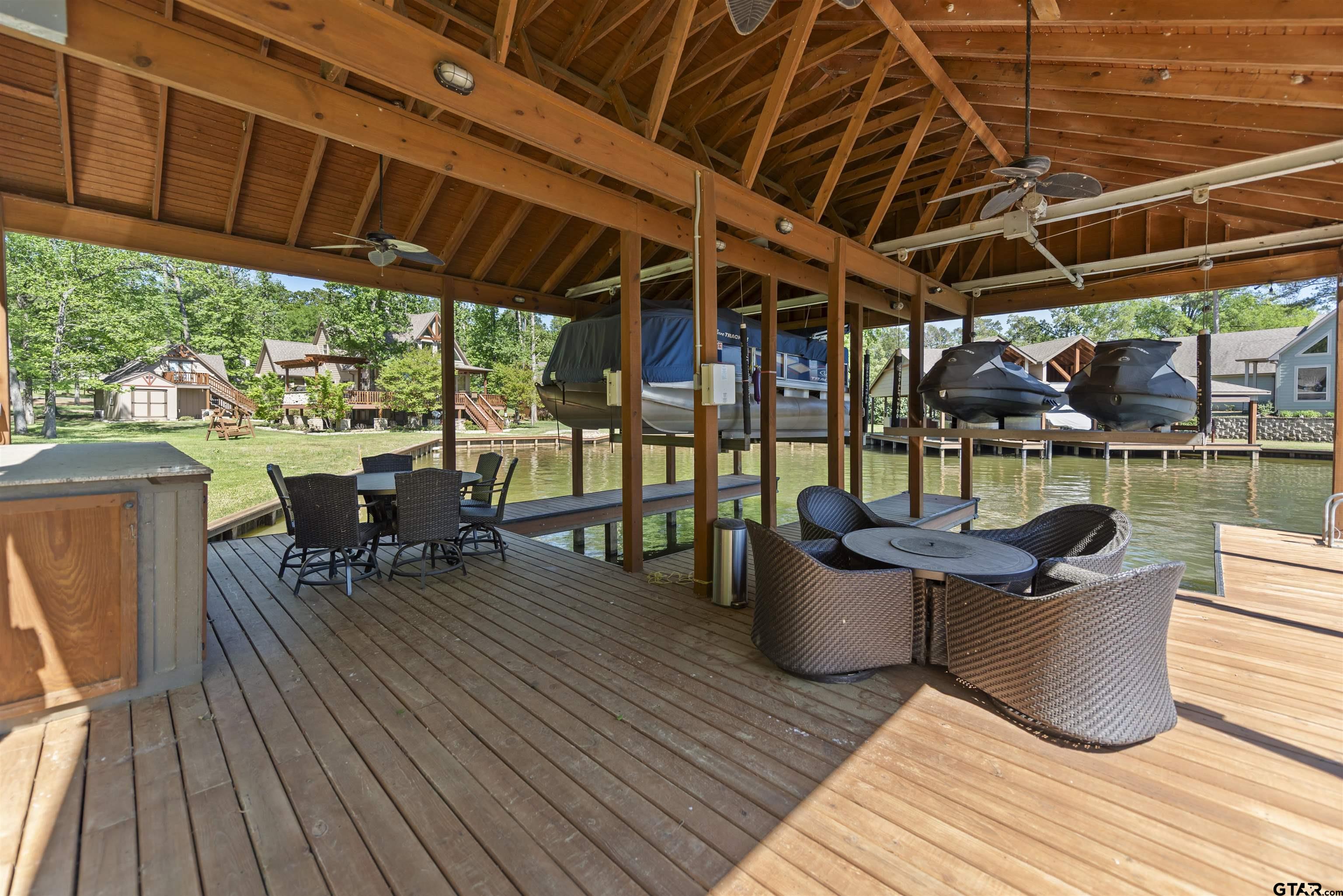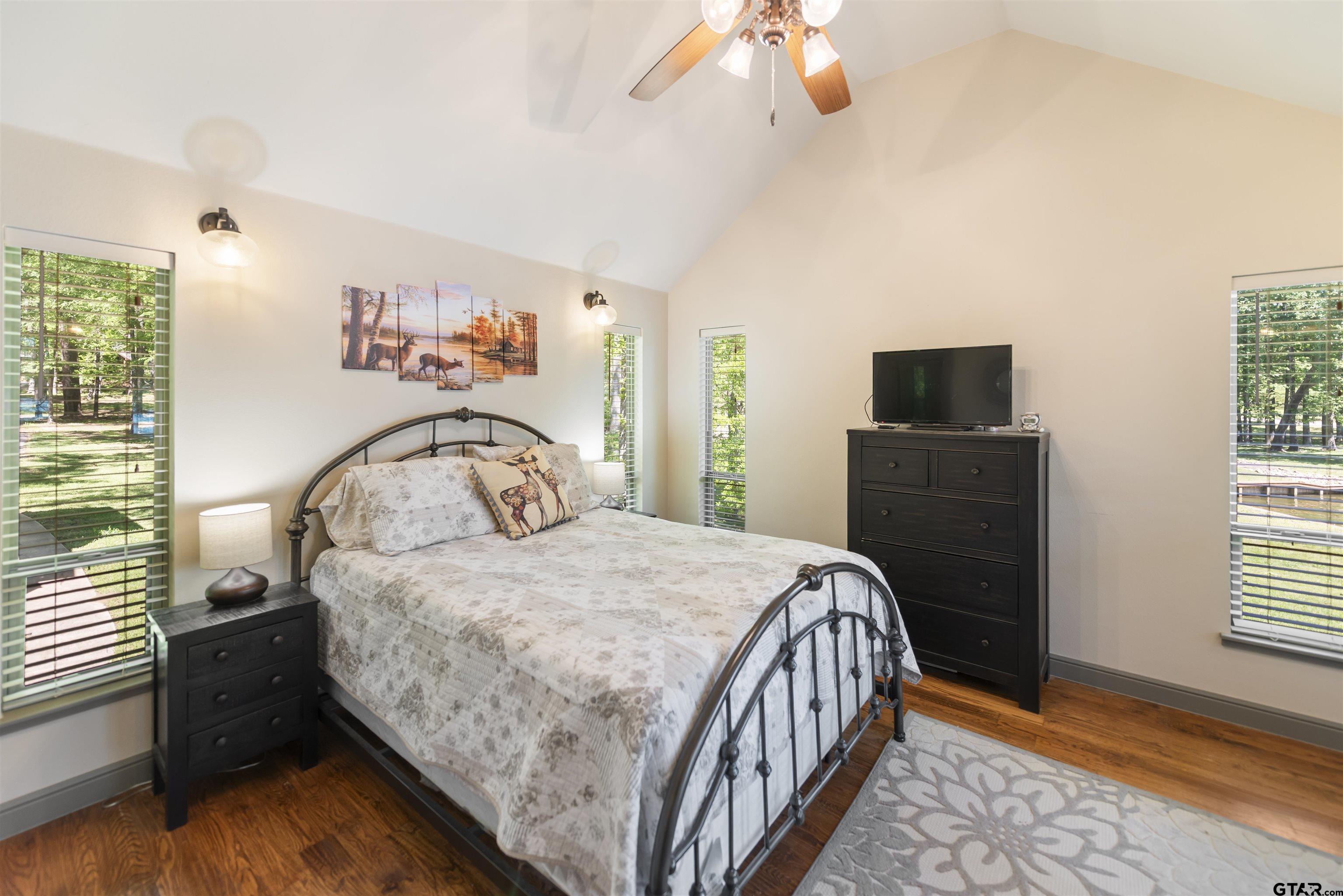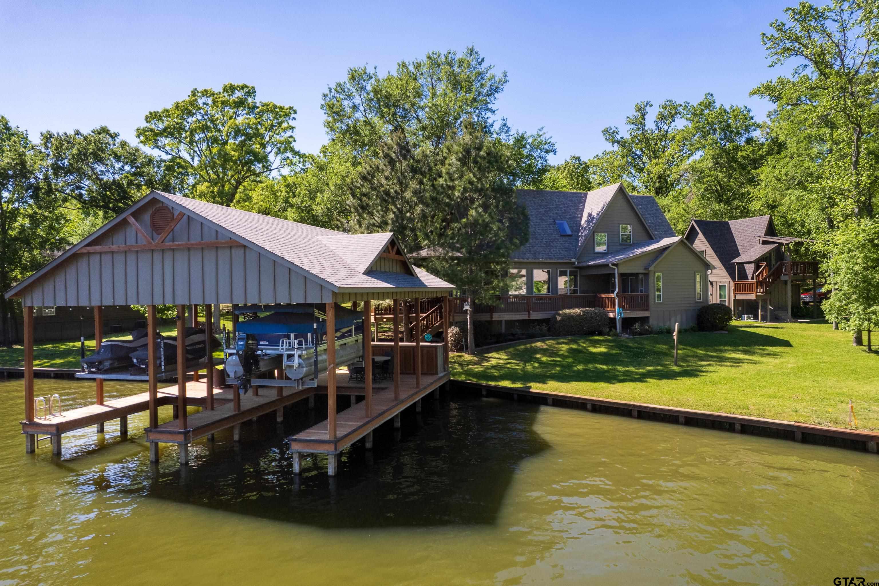 Neat 5 bedroom, 4 bath late model lake house on an oversized heavily-wooded lot with 148 of lake frontage! This builders home was finished in 2017 and includes hand-scraped oak floors throughout the downstairs. The open great room arrangement includes a gas-log fireplace, great kitchen with gas range and lots of cabinet and countertop area. The master site and a guest room are on the main level, and two guest rooms (each with a loft) and a full bathroom are upstairs. A wonderful guest suite with its own loft is situated above the 2-car garage. This property is situated in a deep-water cove and faces southward, directly into the summer breeze. A large covered deck and abundant shade trees make a great place to enjoy the outdoors in any weather, rain or shine. The boathouse sits on deep water and has a full-size slip and a slip adapted to 2 jet skis. This property will accommodate a large group in style and comfort!