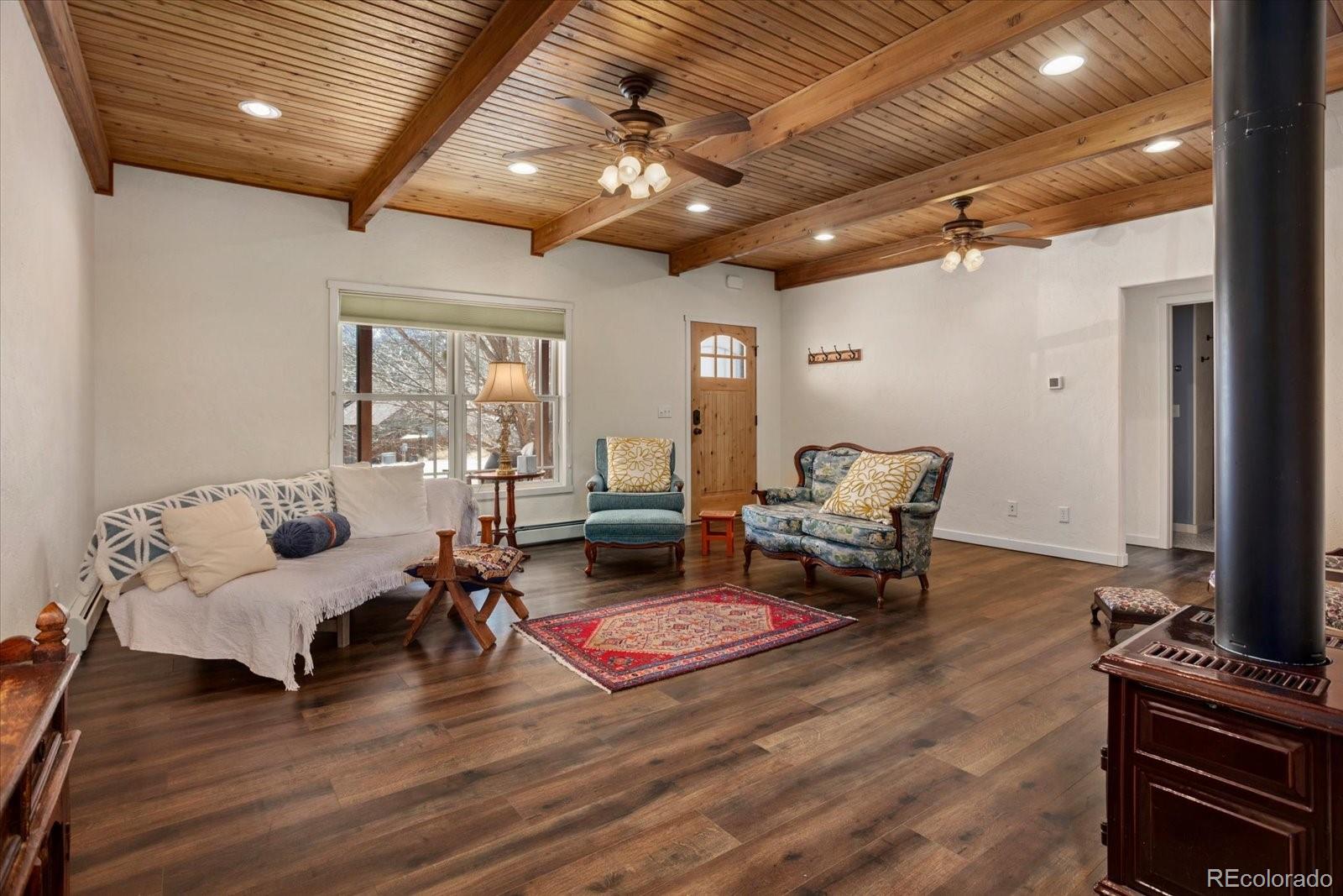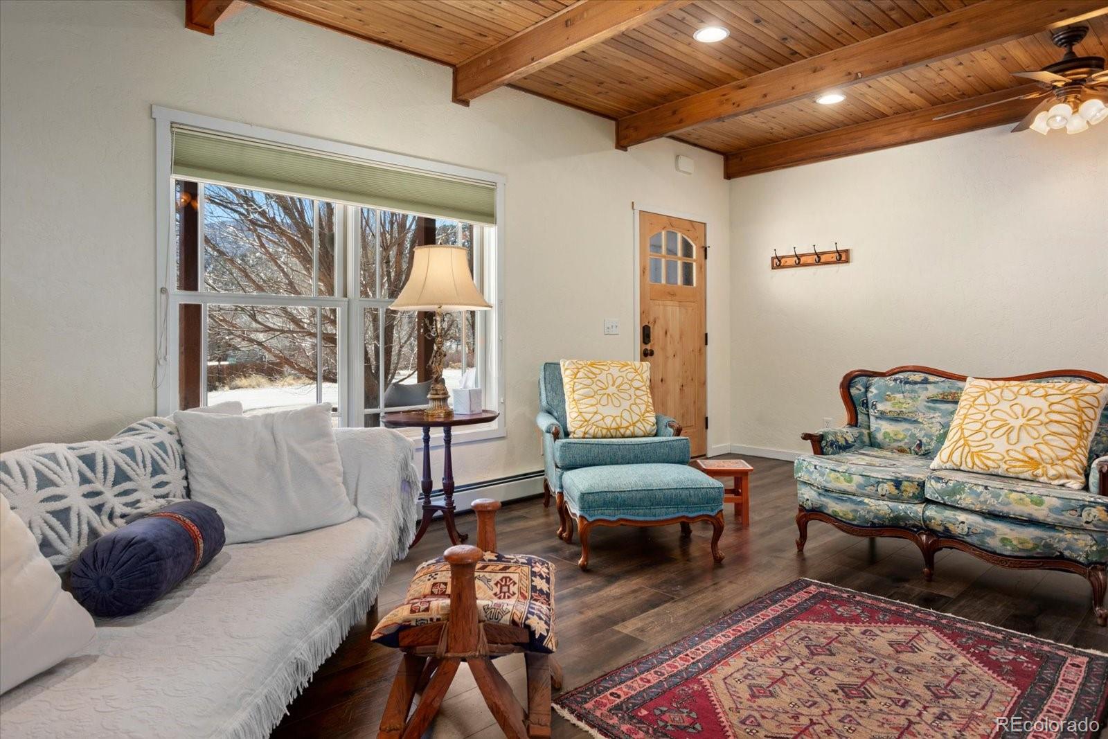 Welcome to this beautifully updated 3-bedroom, 2-bath home set on an oversized .36-acre lot in Little River Ranch, offering exceptional outdoor living, mature landscaping, and stunning views of the Collegiate Peaks. The light-filled kitchen features quartz countertops, new stone backsplash, cork flooring, an oversized pantry, kitchen island & dining area. The freshly painted interior includes a separate laundry room, a cozy gas fireplace in the living room, and updated bathrooms with new tile in both showers and floors. The primary suite offers a walk-in closet and a private ensuite bath with dual sink vanity with ample storage, an updated tiled walk-in shower, and a private water closet. The second bedroom has a large window that provides abundant natural light and peaceful mountain views out the backyard. The office/3rd bedroom has a closet and a large window overlooking the willow trees in the front yard. The living space extends outdoors to a large 12 x 32 covered patio w/metal roof, creating the perfect setting to enjoy the beautifully landscaped backyard. Both the front and back yards feature mature trees—including pear, crabapple, chokecherry, maple, blue spruce, and aspens—along with lush gardens, a firepit area, a 10 x 16 storage shed, and wide-open space that creates a serene retreat. Evenings are best spent on the covered patio, complete with a wood-burning stove and custom hearth, gas grill & space to enjoy dining outdoors. Additional features include a covered front porch and a two-car garage. Ideally located directly across from the community walking paths, 20 acres of open space, and fishing along the South Arkansas River—a rare combination of nature, convenience, and lifestyle. Thoughtfully designed and well maintained, this home blends comfort, functionality, and true Colorado charm. This is a truly special opportunity to own a move-in-ready home with space, scenery, and access to the best of outdoor living in the Arkansas Valley.