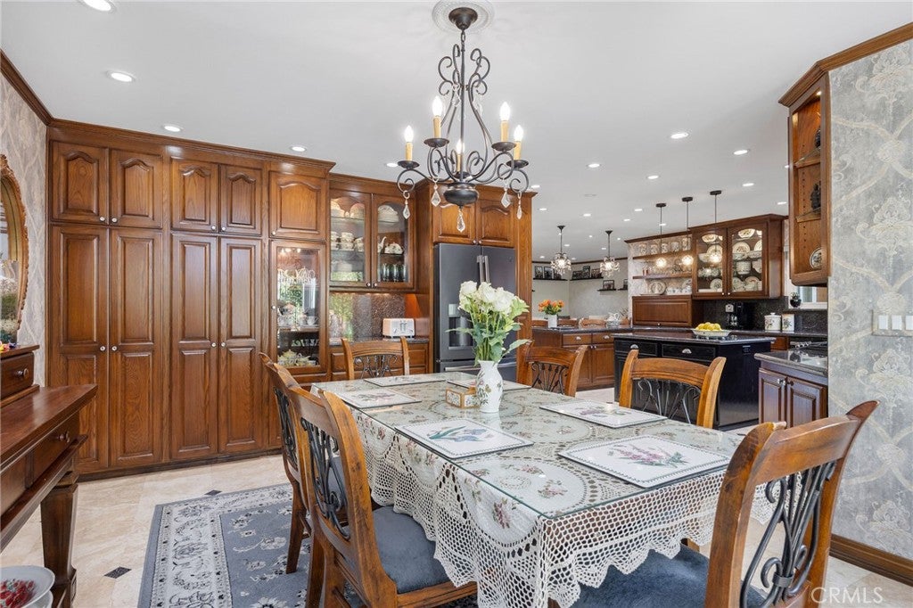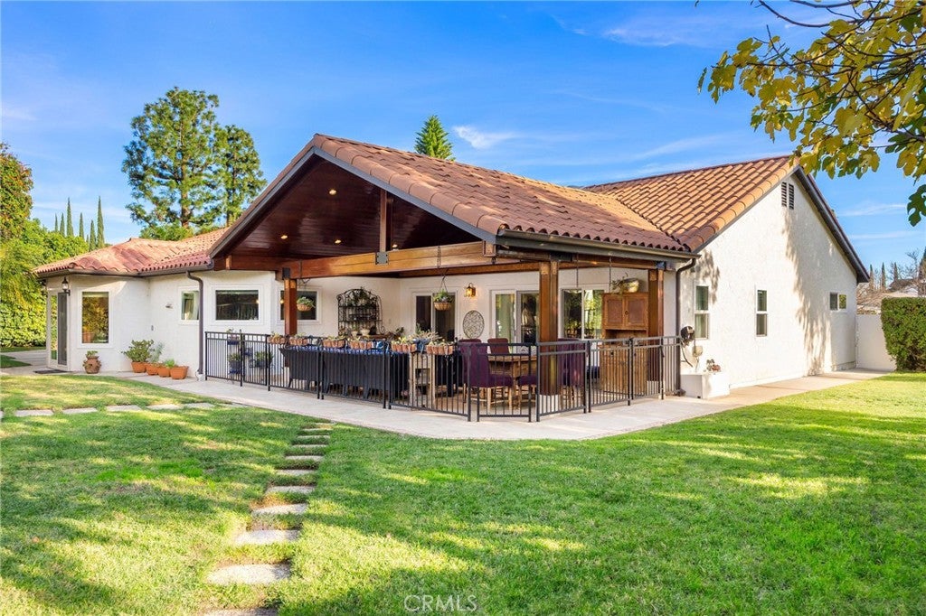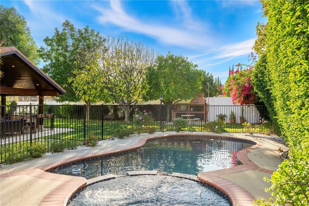 Gated, corner lot single-story home with a three-car garage located in one of Chatsworths most desirable neighborhoods, where homes rarely come on the market. Offering nearly 3,000 sq ft of living space on an expansive lot of over 16,000 sq ft, this well-maintained residence provides space, comfort, and inviting indoor-outdoor living.Upon entry, dramatic smoked-glass and wrought-iron double doors welcome you into a warm and thoughtfully updated interior featuring a combination of polished travertine flooring with designer insets and high-quality oak hardwood floors. The home has been recently refreshed with new interior paint and updated hardware in 2025, while longtime owners have consistently maintained and upgraded the property over the years.The floor plan includes formal living and dining rooms with fireplace, a spacious family room with backyard access and views, and a functional kitchen with oak cabinetry, slide-out storage drawers, and a breakfast bar. The home offers four bedrooms and is currently configured as a three-bedroom, with easy potential to convert back.The oversized covered lanai is a standout feature, offering space for both a full seating area and dining area, and is finished with stained wood ceilings, recessed lighting, and ceiling fans. The backyard includes a pool and spa (resurfaced 2023), new pool equipment (2023), outdoor kitchen, separate gazebo/sunning area, large grassy lawn, mature trees and lush greenery creating a private feel, and a fenced dog run with a recently updated canine cabin.Additional features include electric gates, Milgard windows, HVAC less than 10 years old, and new insulation installed in 2025. Conveniently located near hiking trails, parks, and the natural beauty that defines Chatsworth.