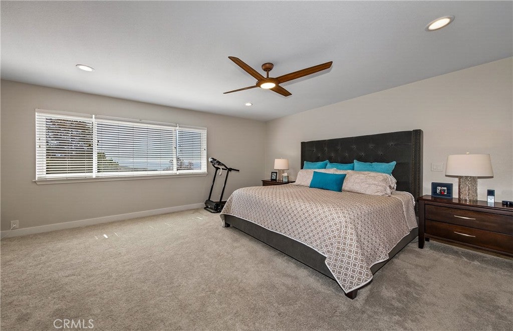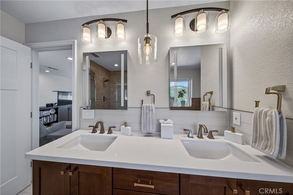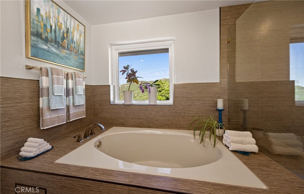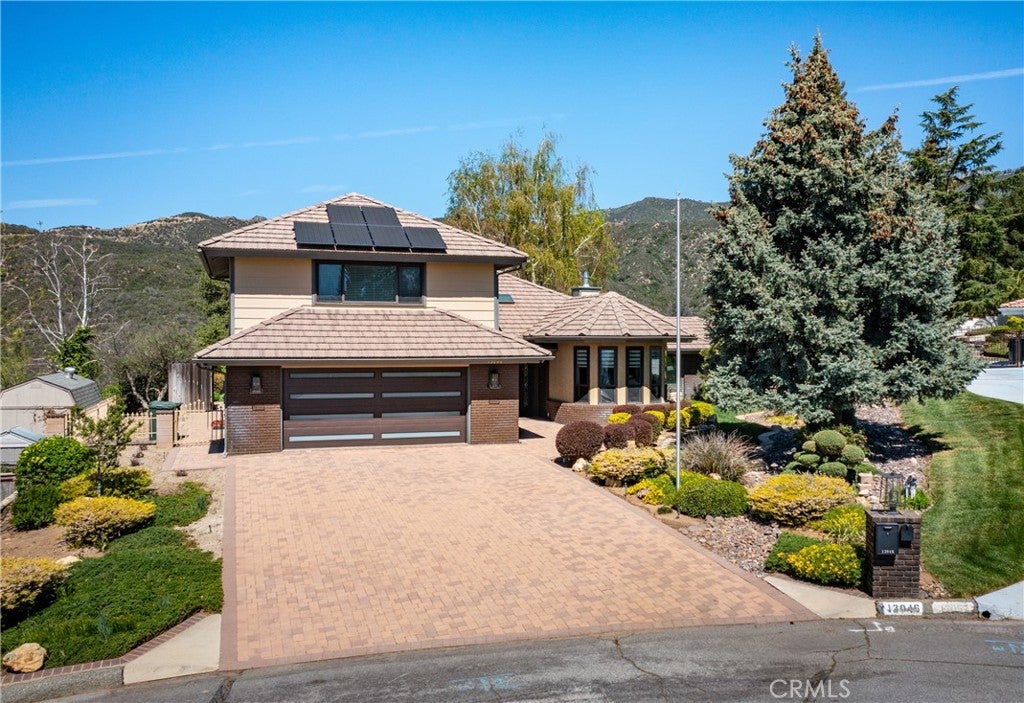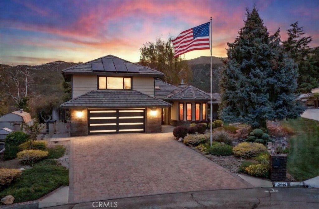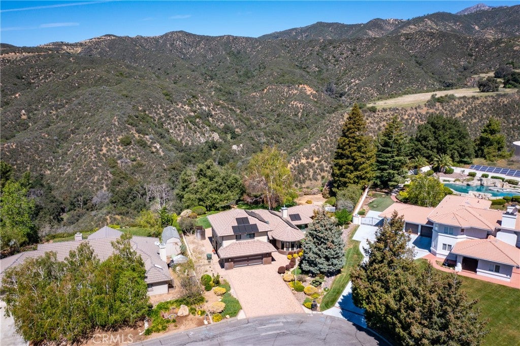 Welcome to an extraordinary hilltop Spanish-Mediterranean retreat with breathtaking mountain and city-light views. Privately positioned on 1.32 acres at the end of a quiet road shared by only four homes, this tri-level estate offers rare seclusion, panoramic scenery, and a lifestyle that feels like a permanent getaway. Spanning 4, 371 square feet, the home features 5 bedrooms, 4.5 bathrooms, and a 4-car drive-through garage, thoughtfully designed for multi-generational living and memorable entertaining. From the moment you enter, soaring ceilings, floor-to-ceiling windows, imported wood accents, custom doors, and rich hardwood floors create warmth and timeless character. The dramatic living room showcases 20-foot ceilings, exposed wood beams, a striking stone fireplace, and an architectural catwalk that connects the living spaces while framing the incredible views. The main level also includes a den with built-in bar, formal dining room, spacious kitchen with island, guest bath, and mudroom/storage area-ideal for hosting with ease. This home offers two private primary suites, each with en-suite bathrooms and private balconies. One suite features a spa-inspired jetted tub perfectly positioned to soak in the scenery. The upper level includes a cozy lounge landing, two additional bed
