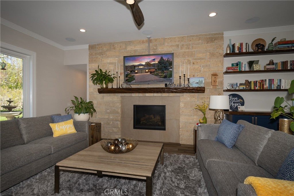 A RARE HILLSIDE RETREAT BACKING TO WILDWOOD CANYON where privacy, views, and design come together in a one-of-a-kind setting. This home offers unmatched privacy, breathtaking natural surroundings, and no rear neighbors. Enjoy daily encounters with nature, where deer, and native wildlife create a peaceful, ever-changing backdrop and experience. This upgraded home has undergone over 250,000 in improvements, blending modern comfort with custom upgrades. The inviting living room with expansive windows that frame breathtaking canyon views creates a stunning backdrop of natural beauty. Jaw dropping focal points are the floor to ceiling stone fireplace with thermostat control, and floating shelves with custom built-in storage with pull-out shelving. The updated kitchen was tastefully designed with blue cabinetry, iced with gold hardware, custom backsplash, and pull-out shelving. A stunning casual dining space wrapped in windows located in the kitchen, where every meal is accompanied by serene views, seamlessly bringing the beauty of the outdoors in. The circular formal dining room is a standout feature, surrounded by windows that capture the beauty of the outdoors from every angle with ample space for entertaining. Downstairs offers two guest bedrooms, and a full bathroom. As you enter the home from the garage, conveniently located is the indoor laundry room with ample storage, and an additional guest bath. Upstairs, the elevated loft style primary suite creates a semi-private retreat with unique touches including a pop-up TV hidden within custom cabinetry, city light views and additional space ideal for a lounge area. A spacious walk-in closet includes a walk-out attic for downstairs and pull-down attic access for upstairs. The updated primary bath features a vanity with dual sinks and a walk-in shower. Step outside to enjoy a landscaped backyard designed for relaxation and entertaining. While a large portion of the rear yard extends down the steep slope beyond the flat grassy area, the property provides stunning canyon views that enhances the sense of space, privacy, and connection to nature. The backyard fountain stays with the property and provides a relaxing setting as you enjoy the canyon views. Additional highlights include PAID SOLAR, an OWNED PROPANE TANK, NEWER HEAT PUMP with zones, a septic system, and an oversized 2-car garage. This is more than a home—it’s a private retreat with character and an unmatched setting.