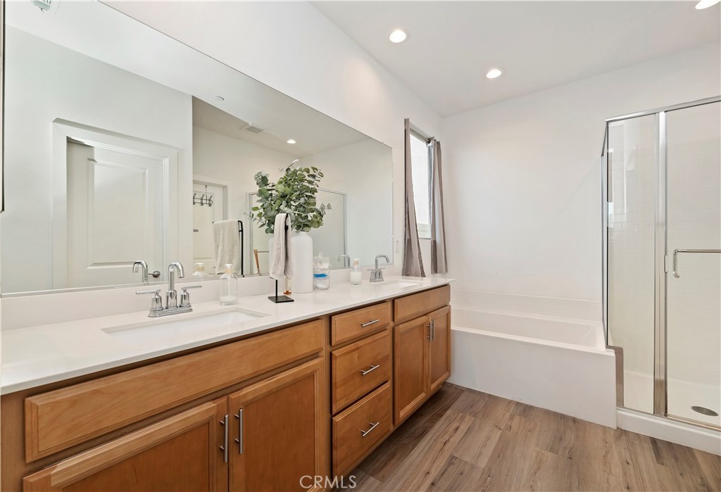 Welcome to your Aroyo Vista Residence 3. This lovely unit has upgraded flooring throughout and is a mirror image of the Residence 3 Model Home. Located next to the park and hiking trails this is one of the most desired locations in the development. This 3 bedroom 2.5 bath home is pristine and move in ready! The home's interior and the 2 car garage have been professionally painted. Custom 4” plantation shutters have been installed throughout the entire upstairs, downstairs and in the garage of this home. The downstairs features an open concept design with upgraded wood-like tile flooring in the living area, dining area, kitchen, & powder room. Enjoy family gatherings around the large center island with its gorgeous slab granite counter tops, matching granite back splash, stainless steel appliance, & upgraded dark wood cabinetry. Relax outside… the large living room sidling glass door allows easy access to your very own gated courtyard! The upstairs features, a laundry room, loft area, 2 large bedrooms, a full size bathroom, plus an over-sized master bedroom & master bath with walk in closet, separate soaking tub, walk in shower, & dual vanity sinks. The Arroyo Vista Community includes; recreation center,large community swimming pool & spa, lounge chairs, cabanas, fireplace, barbecues, Murrieta City Park with, basketball court, children's playground, outdoor run track & nature walking trail just to mention a few. The sellers are busy packing up the home for showings and interior pictures will be uploaded soon. In the meantime, previous interior pictures can be viewed by searching MLS listings SW20228201, TR18115195, and SW 19065244.