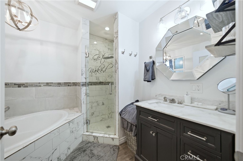 This 4-bedroom, 2-bath home offers approximately 1,390 sq ft of living space on a 7,002 sq ft lot. A covered front porch leads into the open living and dining area featuring a fireplace and large windows providing natural light. The kitchen includes granite countertops, white cabinetry, tile backsplash, and a center island for food prep and storage. The primary bedroom features recessed lighting, a walk-in closet, and an en-suite full bathroom with soaking tub, and separate glass-enclosed shower. A ¾ hall bathroom serves the additional bedrooms. Interior spaces include updated flooring and ceiling fans in multiple rooms. The backyard includes a grass area, patio space for outdoor seating or dining, an above-ground spa, and a grapefruit tree. The long driveway provides access to a detached 2-car garage with additional off-street parking. Located near neighborhood parks, shopping centers, dining options, and major transportation routes.
