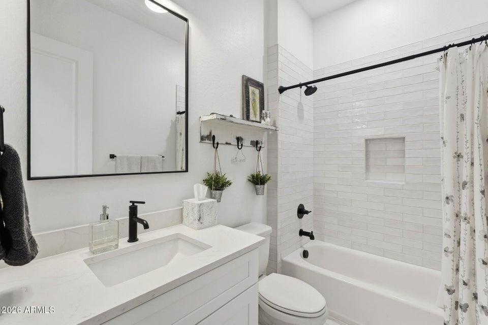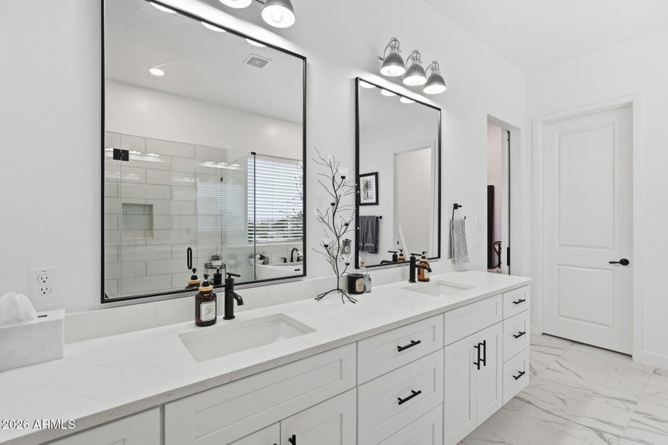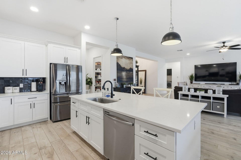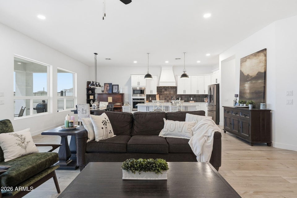 If youve been craving space, views, and a home that feels as good as it looks, this modern farmhouse delivers. Set on 1.25 acres with stunning San Tan Mountain views, this home offers the kind of quiet, open living thats getting harder to find, while still being close to hiking and horseback riding trails. From the moment you walk through the 13-foot entry, the home feels open, bright, and thoughtfully designed. With 10-foot ceilings, 8-foot doors, and an open-concept layout, every space flows naturally. The kitchen is truly the heart of the home, featuring white quartz countertops, 42-inch upper cabinets, a 36-inch cooktop, Samsung appliances, and wide plank tile flooring that runs throughout the main living areas. Its the kind of space where cooking, gathering, and everyday life all come together. The primary suite feels like a retreat, with a beautifully designed bathroom that includes a freestanding soaking tub, a beach-entry glass shower, and double vanities. Every bedroom includes a walk-in closet, giving everyone their own space and storage. Even the laundry room is elevated with two-tone cabinetry and thoughtful design. This home was built with both comfort and efficiency in mind, featuring spray foam insulation, premium AC units, ceiling fans in every room, tinted windows, and quality construction throughout, including a premium roofing system and synthetic stucco exterior. Its a home that not only looks beautiful, but is built to perform. Outside, the possibilities are endless with over an acre of land, whether youre dreaming of adding a pool, building a shop, or simply enjoying the wide-open space and mountain views. A three-car garage adds even more flexibility for storage, toys, or projects. Homes like this offer more than just features, they offer a lifestyle. Clean, well cared for, and designed for the way people actually live, this is a place you can settle into and truly enjoy.