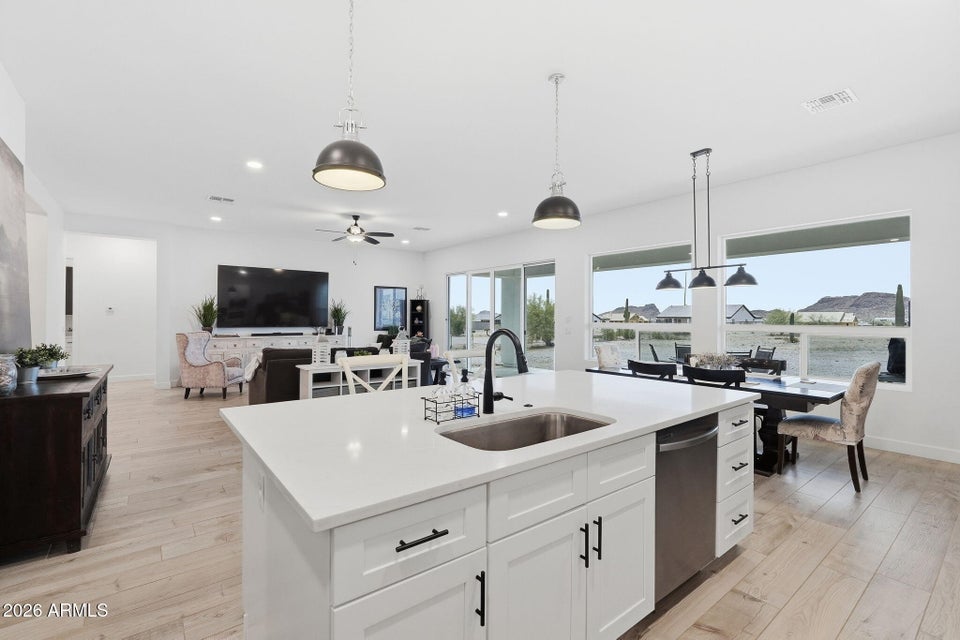 Resort-style living in Queen Creek, AZ. This beautifully designed home offers the elevated finishes and indoor-outdoor lifestyle buyers are searching for in Queen Creek real estate. The open-concept layout features a chef-inspired kitchen with rich custom cabinetry, expansive island seating, and seamless flow into the dining area and spacious living room.