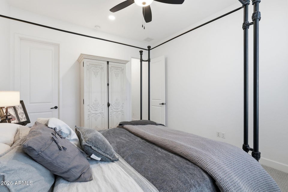 This is the kind of home that makes people fall in love with Queen Creek. With its mix of small-town charm, new restaurants, shopping, and rapid growth, its no surprise so many are making the move here, and this home puts you right in the middle of it all while still offering the space and comfort youve been looking for. From the moment you walk through the private gated courtyard, the home feels welcoming and thoughtfully designed. Inside, soaring 10-foot ceilings, 8-foot doors, and an open layout create a light, airy feel, anchored by a spacious great room and a stunning kitchen with a massive island, quartz countertops, ceiling-height brick backsplash, and abundant cabinet storage. Recent updates make it truly move-in ready, including fresh interior paint, brand new carpet in the bedrooms, new kitchen appliances, and a newly installed water softener and filtration system. This pet-free home has been exceptionally well cared for, offering a clean and comfortable living environment from day one.The layout offers flexibility for real life. The primary suite is a true retreat with direct access to the backyard and pool, a spacious bathroom with glass shower and dual vanities, and a large walk-in closet. A guest suite with its own bathroom and attached single garage provides privacy for visitors or multigenerational living, while additional bedrooms and a bonus flex room give you space for an office, playroom, or whatever fits your lifestyle.Step outside and youll understand why this home stands out. The backyard is designed for both relaxing and entertaining, featuring a gas-heated pool, new turf, pergola, gas hookup for grilling, and fresh landscaping with new trees and shrubs. The pool safety fence offers flexibility for families or pets, and the space feels private and easy to enjoy year-round.Additional features include a second two-car garage, RV gate, storage shed, upgraded lighting with dimmers throughout, security system with cameras, and thoughtful touches like an extended laundry room with added storage and a new utility sink.Homes like this dont just offer great features, they offer a lifestyle. Space to gather, room to grow, and a location in one of the fastest-growing areas in the Valley make this one a standout.