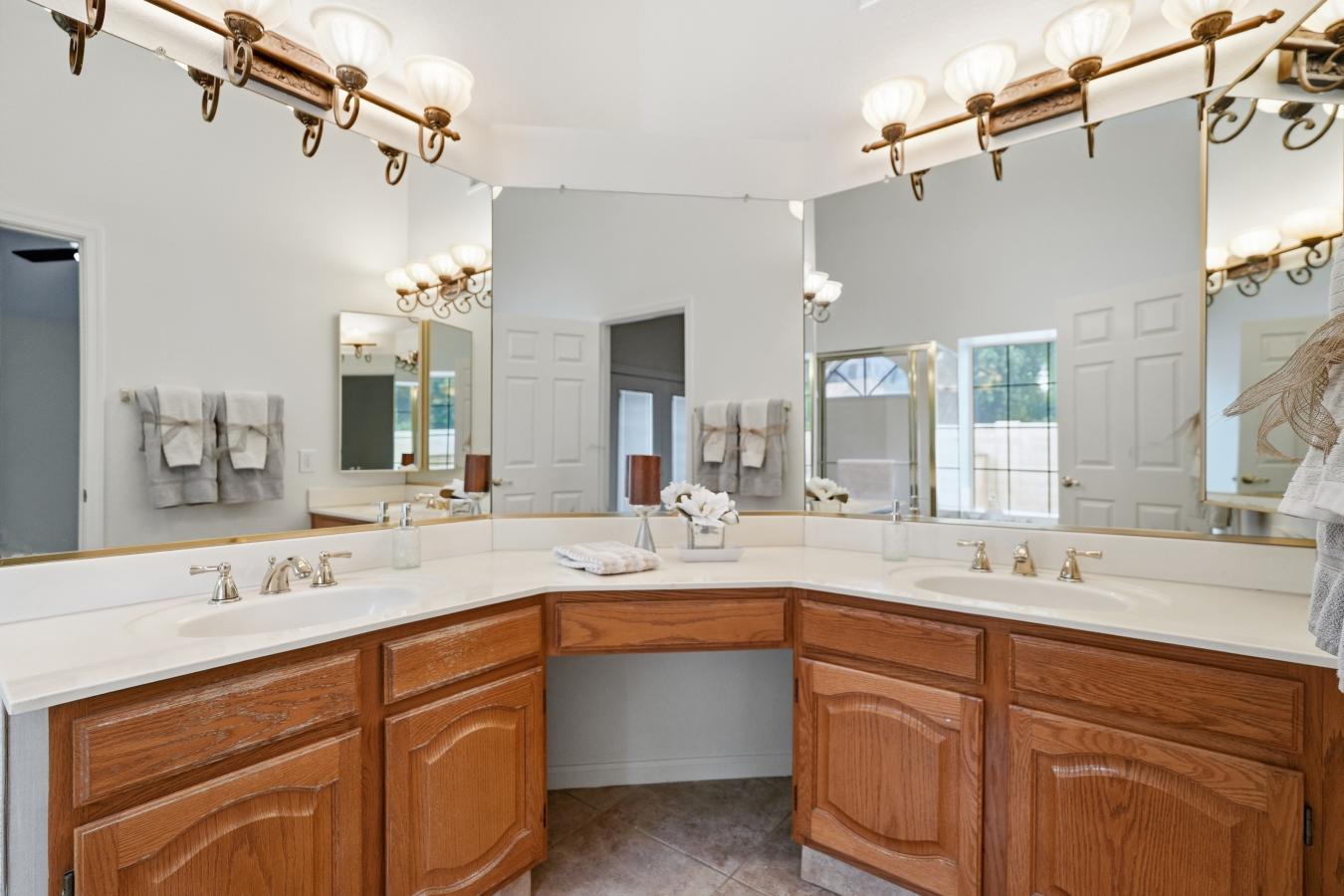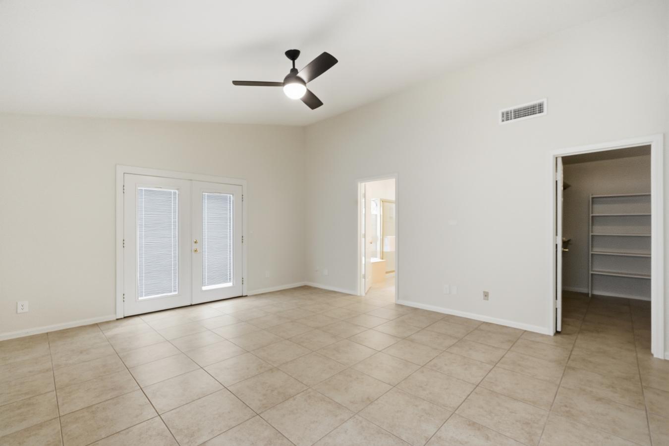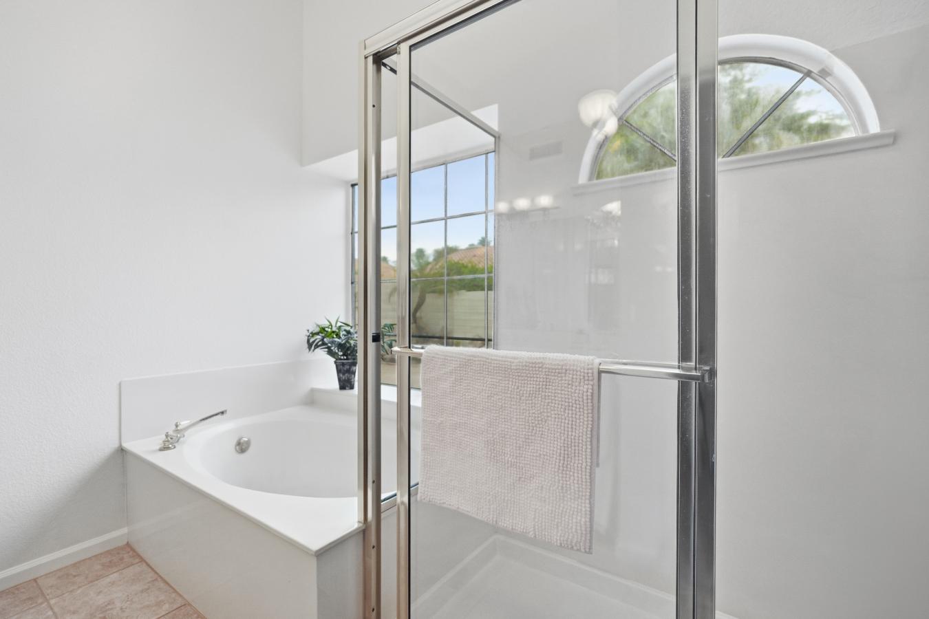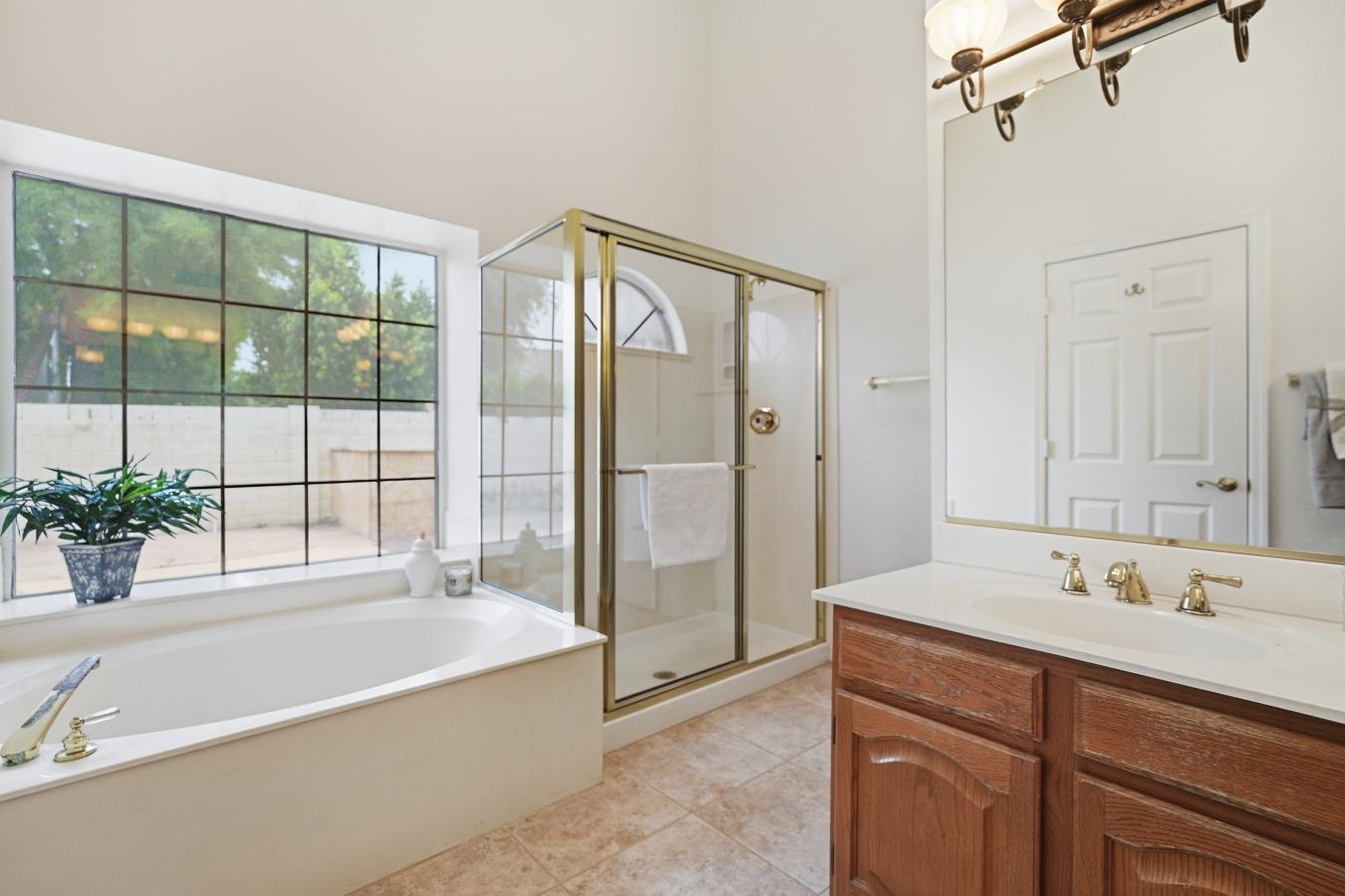 Prepare to be amazed! This fantastic 4 bedroom, 3 bathroom residence with owned solar is now available in the gated community of Encanto Norte! A stunning facade with tasteful stone accents, a manicured desert landscape, a 3-car garage with built-in cabinets, and a paver driveway are just the beginning. Come inside to discover a spacious dining/living area and family room, each with its own fireplace to make sure to stay warm & cozy. High ceilings, soft carpet in all the right places, modern light fixtures, and a neutral palette throughout! The gorgeous kitchen offers everything the aspiring chef needs: ample cabinetry, granite counters, a walk-in pantry, tile backsplash, stainless steel appliances, a prep island w/a breakfast bar, and a breakfast nook w/a lovely bay window. Relax & unwind in the grand primary suite, showcasing direct outdoor access, a walk-in closet, and a lavish bath with dual vanities & a jetted tub. Other bedrooms enjoy various features such as wood-look floors, plantation shutters, and access to a Jack & Jill bath! You will also find a cozy open den, ideal for an office or reading nook. The sizeable laundry room also comes equipped with extra cabinet space and a utility sink. Lastly, the wonderful backyard oasis with no neighbors behind includes a covered patio with commercial-grade heaters, an extended seating area with an attached pergola, a built-in BBQ, a freestanding hot tub, and a sparkling blue saltwater pool with a rock waterfall! The home of your dreams is here; hurry and act now!