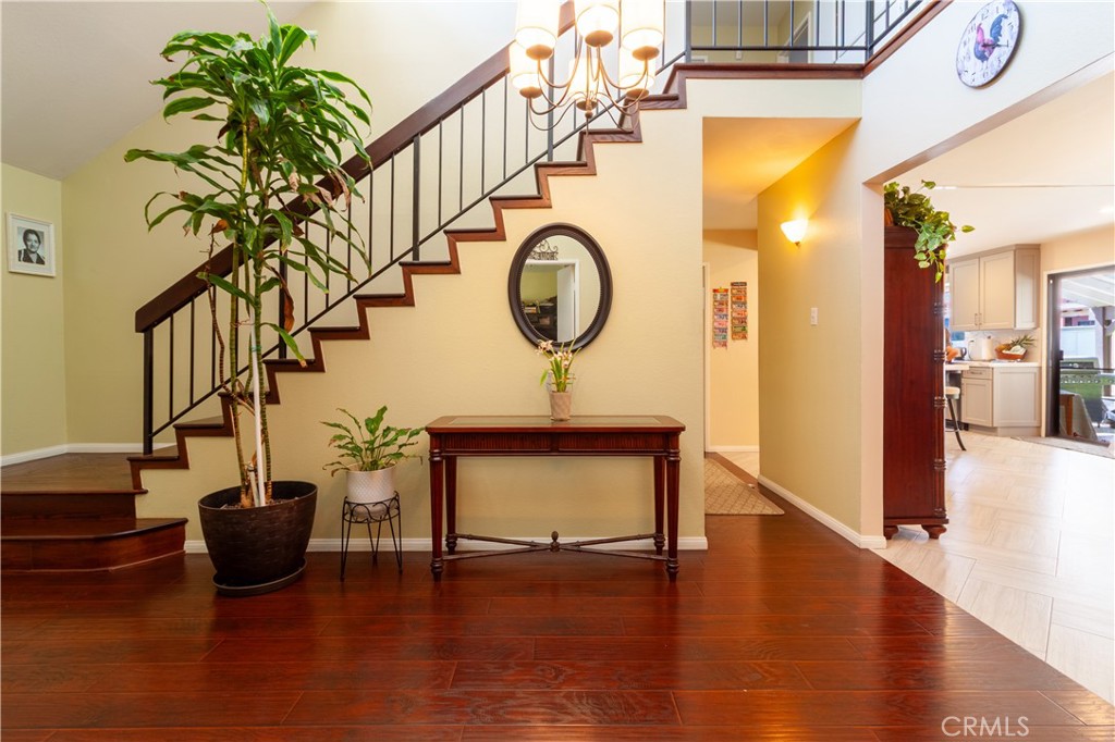 Stunning, contemporary estate located in a prestigious Chatsworth neighborhood. This home showcases 5 bedrooms and 5.5 bathrooms with over 5,400 sq ft of living space on a 17,499 sq ft flat lot. Featuring architectural details throughout, soaring two story ceilings, recessed lighting, high end tile flooring, impressive step-down living room with two story ceilings and windows overlooking the ample back yard. Plenty of natural light throughout. The remodeled kitchen boasts top of the line Viking appliances, a center island with bar seating and a spacious eating area that connects to the bright and airy family room, which features high ceilings and large windows with plantation shutters. A large office, powder room, bedroom, bathroom and dedicated laundry room complete the downstairs. Access the upstairs via two separate stairways at opposite sides for maximum convenience. The master bedroom showcases vaulted ceilings, and a separate seating area/office. A two-sided fireplace separates the bedroom and the large, spa-like bathroom that features a soaking tub, a glass enclosed shower, double sink vanity and two walk in closets. In addition, there are three other bedrooms each one with its own ensuite bathroom. Outside you will find a large patio with a pergola covered seating area, mature trees and plants and plenty of space to use as you desire. Limited access makes this a quiet neighborhood. Close to trails, bike paths, supermarkets, restaurants, coffee shops and all the conveniences that the Vineyards have to offer. Newly installed solar panels are paid off.