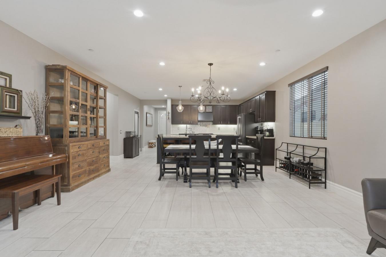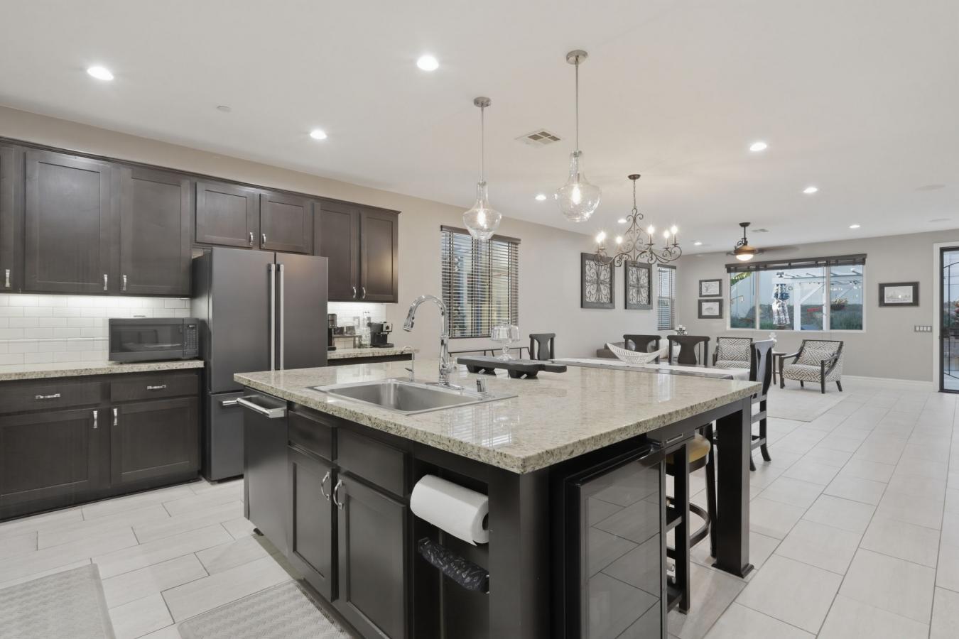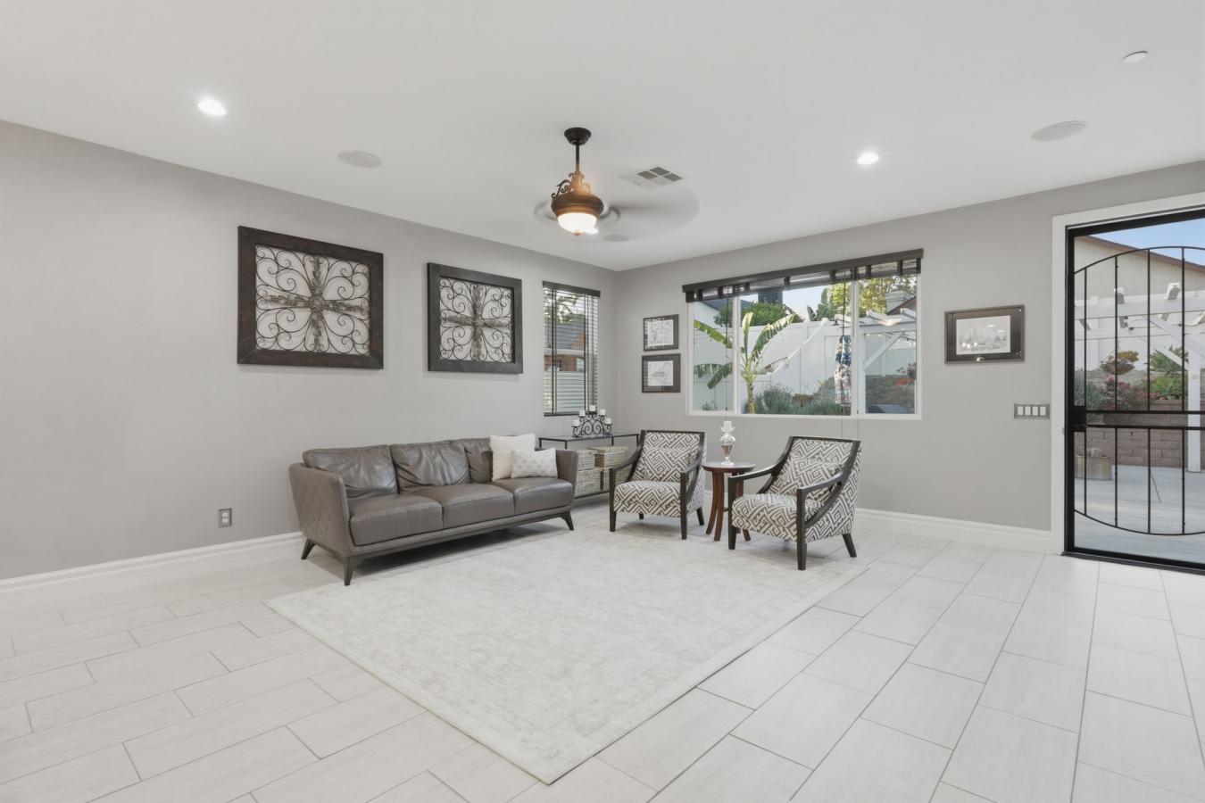 Nestled in the foothills of Moorpark Country Club within the prestigious gated community of Moorpark Country Club Estates, seamlessly combines elegance, comfort, and resort-style living. Breathtaking mountain views and overlooking a scenic 27-hole championship golf course, this beautifully remodeled, move-in-ready home offers the ultimate in luxury and lifestyle. Step into an impressive foyer highlighted by soaring ceilings and a sweeping staircase that sets the tone for the homes refined design. The formal living and dining rooms are perfectly scaled for intimate gatherings and are enhanced by picturesque yard views that create a warm and inviting atmosphere. Adjacent to a charming breakfast nook and spacious breakfast bar, the fully remodeled kitchen showcases sleek quartz countertops, modern custom cabinetry, high-end appliances, abundant counter space, and designer finishes throughout. Thoughtfully designed for both functionality and style, the kitchen opens seamlessly to the family room, complete with beautifully crafted built-in entertainment and bar cabinetry, creating an ideal setting for both everyday living and entertaining. The flexible floor plan features a convenient downstairs bedroom with en-suite bath, ideal for guests or multigenerational living. A secondary staircase provides convenient access to the upper level, where three additional bedrooms each offer private en-suite baths, along with a luxurious junior suite and an impressive primary suite featuring expansive windows that flood the space with natural light. With five spacious bedrooms and five and one-half remodeled bathrooms, comfort and sophistication are evident at every turn. Resort-inspired outdoor living elevates this property to another level, featuring a sparkling in-ground swim spa, expansive 15-person fire pit, newly poured driveway with RV parking, and an electric vehicle hookup. There is ample space to add a sport court or full-sized pool. A whole-home generator provides added peace of mind, and the garage includes custom built-in cabinetry for exceptional storage. Fresh interior paint, plantation shutters, fully remodeled bathrooms, and curated designer touches throughout complete this exceptional offering.