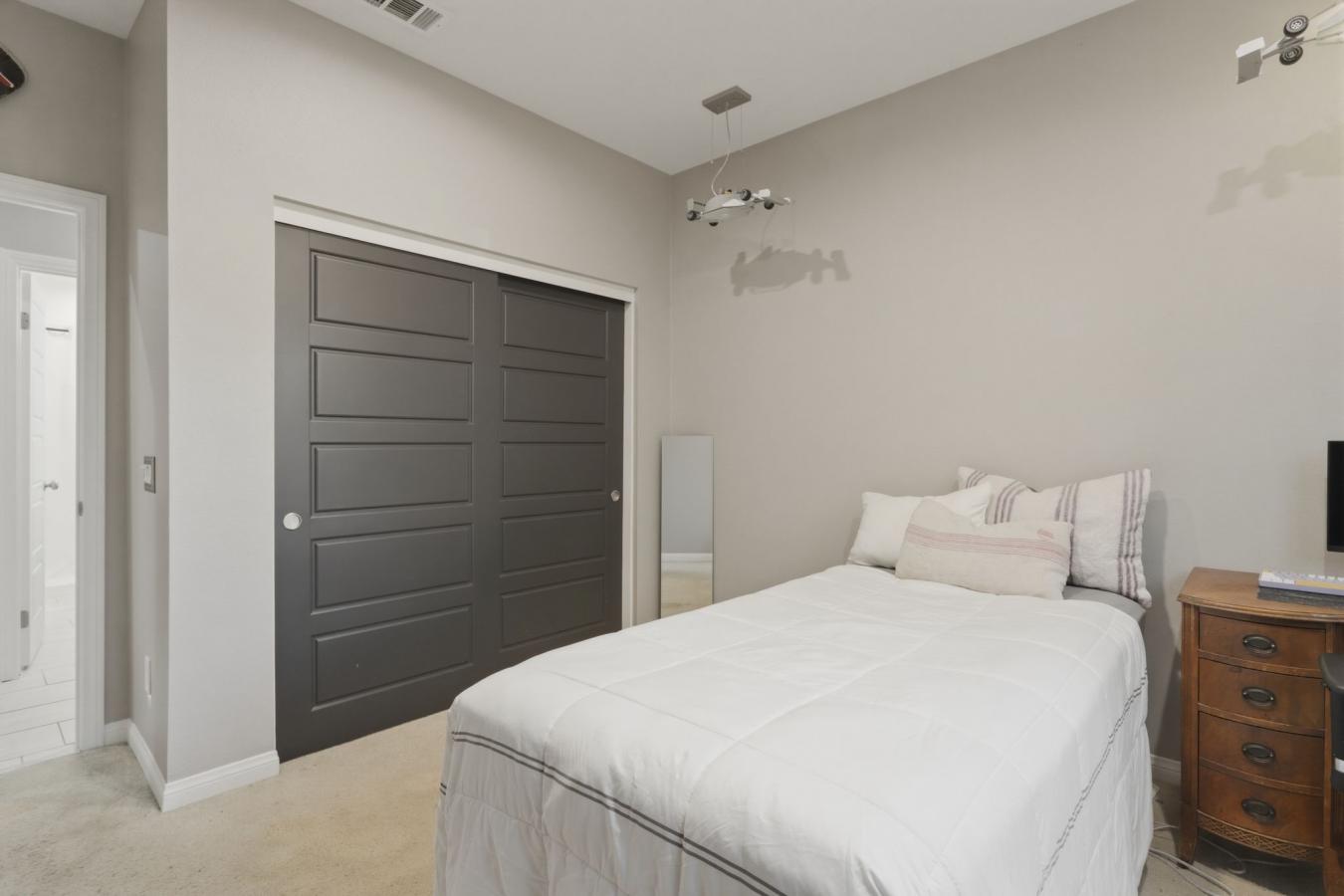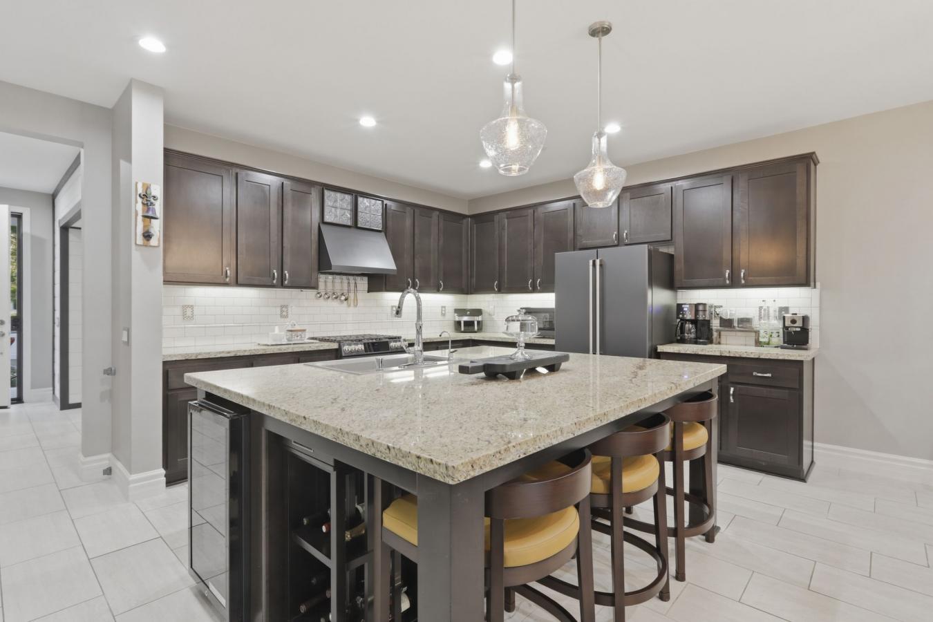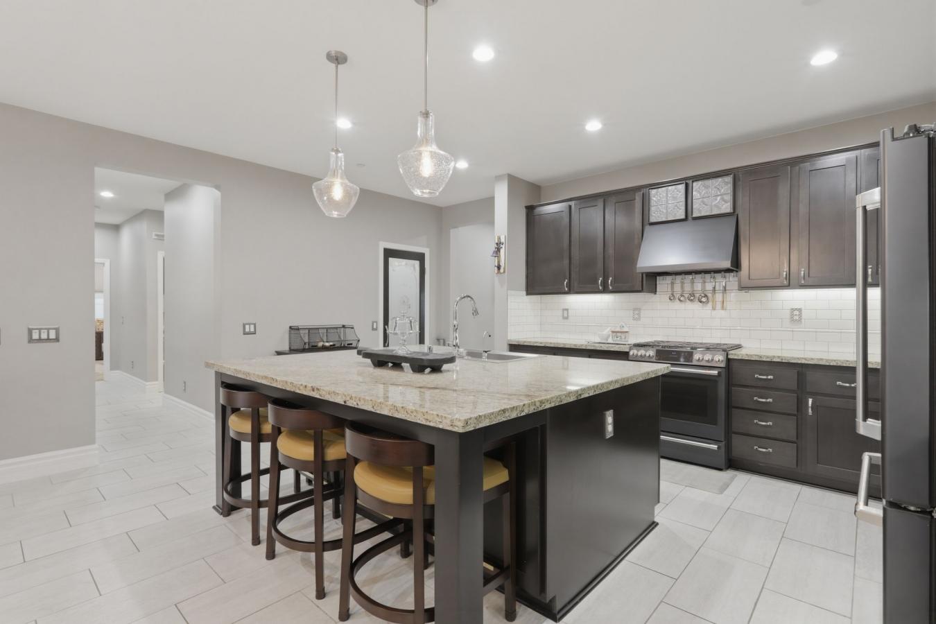 Nestled in the foothills of Moorpark Country Club within the prestigious gated community of Moorpark Country Club Estates, seamlessly combines elegance, comfort, and resort-style living. Breathtaking mountain views and overlooking a scenic 27-hole championship golf course, this beautifully remodeled, move-in-ready home offers the ultimate in luxury and lifestyle. Step into an impressive foyer highlighted by soaring ceilings and a sweeping staircase that sets the tone for the homes refined design. The formal living and dining rooms are perfectly scaled for intimate gatherings and are enhanced by picturesque yard views that create a warm and inviting atmosphere. Adjacent to a charming breakfast nook and spacious breakfast bar, the fully remodeled kitchen showcases sleek quartz countertops, modern custom cabinetry, high-end appliances, abundant counter space, and designer finishes throughout. Thoughtfully designed for both functionality and style, the kitchen opens seamlessly to the family room, complete with beautifully crafted built-in entertainment and bar cabinetry, creating an ideal setting for both everyday living and entertaining. The flexible floor plan features a convenient downstairs bedroom with en-suite bath, ideal for guests or multigenerational living. A secondary staircase provides convenient access to the upper level, where three additional bedrooms each offer private en-suite baths, along with a luxurious junior suite and an impressive primary suite featuring expansive windows that flood the space with natural light. With five spacious bedrooms and five and one-half remodeled bathrooms, comfort and sophistication are evident at every turn. Resort-inspired outdoor living elevates this property to another level, featuring a sparkling in-ground swim spa, expansive 15-person fire pit, newly poured driveway with RV parking, and an electric vehicle hookup. There is ample space to add a sport court or full-sized pool. A whole-home generator provides added peace of mind, and the garage includes custom built-in cabinetry for exceptional storage. Fresh interior paint, plantation shutters, fully remodeled bathrooms, and curated designer touches throughout complete this exceptional offering.
