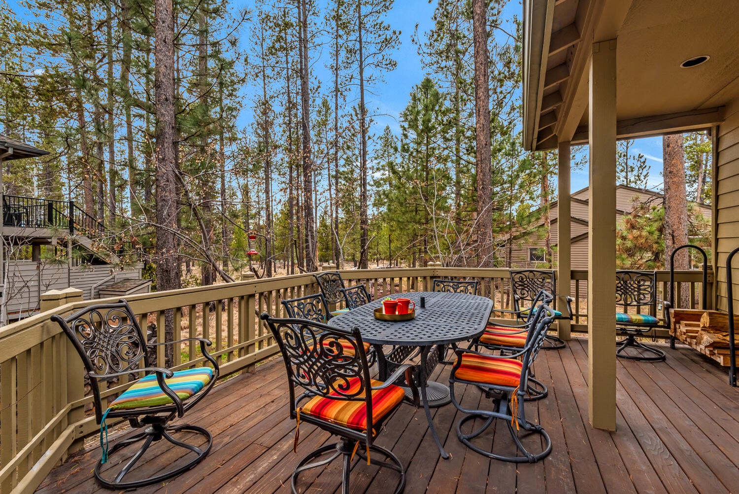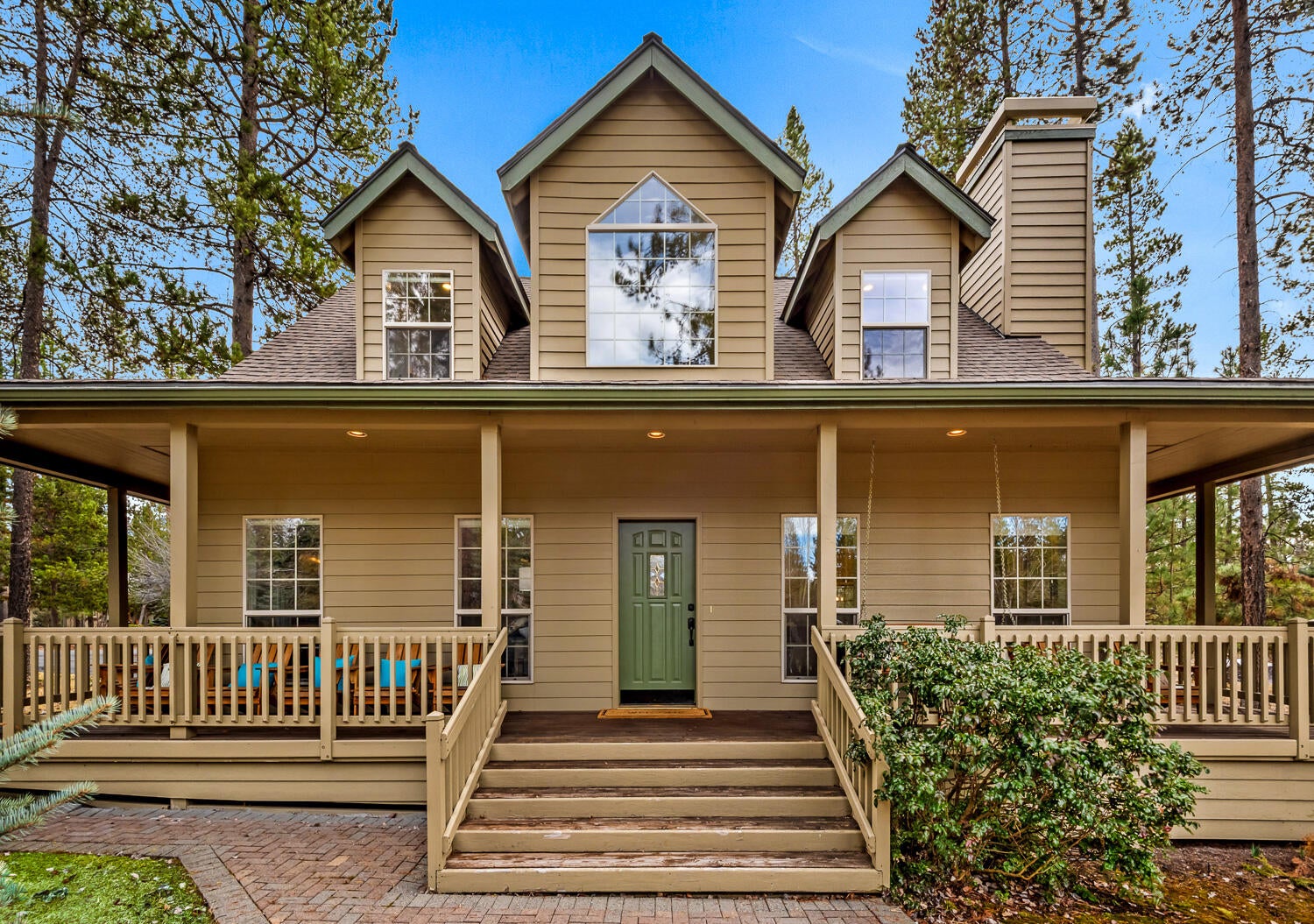 Charming, well-maintained home with a wraparound porch, ideally situated on a spacious, beautifully landscaped corner lot in Sunriver. The inviting living room features a cozy wood-burning fireplace and hardwood floors that extend through the living, kitchen and dining areas. The nicely remodeled kitchen offers a breakfast bar and sunny nook with bay window. Main level primary suite includes a gas fireplace, separate tub and shower, and marble tile flooring. Upstairs bedrooms feature dormers and built-in bunk beds, plus a bonus room with vaulted wood ceiling and gas stove. Enjoy outdoor living on the private deck with hot tub, surrounded by peaceful natural setting. Close to golf, SHARC, trails, parks, dining and The Village. Ideal as a vacation rental, second home or full-time residence.
