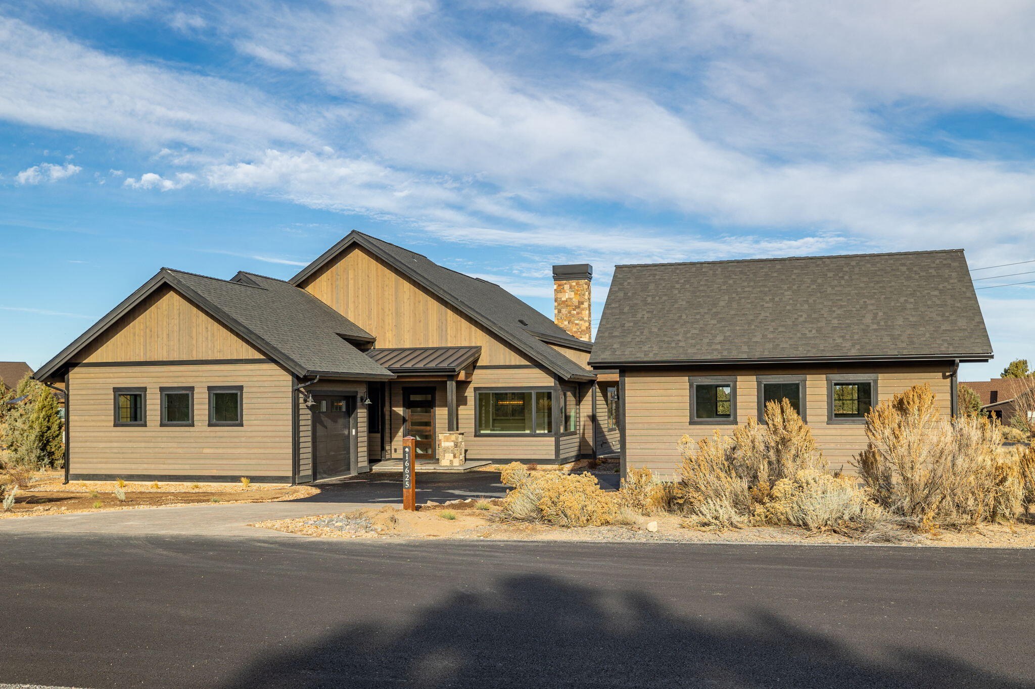 Nestled in the high-desert landscape of Brasada Ranch, this 2968 sqft custom home offers luxury living. The kitchen is a chefs dream with stainless appliances, including a 6 burner Thermador 48 range, and a built-in fridge/freezer. An oversized pantry with a barn door adds to the convenience, with room for a second fridge. Quartz countertops throughout the home, including a waterfall island with a built-in table, exemplify modern luxury. The formal dining area includes built-ins, and a butlers pantry with a wine fridge. The primary suite features a tile shower, two vanities, space for a stacking washer/dryer, walk-in closet, and a soaking tub. Unique to this home are the high end black Milgard fiberglass windows, a gorgeous laundry room, a junior suite, a built-in bench by the owners entrance, hardwood floors, Montana mossy rock, tile and wood accent walls, 8 solid stained fir interior doors, and custom cabinetry.