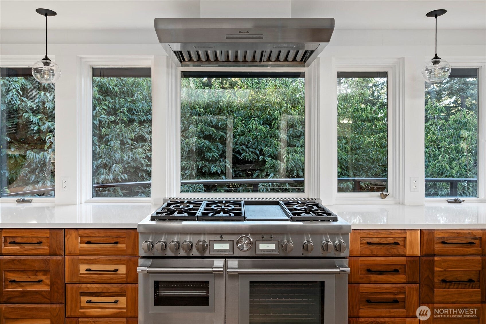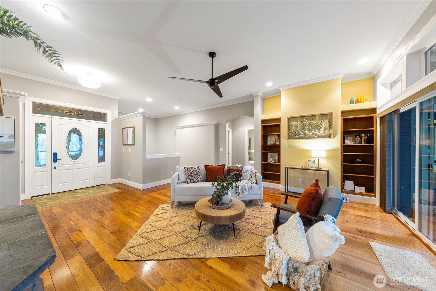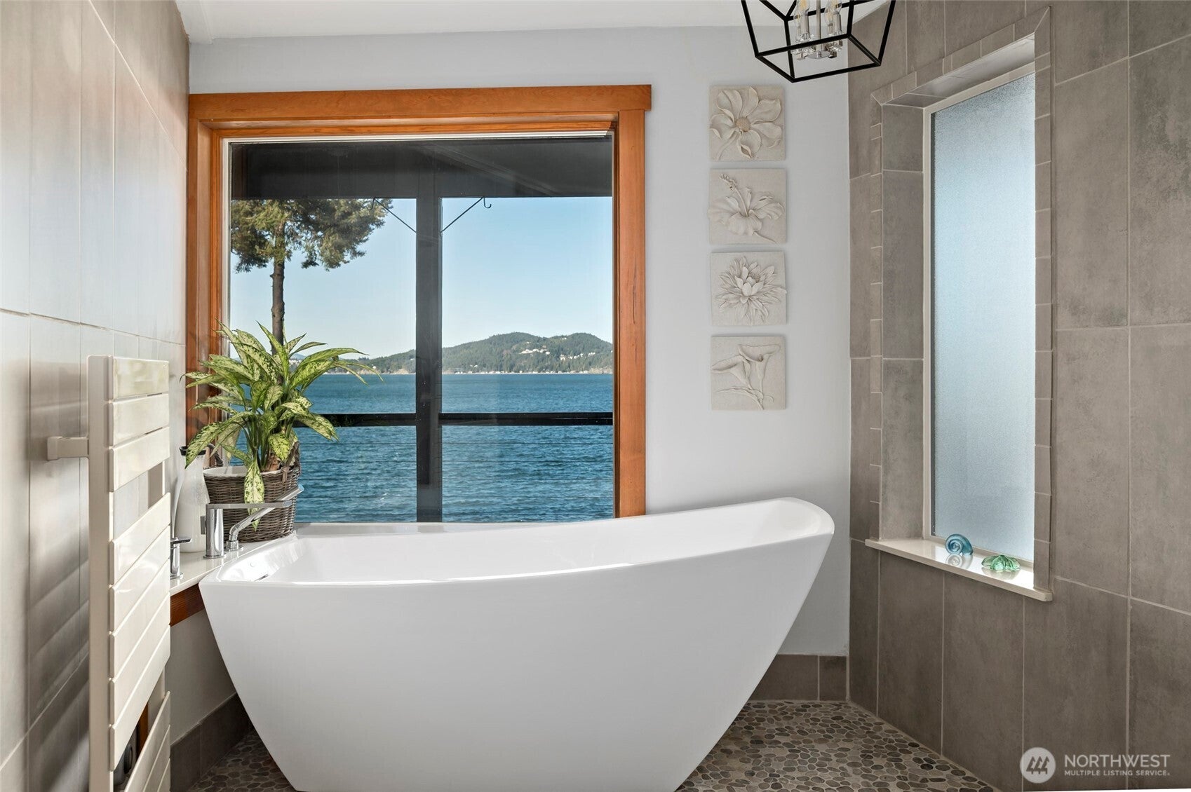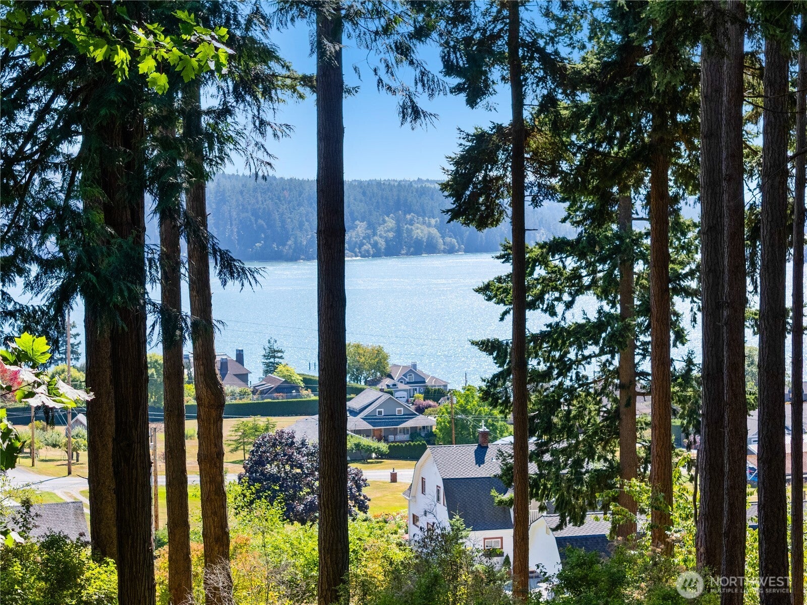 Nestled in a private, gated, tree-lined setting with breathtaking water views, this beautifully maintained home offers a seamless blend of tranquility and modern comfort. The expansive property features lush landscaping and detached outbuildingsincluding a 30x70 plumbed shop with two levels of workspace, ideal for an in-law setup, workshop, or additional living space. Inside, a bright open-concept design is filled with natural light and showcases stunning water views from nearly every angle. The updated kitchen offers sleek cabinetry, ample counter space, and a large island perfect for entertaining. Oversized windows frame the scenery, creating a strong connection to the outdoors, while an in-home elevator adds convenience and accessibility. Step onto the covered deck and unwind in the hot tub while enjoying peaceful, elevated shoreline views. The spacious yard offers room to garden, play, or relax in your own private retreat. Additional highlights include a beautifully appointed primary bath, multiple view-oriented living areas, and a covered outdoor entertaining space for year-round use. The lower level provides flexible space for hobbies, storage, or a home gym, with expansive garage areas for vehicles, tools, and recreational gear. With its distinctive architecture, serene setting, and close proximity to the water, this home is a rare opportunity to experience Pacific Northwest living at its finest. Some photos have been generated by AI.