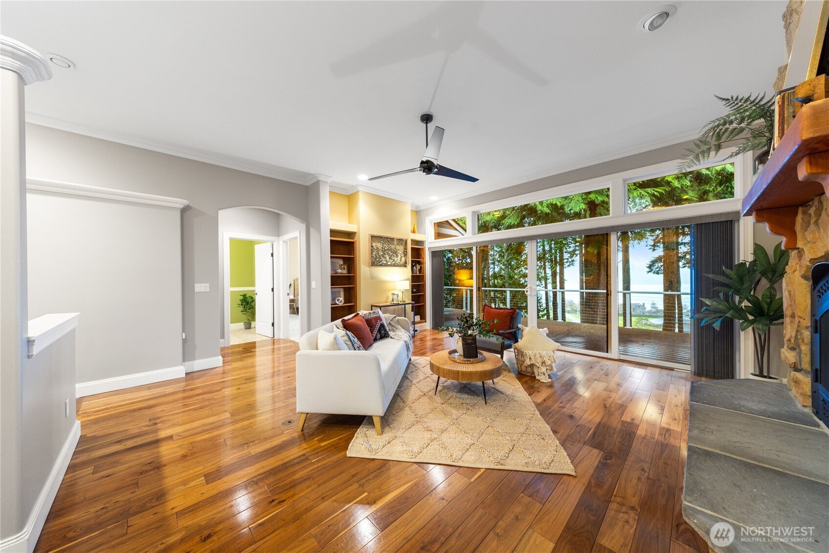 Beautiful custom craftsman home with main level living set on just over 2.5 acres overlooking Fidalgo Bay & the shipping channels! Elegant living room with a double sided gas fireplace & soaring ceilings with walls of windows to capture the water views & private setting.