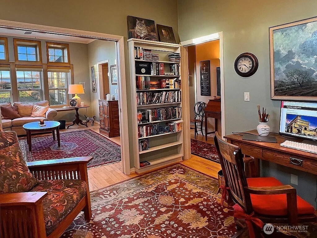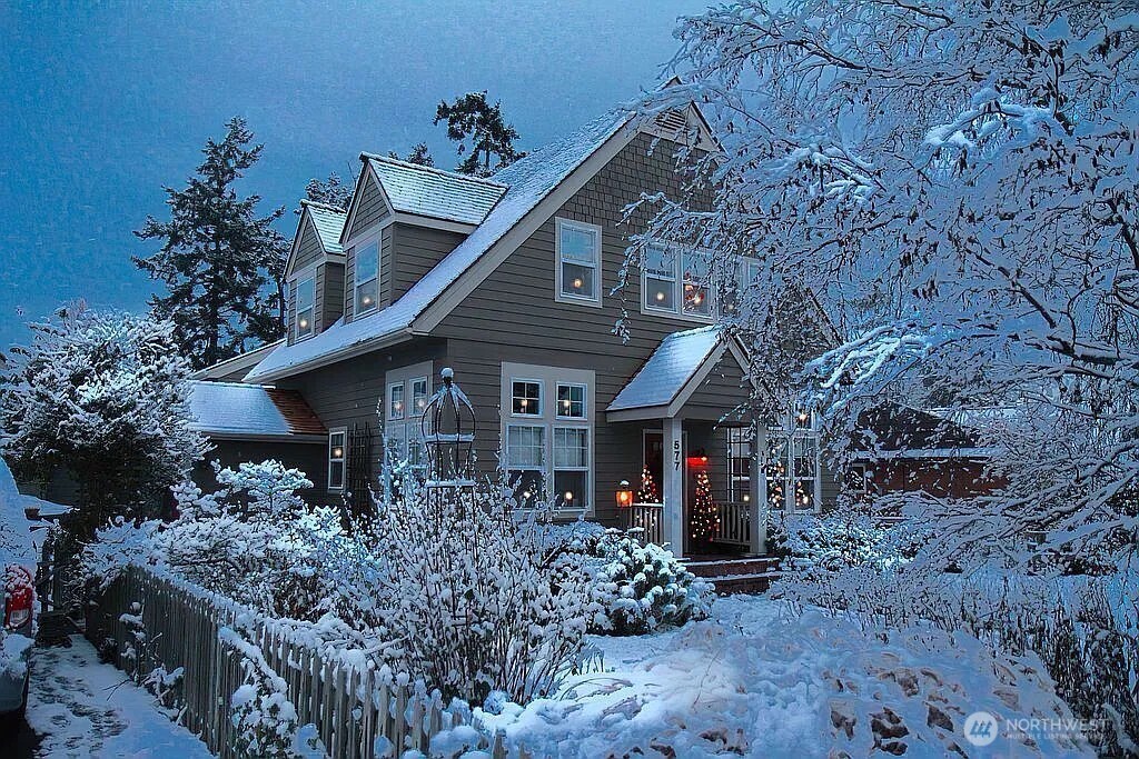 Gorgeous Paradise Setting with 180 Degree Water, Mountain and Glorious Sunset Views Extending from Snow Covered Olympic Mountains to the Canadian Coastal Range of BC. This home features 3 bedrooms, 2 large offices, and 2 full kitchens. The main level offers level entry with water views, a remodeled kitchen with many cabinets, Silestone counters, lower pullout drawers, and walk-in pantry. The open-concept living-dining area includes engineered hickory flooring and a large stone gas fireplace, with three sliding doors opening to a wrap-around deck. The primary suite has bamboo flooring, walk-in closet and updated bath with glass and tile shower. Utility rooms both floors. A second office and utility room are also on the main floor. Downstairs includes a guest suite with jacuzzi bath, second kitchen, slider opens to apron deck, large office, and art display hallway. Exterior highlights include a Mansard roof, 2-car garage with a large parking pad, an attached greenhouse, and a garden area. Theres also a unique cement room under garage ideal for hobbies and storage.