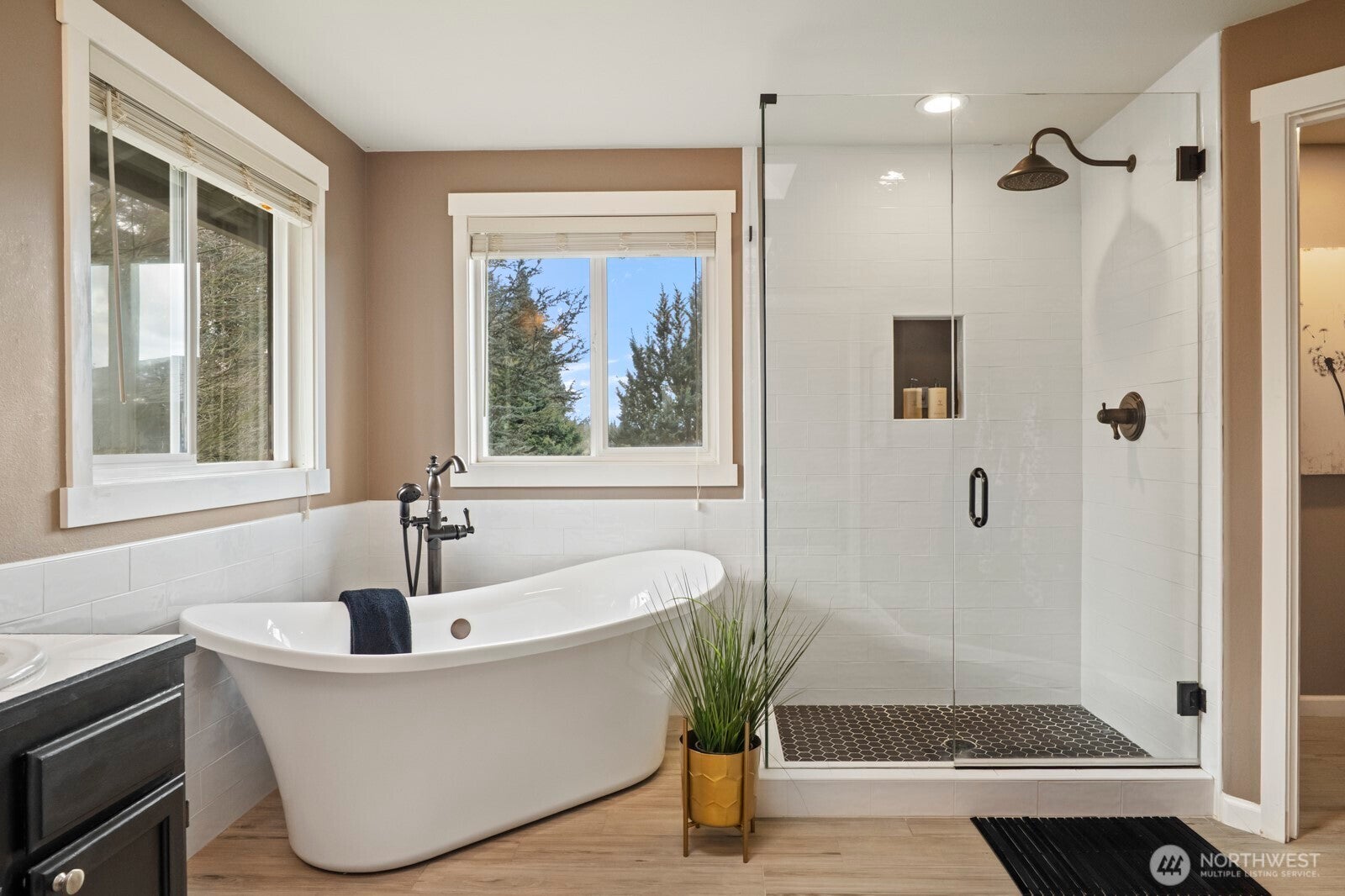 Custom-built contemporary showstopper on 2 serene, private acres just moments from Lost Lake! Impressive craftsmanship & attn to detail shine from the moment you arrive. A covered entry leads you into an open concept main level w/ soaring ceilings, hardwoods, A/C, a 2-story stone centerpiece fireplace & abundant windows looking out to tranquil views of nature. Magazine-worthy kitchen is equipped w/ high-end stainless appliances, quartz counters, subway tile backsplash & a roomy island w/ bar seats to watch the chef at work. Life & light flow effortlessly throughout this hosts dream layout w/ great indoor-outdoor flow out onto a covered deck w/ cedar soffit. Main floor office & bdrm offer great versatile uses. Upstairs, find 3 beds including the luxe primary suite, complete w/ a custom walk-in closet, 5-piece spa bath & a private balcony. Huge upstairs bonus room is set up as an amazing home theater w/ built-ins & floor risers. Enjoy the outdoors year round on the covered deck, in the hot tub, around the fire pit or on the brand new sports court. Raised garden beds await your green thumb. Oversized 3-car garage w/ one 15-foot bay for your RV or boat - a hobbyists dream! Unbelievably quiet and private, yet just a short drive to amenities in Maltby, downtown Snohomish, Woodinville, or Monroe!